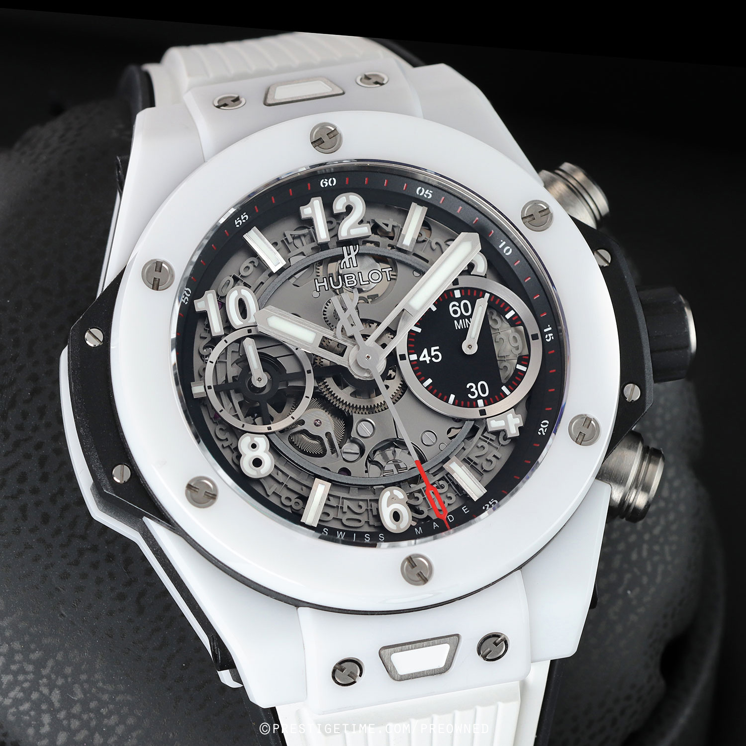 Case: Microblasted white ceramic case & bezel with polished beveled corners. Bezel secured by 6 H-head titanium screws. Black resin lower-bezel ring & lateral case inserts. Sapphire crystal dial showcasing the movement. Brushed hands with luminous fill. Applied hour markers with luminous fill. Black dial flange with minute/seconds track. Skeletonized date wheel, the current date highlighted at 3 o'clock. Small seconds sub-dial at 9 o'clock.