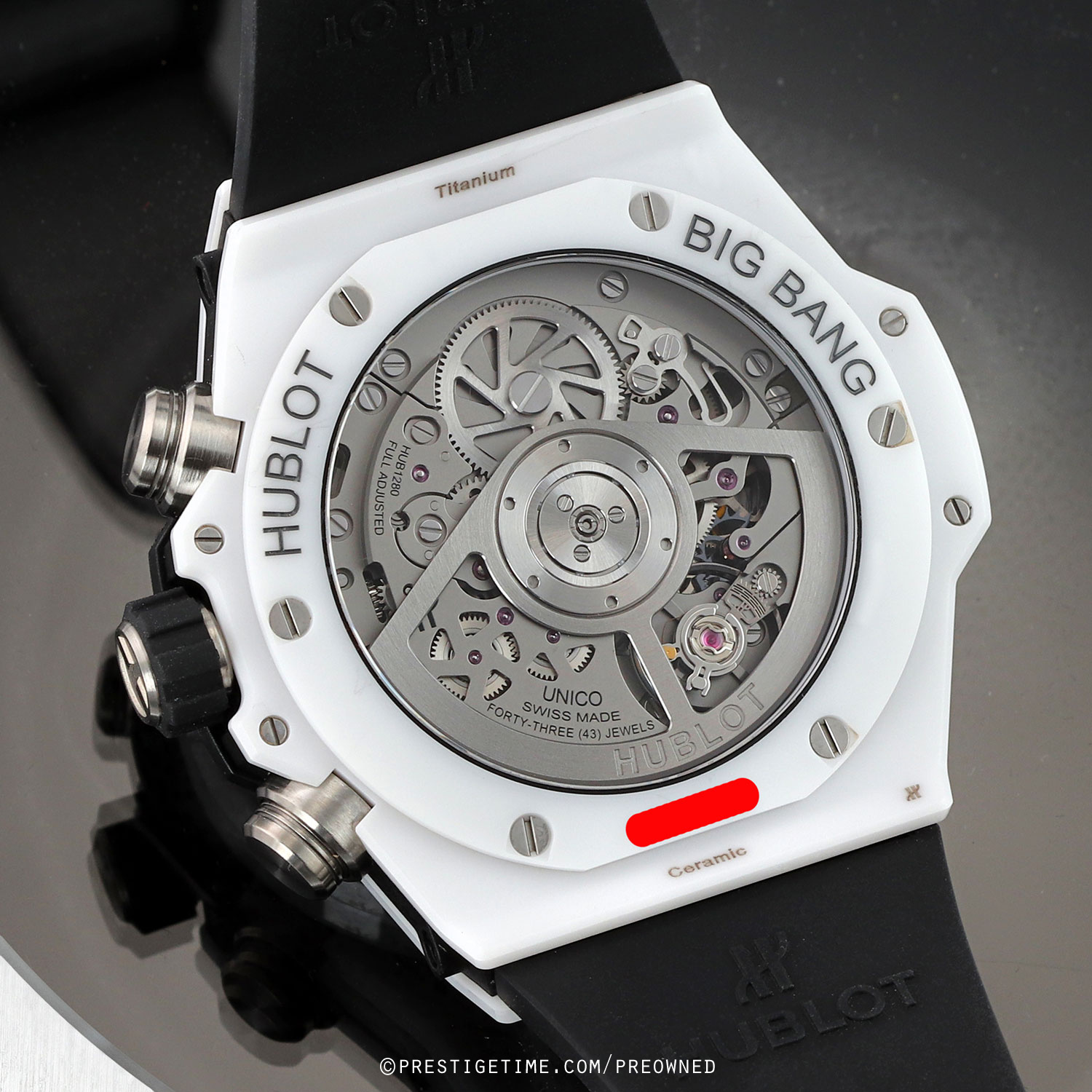 Movement: Powered by an in-house Hublot caliber UNICO HUB1280, which beats at 28,800 vph (4Hz), contains 43 jewels & has a power reserve of +/- 72 hours. Micro-blasted anthracite & ruthenium plated main-plate bridges & rotor. Tungsten rotor.
