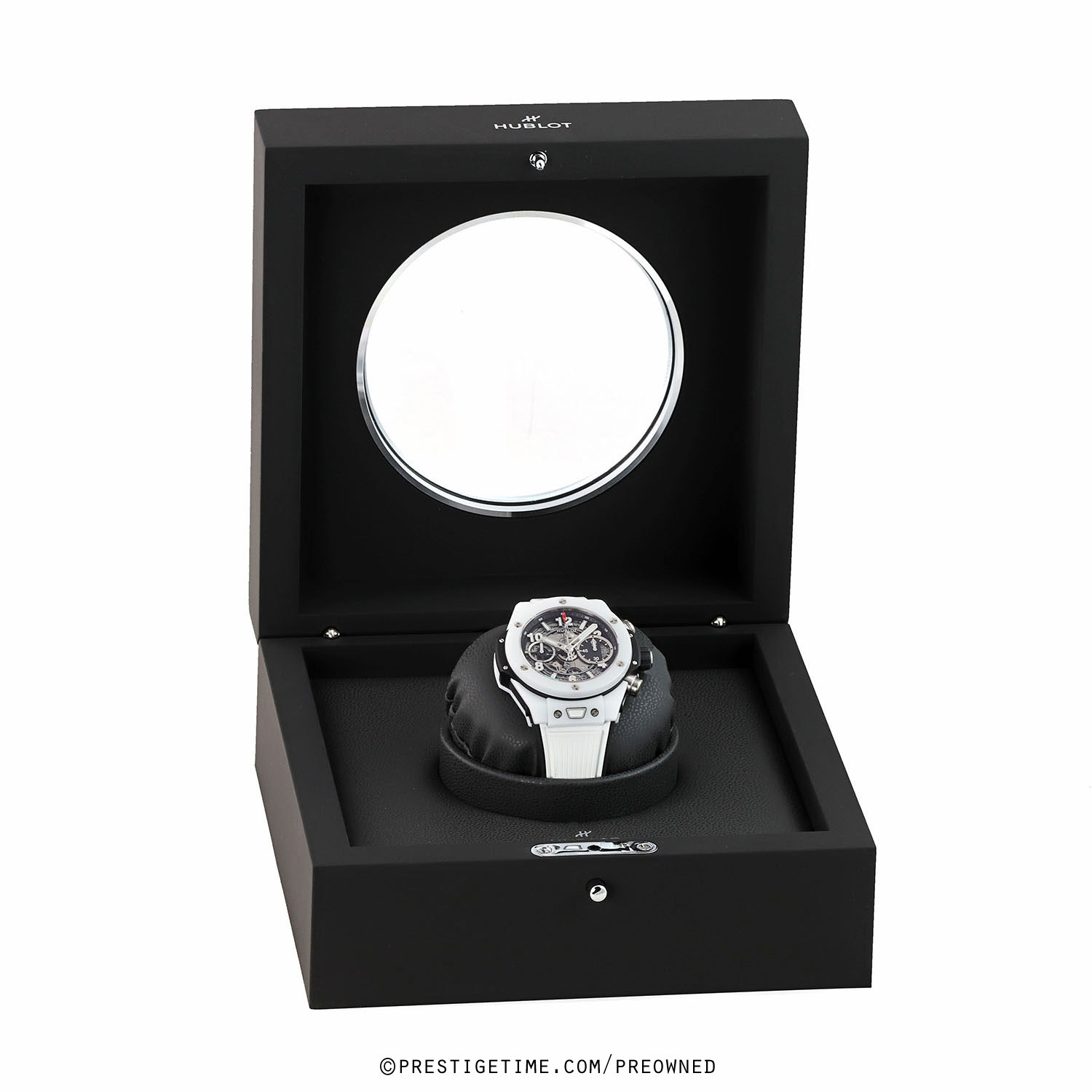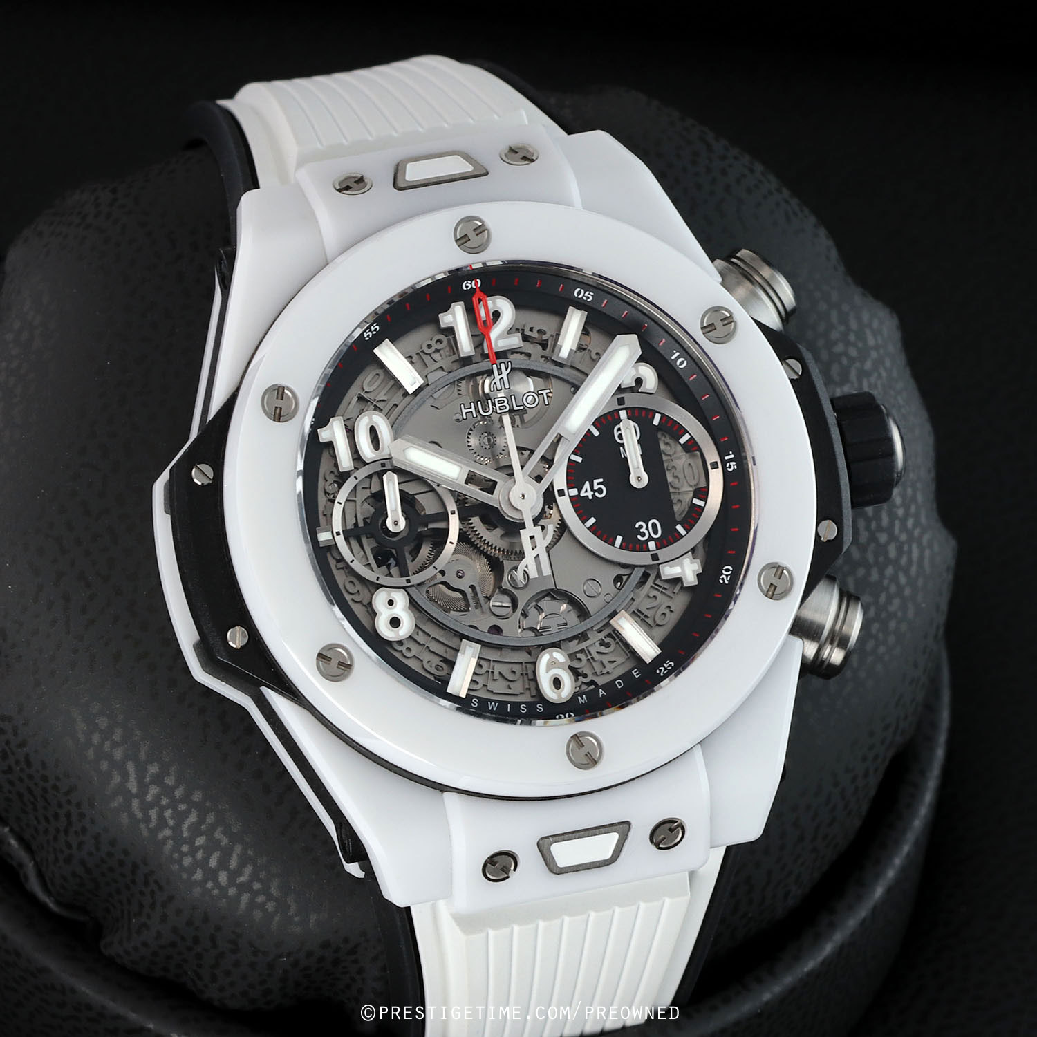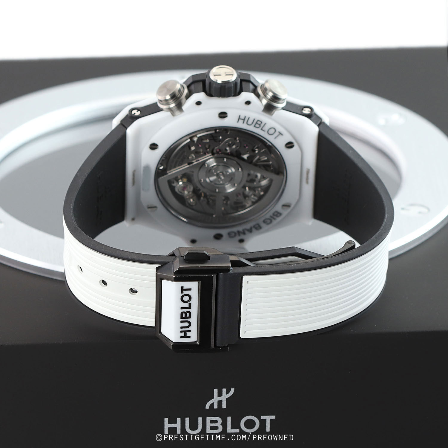 Strap: Straps are easily interchangeable via a unique quick-release push-button system. The buttons are located on the top & bottom central lugs. The watch is fitted on its original white rubber strap with black lining and a push-button deployant buckle.