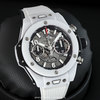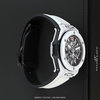 Case: Microblasted white ceramic case & bezel with polished beveled corners. Bezel secured by 6 H-head titanium screws. Black resin lower-bezel ring & lateral case inserts. Sapphire crystal dial showcasing the movement. Brushed hands with luminous fill. Applied hour markers with luminous fill. Black dial flange with minute/seconds track. Skeletonized date wheel, the current date highlighted at 3 o'clock. Small seconds sub-dial at 9 o'clock.