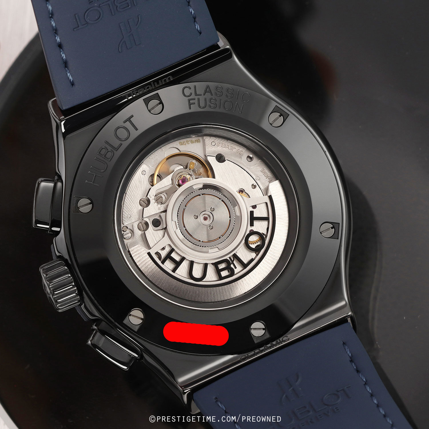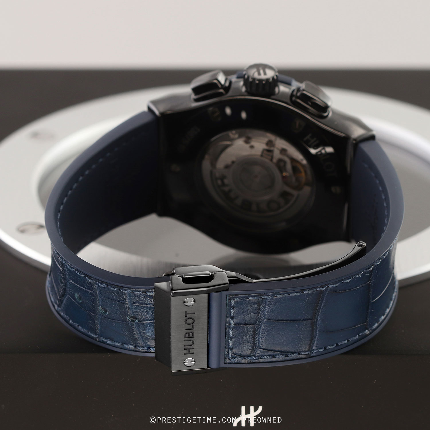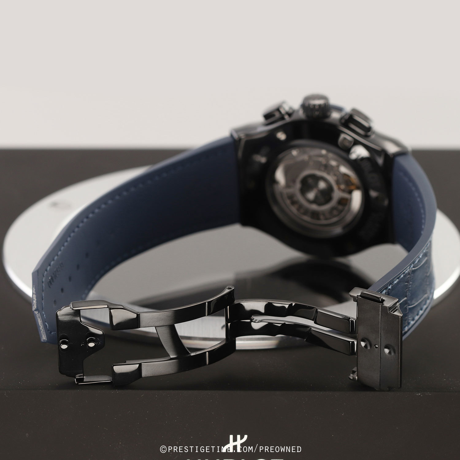 Strap: Fitted on its Hublot original blue gummy-alligator strap (alligator leather top & rubber lining) with a black DLC coated titanium & polished black ceramic push-button deployant buckle. The strap is in excellent condition with the majority of its lifespan remaining we would rate the strap in 95% overall condition.