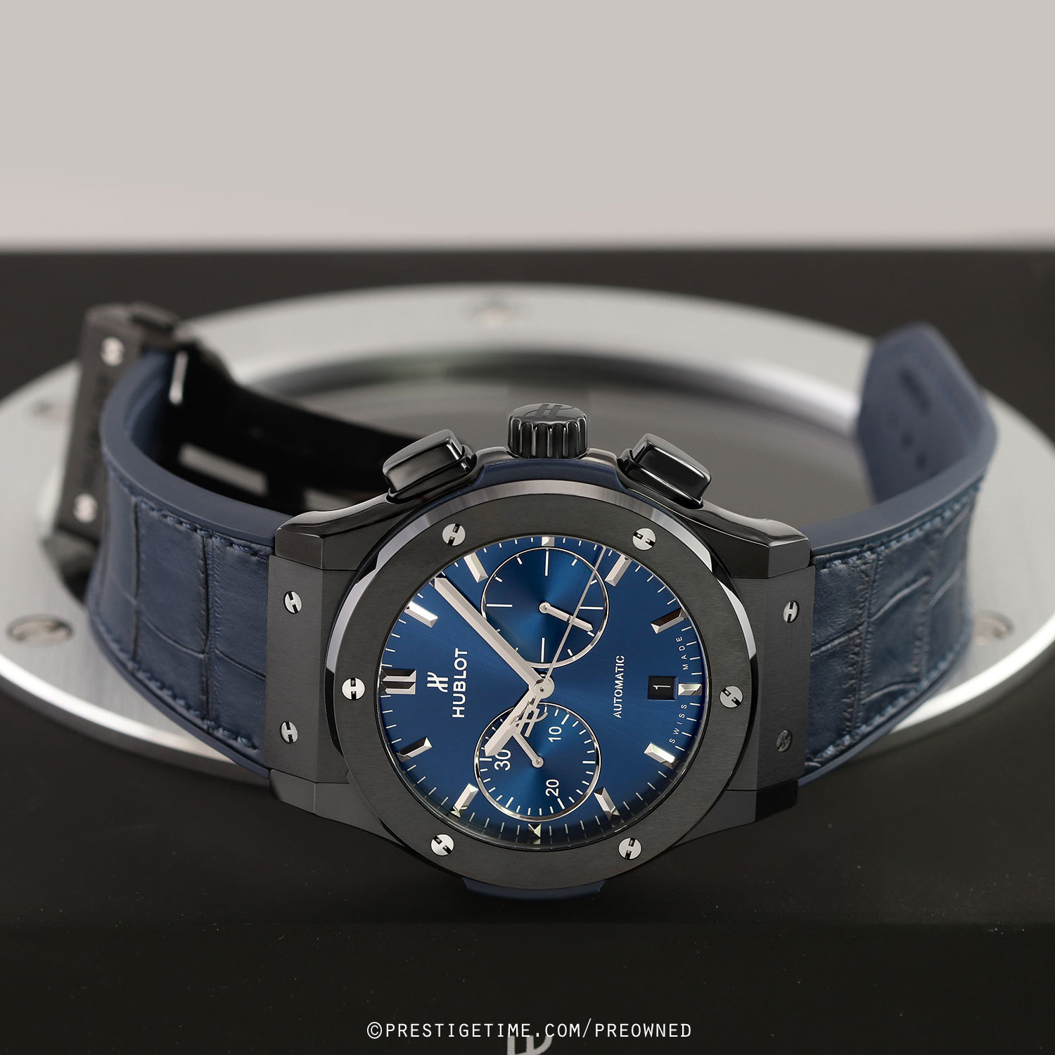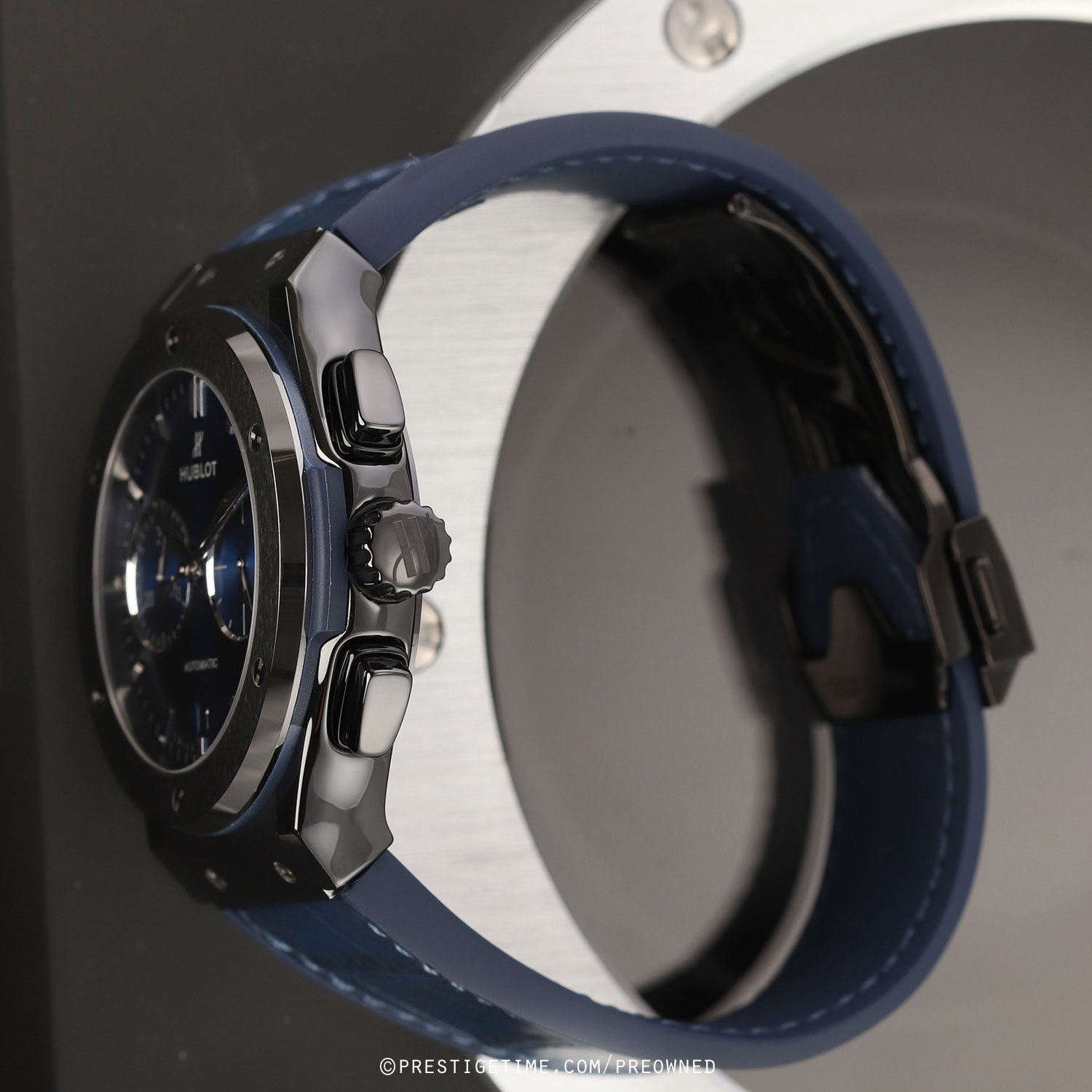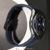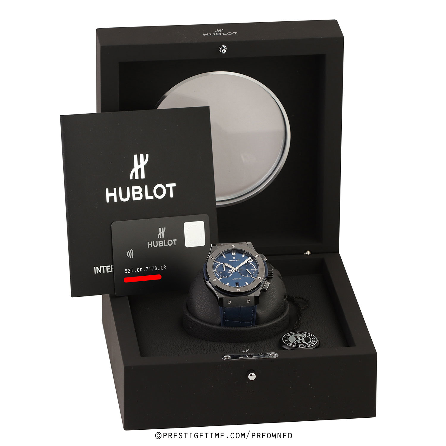 Strap: Fitted on its Hublot original blue gummy-alligator strap (alligator leather top & rubber lining) with a black DLC coated titanium & polished black ceramic push-button deployant buckle. The strap is in excellent condition with the majority of its lifespan remaining we would rate the strap in 95% overall condition.