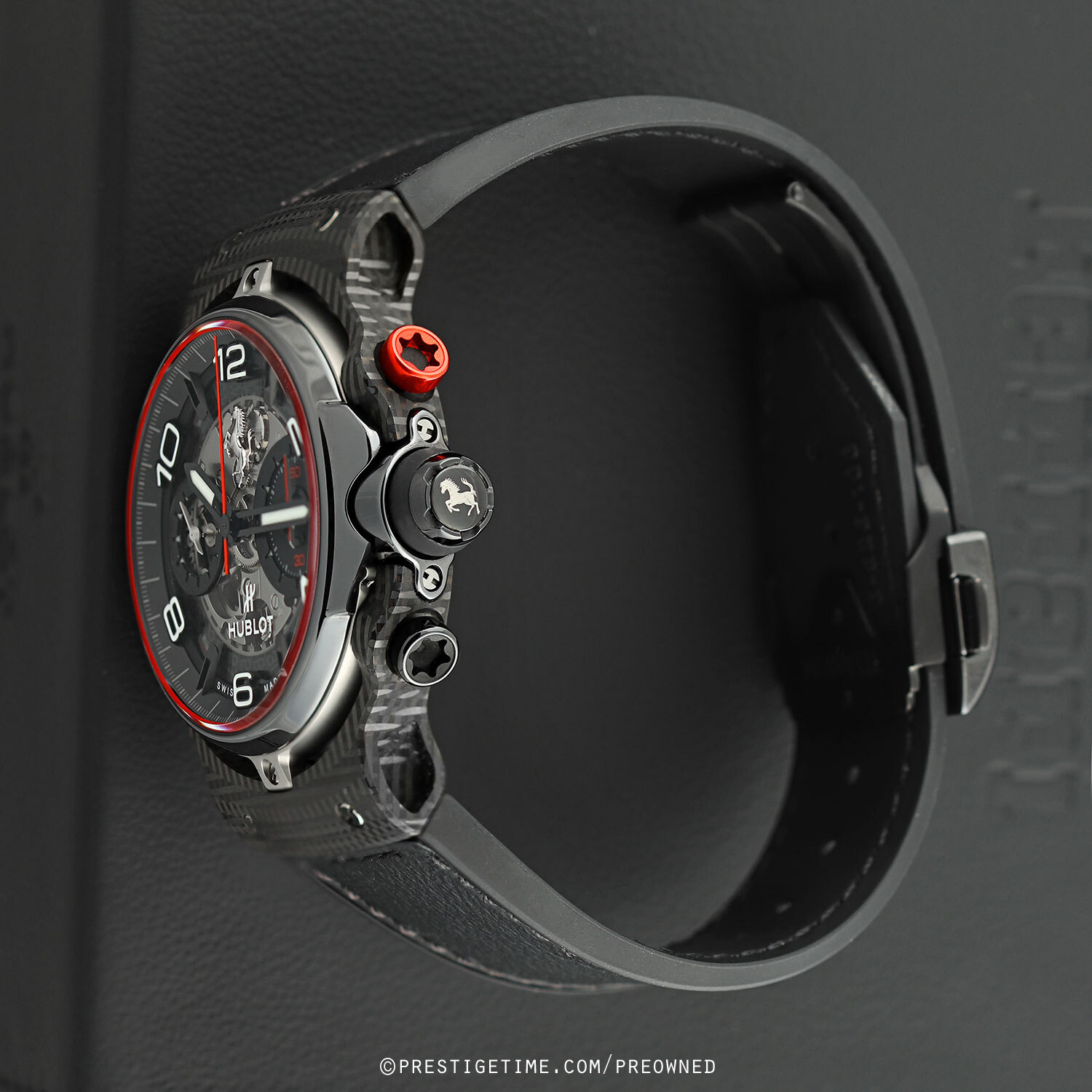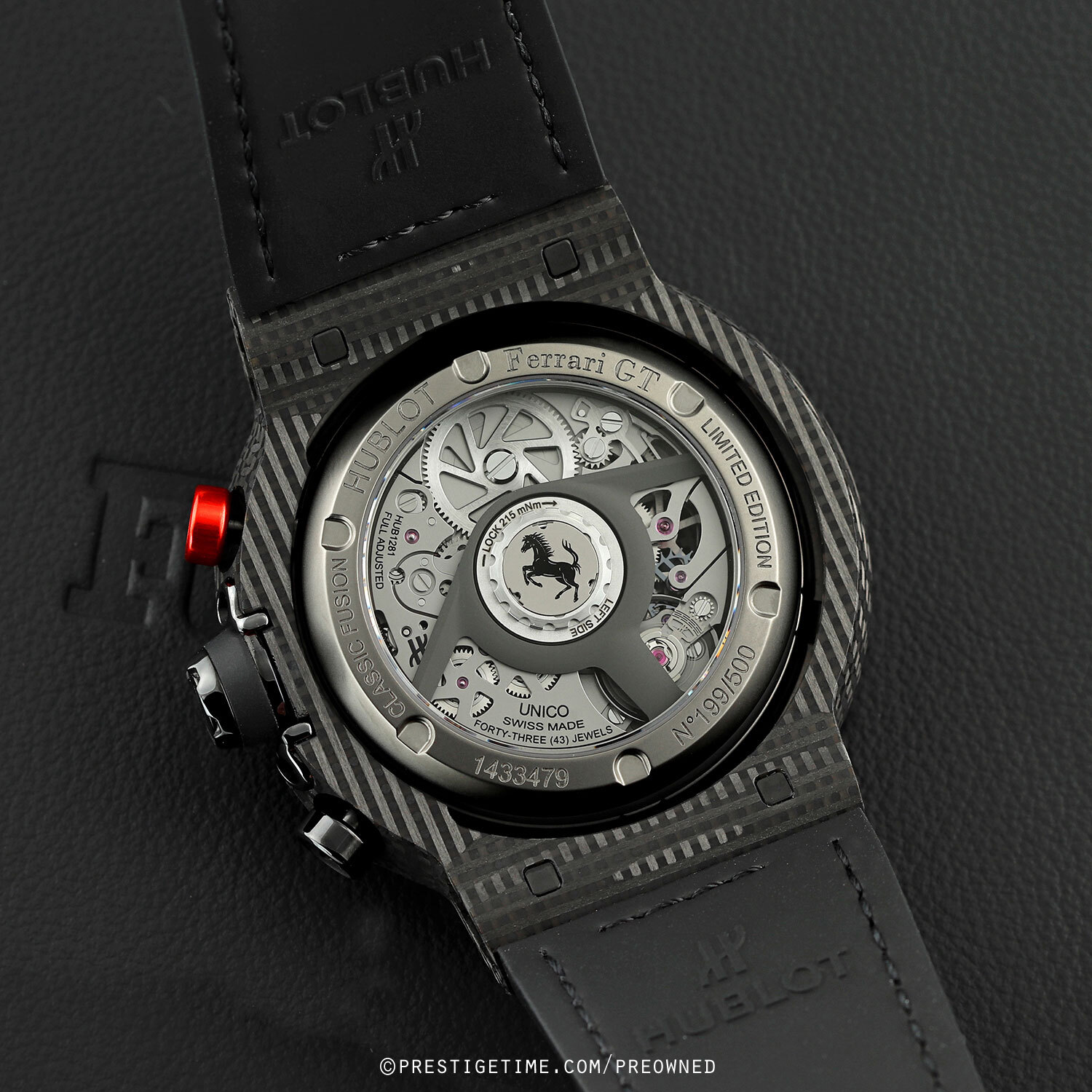 Limited & numbered edition of 500 pieces. this watch is # 199/500. The Hublot Classic Fusion Ferrari GT features the famous Prancing Horse at 12 o’clock & on the center of the rotor.