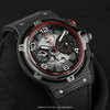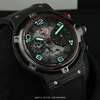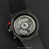 Case: Black ceramic case & black carbon-fiber frame. Skelton dial. Blackened hour & minute hands with luminous fill. Applied black index & luminous filled numeral hour markers. Black dial flange with fine printed minutes/seconds & fractions of a second track. Small seconds sub-dial at 9 o'clock. Date window slightly offset at 3 o'clock.