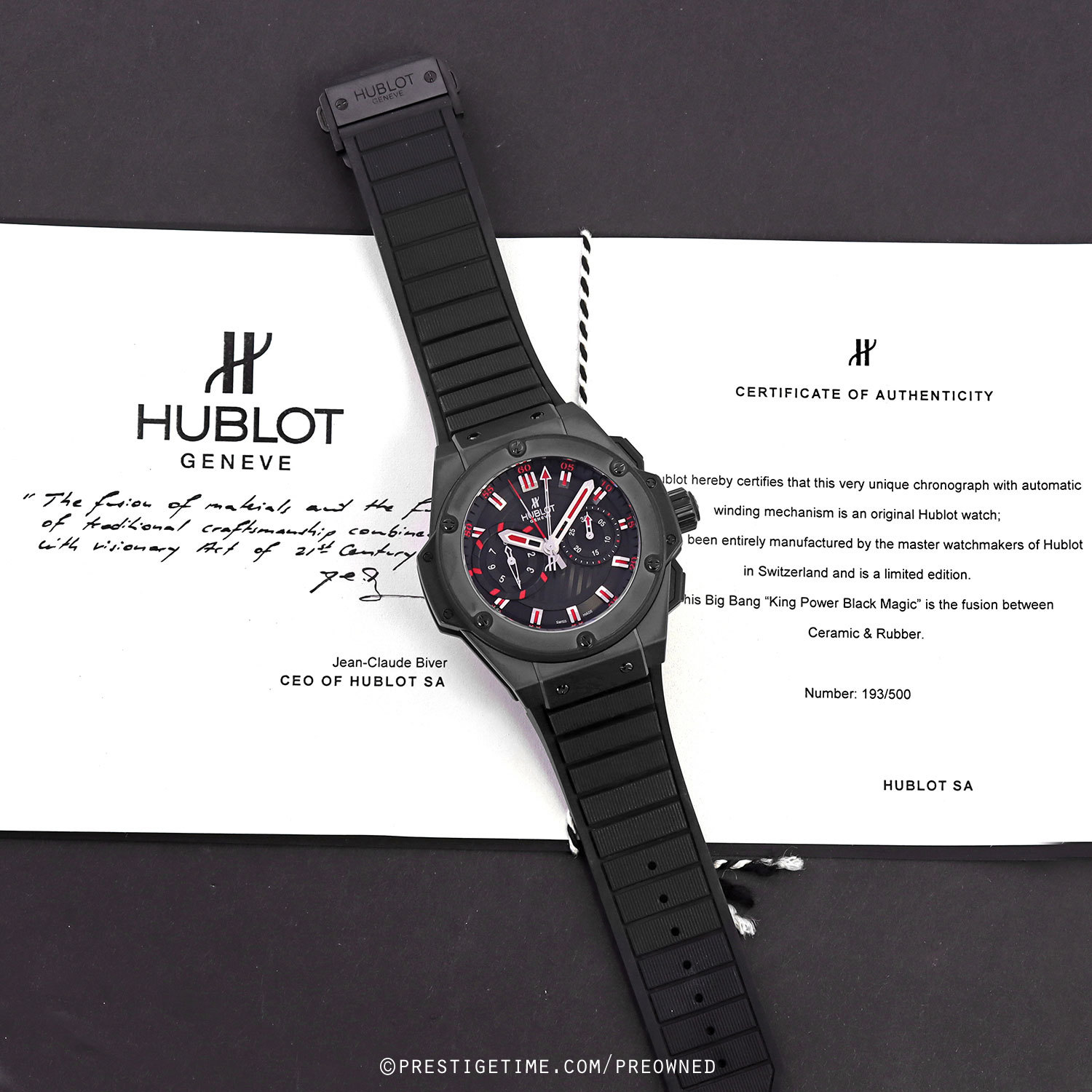 Condition: In excellent near-new condition. The watch came back from a complete factory (Hublot USA) service in June 2022 & has not be worn since. We would rate this watch in an overall 97%+ condition. Delivered in its original box with all papers, and its original limited edition certificate included.
