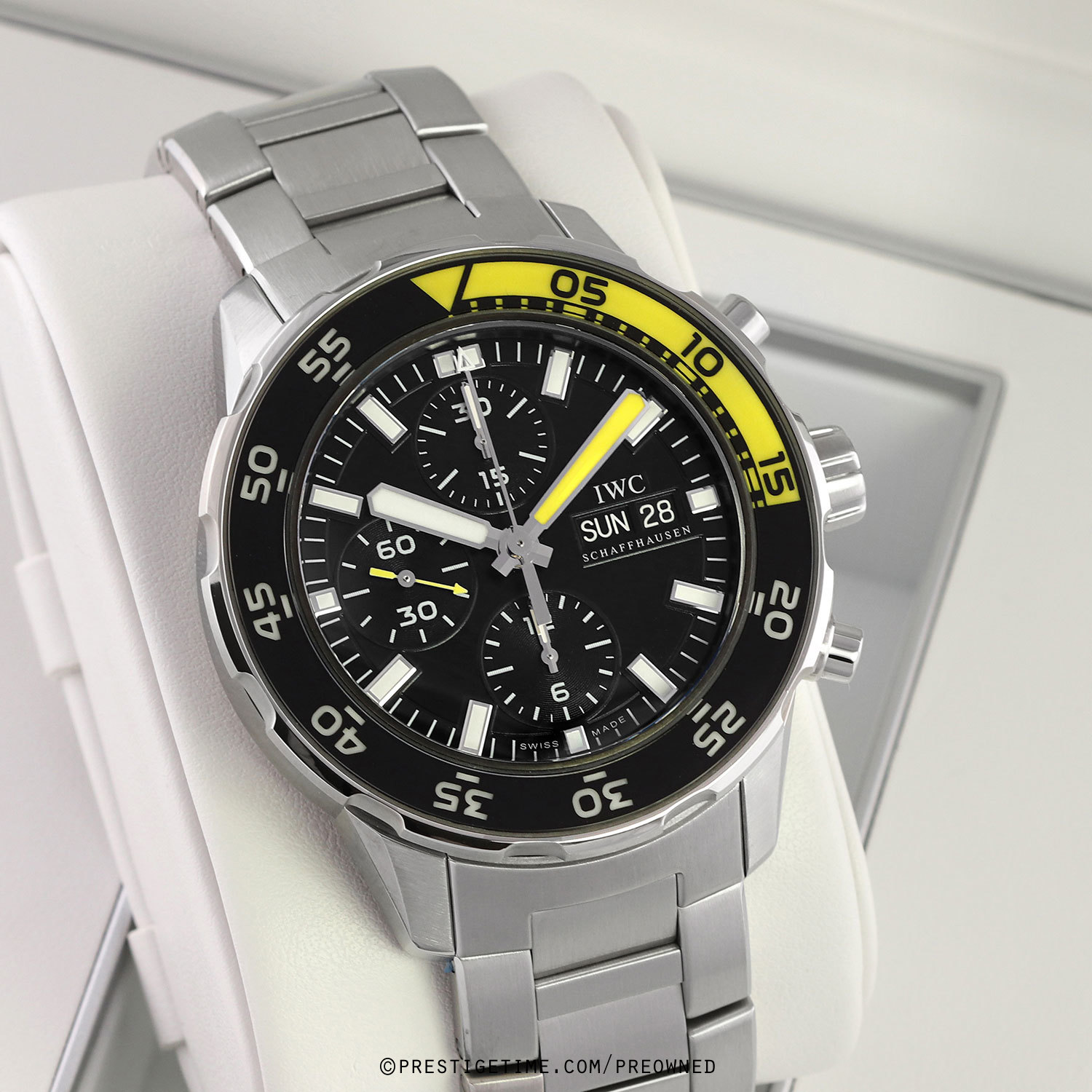 Case: Brushed stainless steel case with polished beveled corners. Brushed & polished stainless steel bezel with black bezel ring featuring yellow luminous 15 minute zone & white luminous indications. Black dial & sub-dials. Polished hands, the hour & minute hands with luminous fill. Applied index hour markers with luminous fill. Fine printed minute/seconds track. Day & date windows at 3 o'clock.