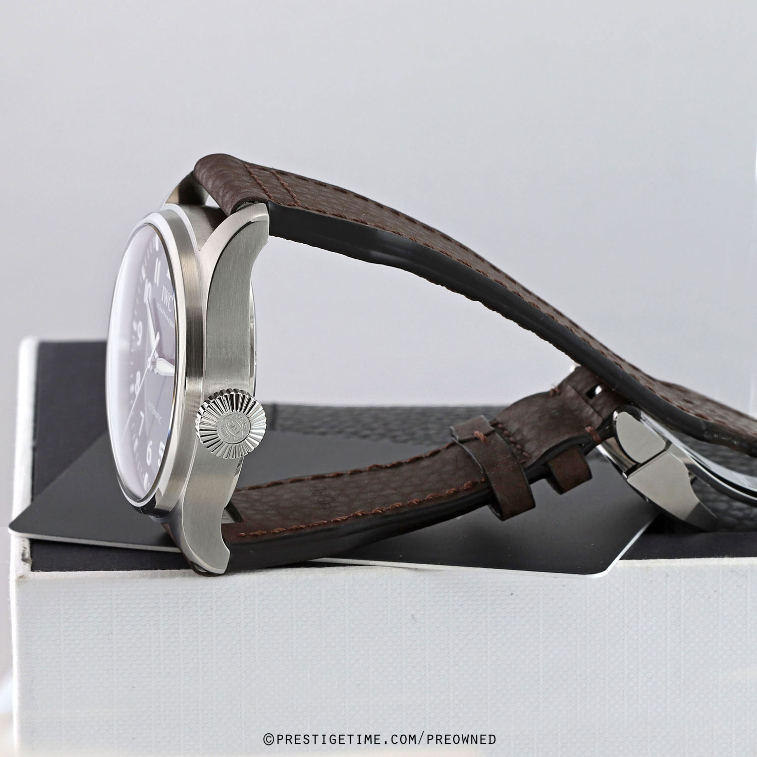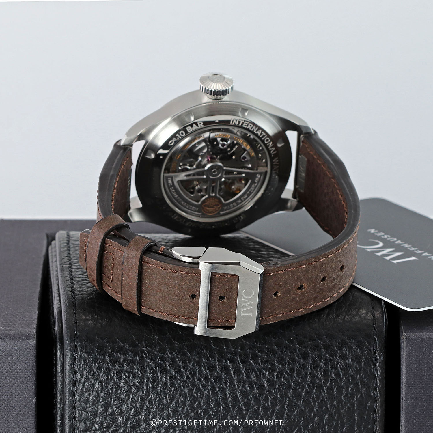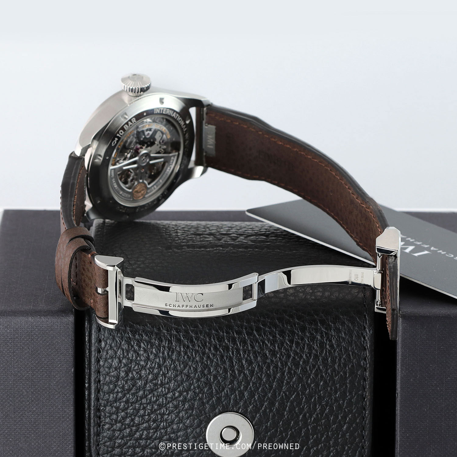 - Fitted on an IWC brown calfskin black calfskin leather strap with a stainless steel deployant buckle. This strap is in excellent near new condition with the vast majority of its wear lifespan remaining. We would be comfortable rating the strap in 98% condition.