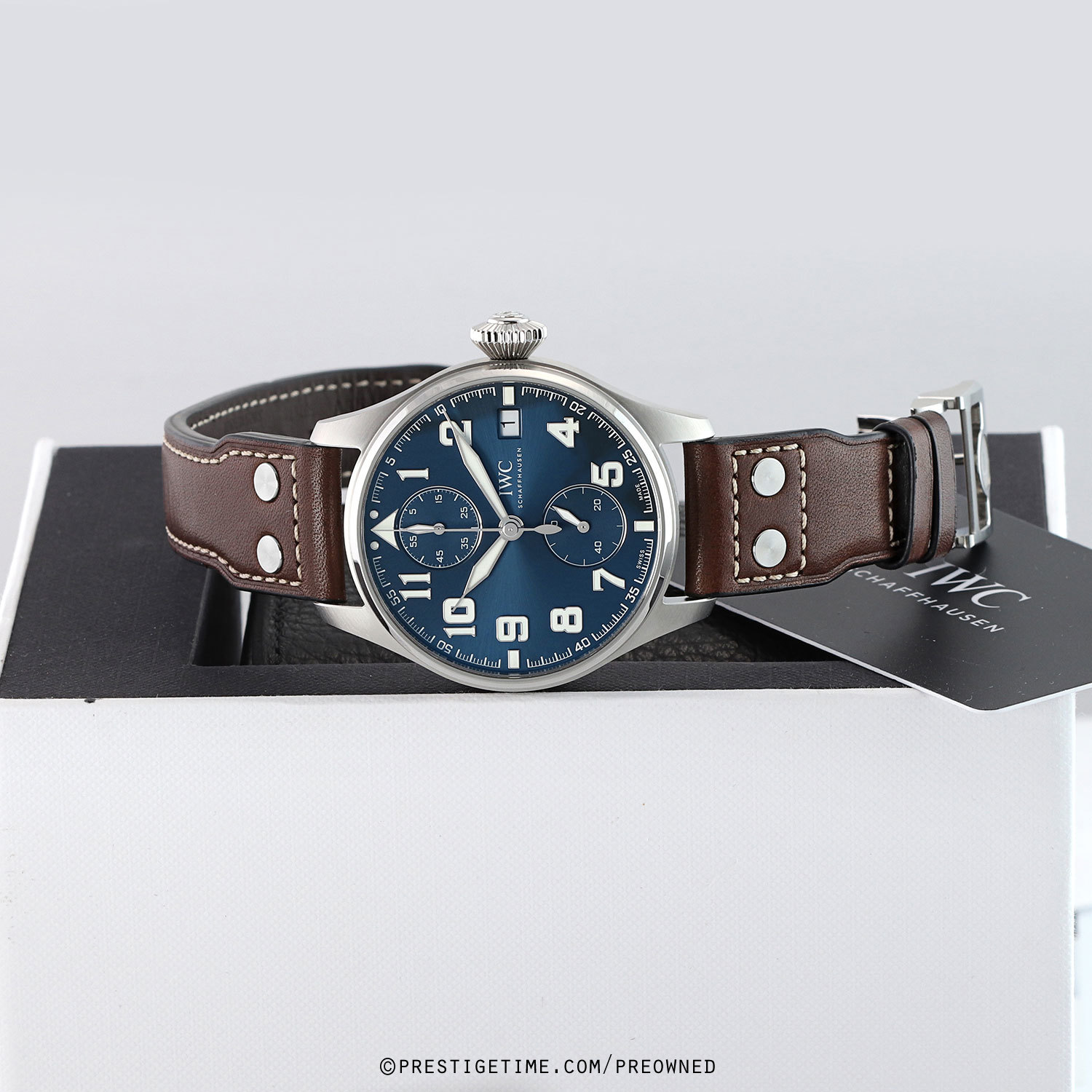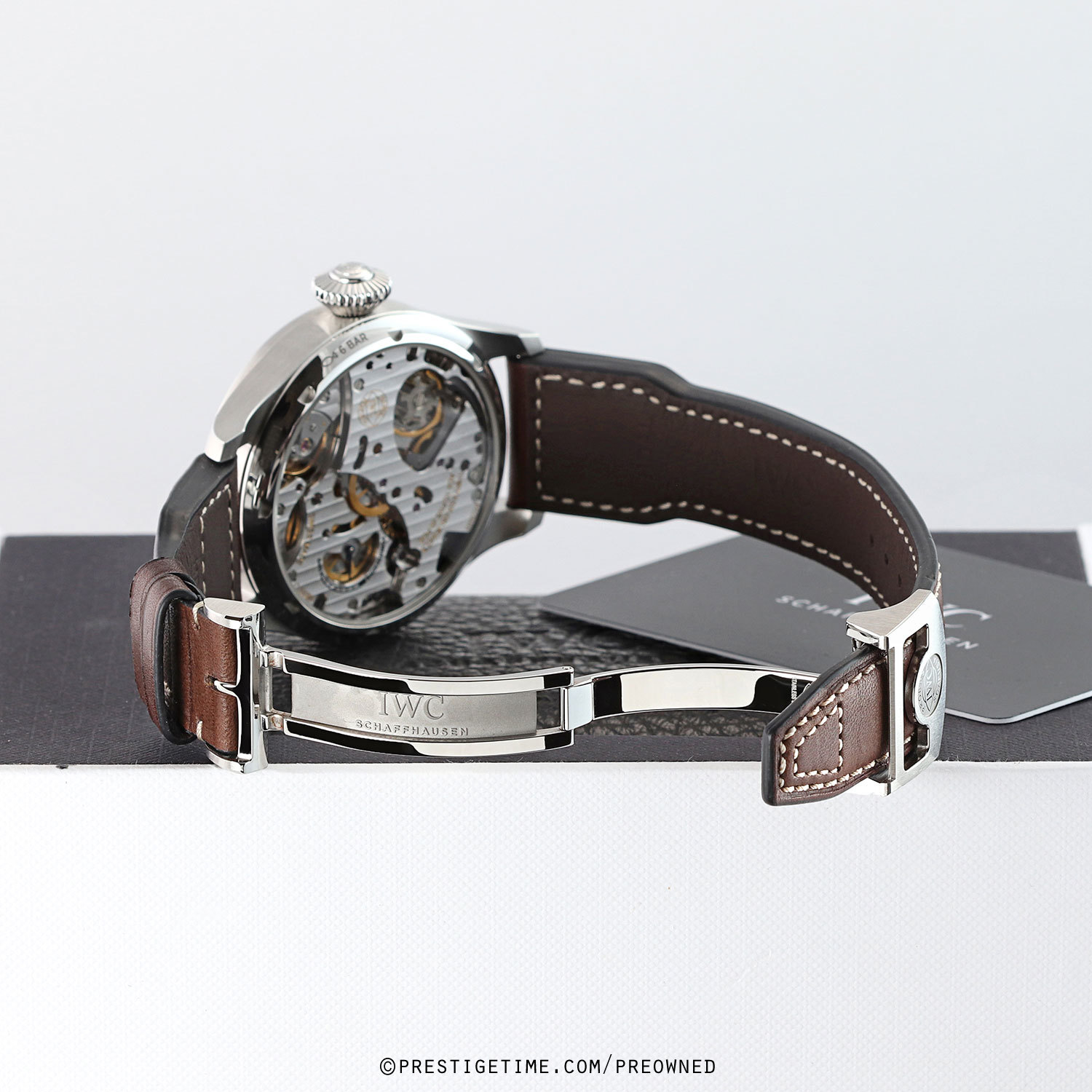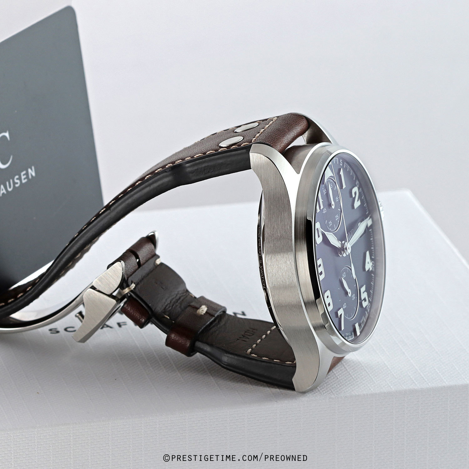Straps: Fitted with Its original IWC riveted, pilot style, brown calfskin leather strap with a stainless steel deployant buckle. The strap is excellent near-new condition with the majority of its wear lifespan remaining. We would rate this strap in 96% overall condition.