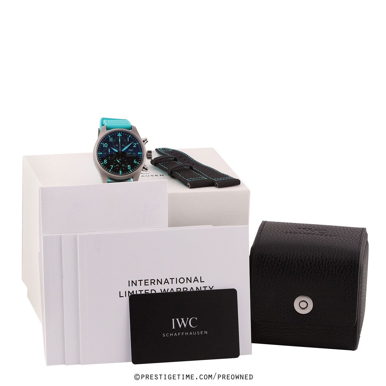 - Delivered with an additional IWC original black calfskin leather strap featuring a carbon-fiber effect & matched with Petronas-green colored stitching. The strap is brand new & unworn with its complete wear lifespan remaining.