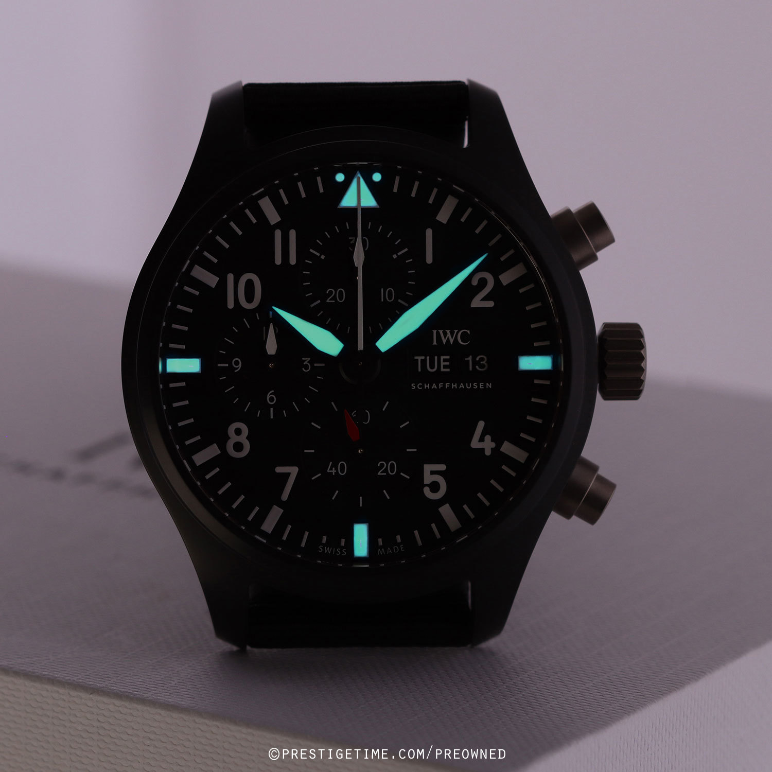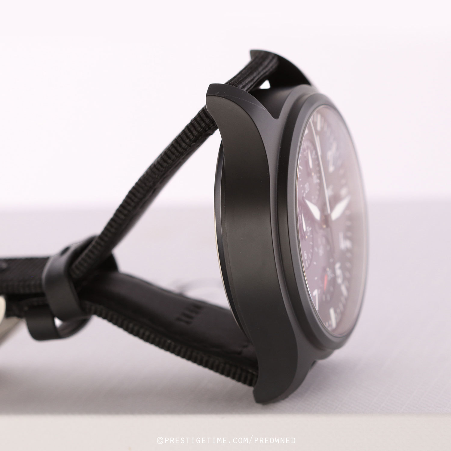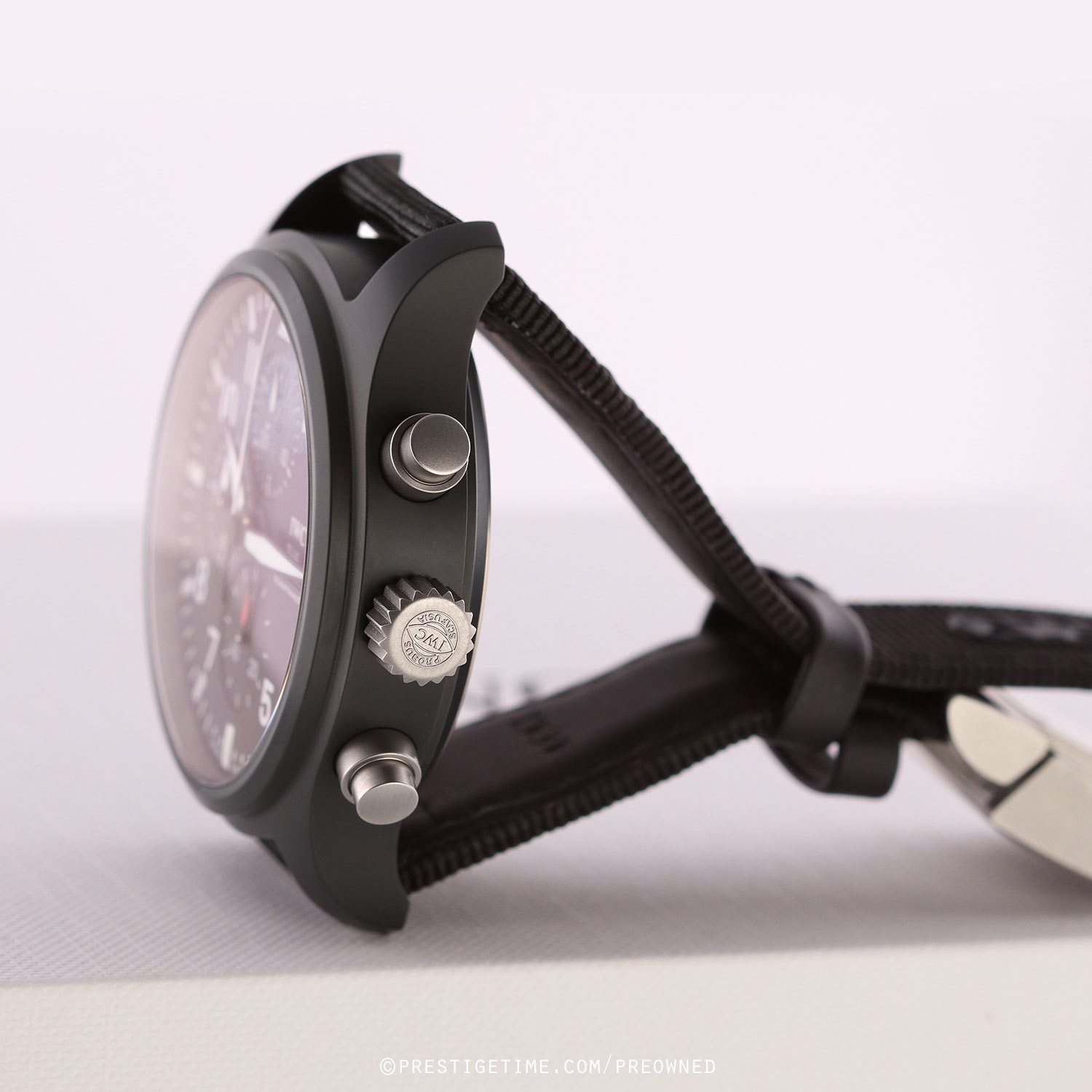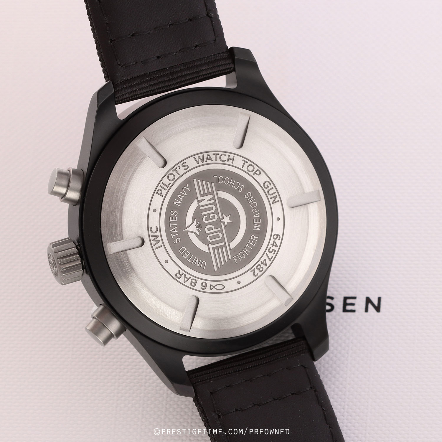 The Pilot’s Watch Chronograph Top Gun the titanium case back features an engraving of the TOP GUN patch.