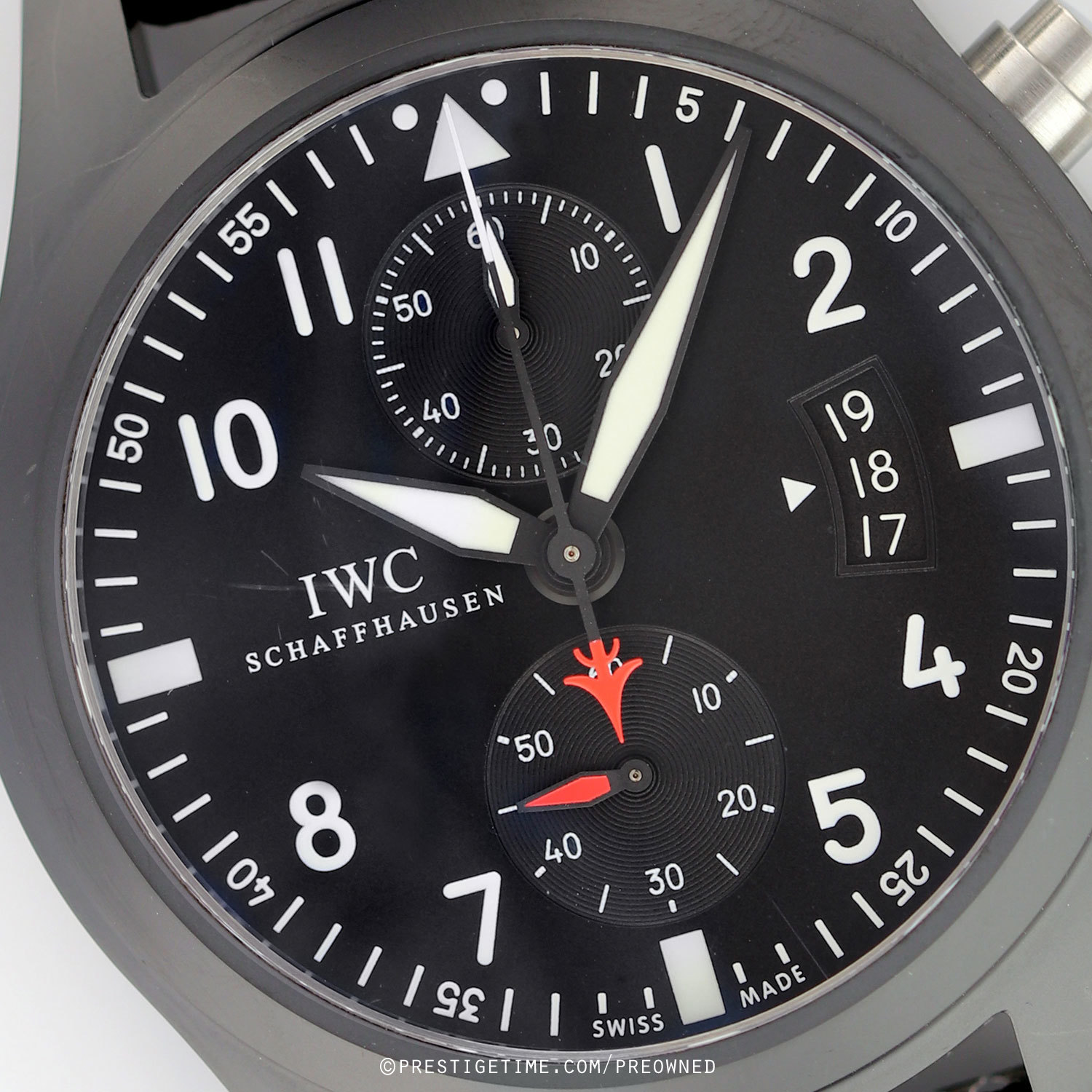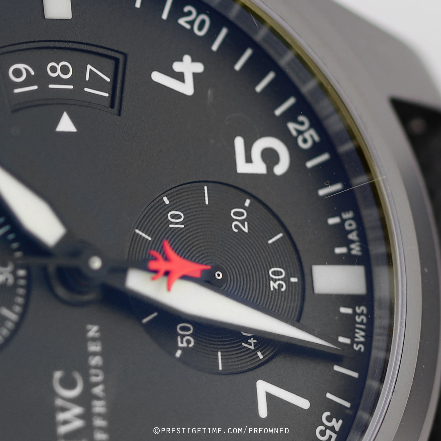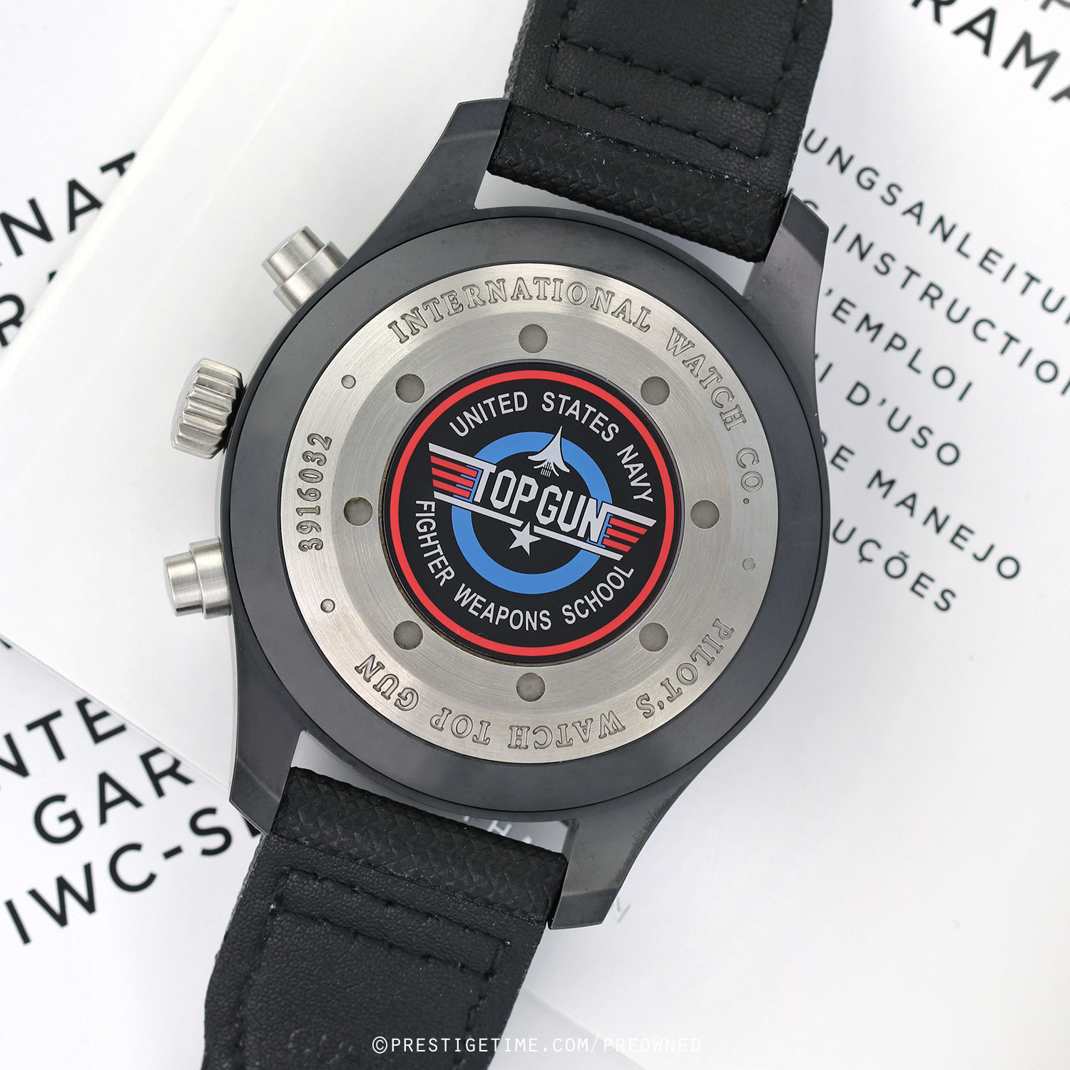 Case: Matte black ceramic case. Titanium crown & chrono buttons. Black dial. A combination of bold Arabic numeral & index hour markers, the 12/3/6 & 9 markers are luminous index hour markers. Printed minute/seconds track. Blackened steel hands, the hour & minute hands with luminous fill. Small seconds sub-dial at 6 o'clock. Elongated date window at 3 o'clock. Chronograph: Flyback function allows instant restarting of the stopwatch with a single push of the button rather than having to stop, reset & then restart the stopwatch. Large, luminous tipped, central hand seconds counter with a red counterweight which resembles the silhouette of a jet. 60 minute sub-dial counter at 12 o'clock. The case back is engraved & color filled with the TOP-GUN logo & UNITED STATES NAVY - FIGHTER WEAPONS SCHOOL.