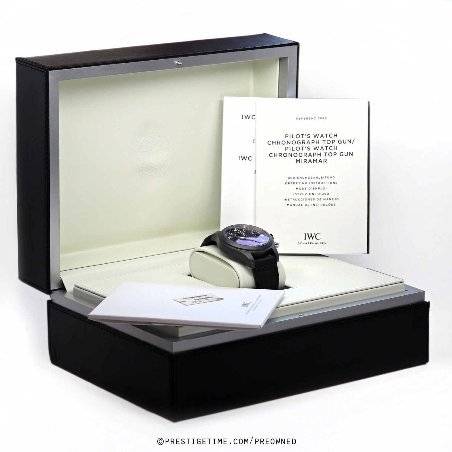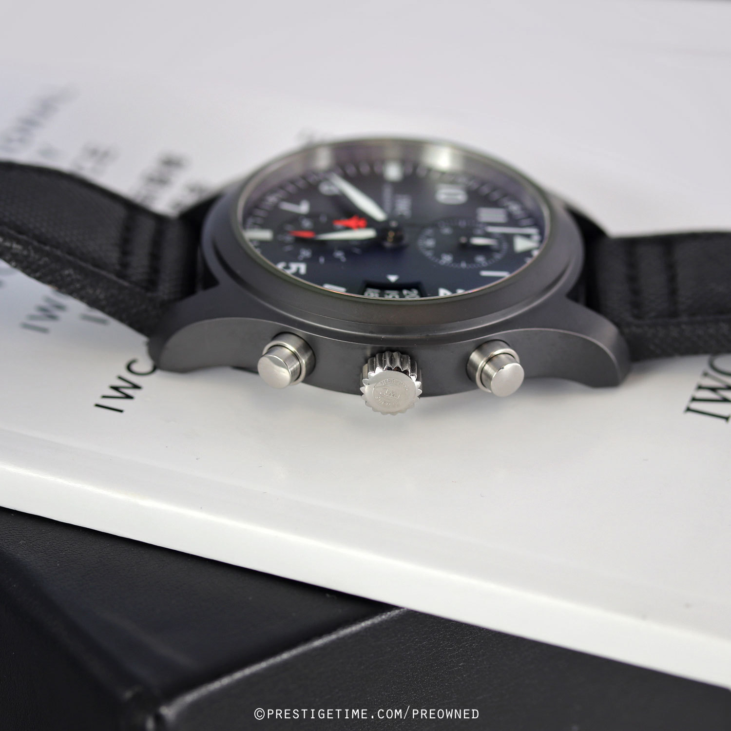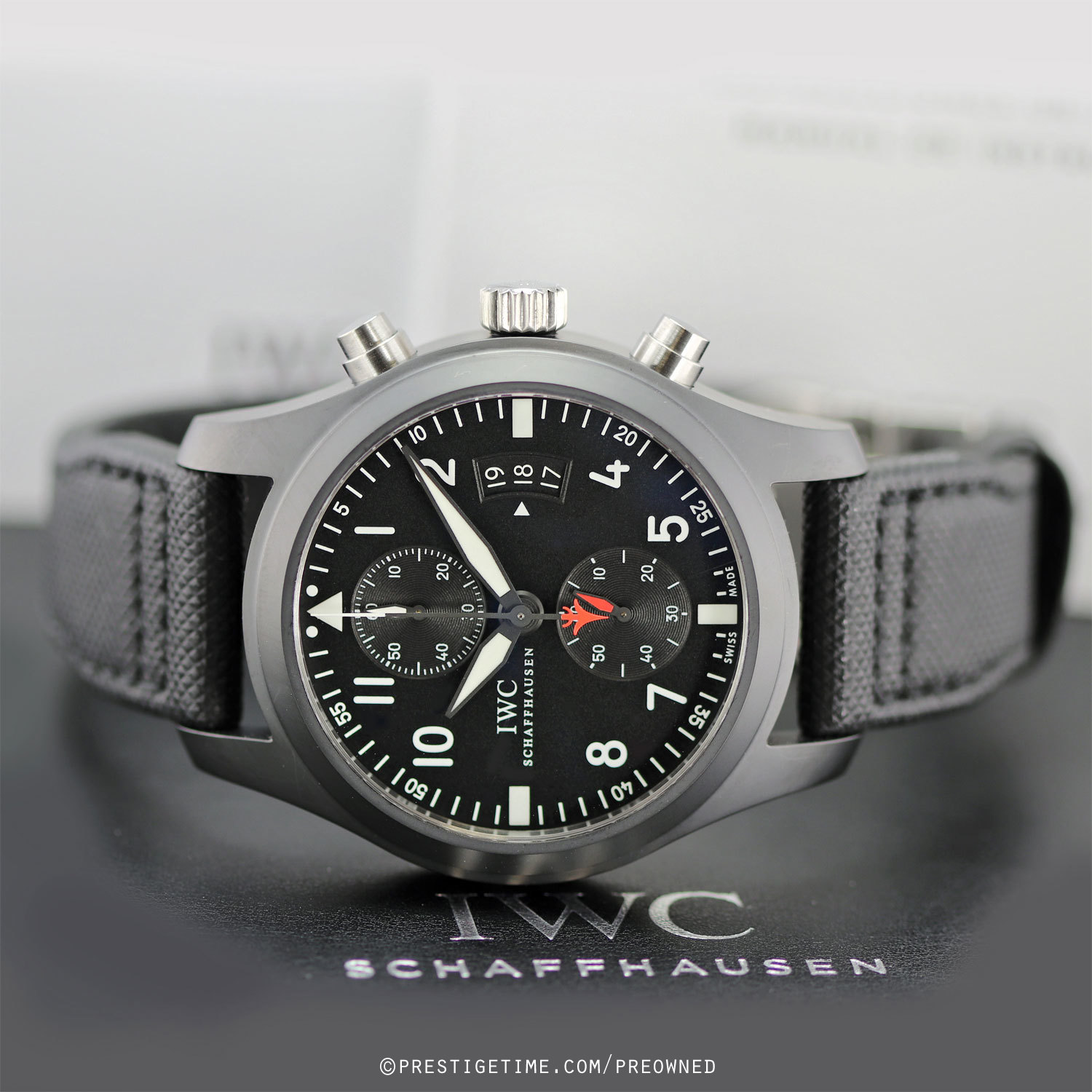 Case: Matte black ceramic case. Titanium crown & chrono buttons. Black dial. A combination of bold Arabic numeral & index hour markers, the 12/3/6 & 9 markers are luminous index hour markers. Printed minute/seconds track. Blackened steel hands, the hour & minute hands with luminous fill. Small seconds sub-dial at 6 o'clock. Elongated date window at 3 o'clock. Chronograph: Flyback function allows instant restarting of the stopwatch with a single push of the button rather than having to stop, reset & then restart the stopwatch. Large, luminous tipped, central hand seconds counter with a red counterweight which resembles the silhouette of a jet. 60 minute sub-dial counter at 12 o'clock. The case back is engraved & color filled with the TOP-GUN logo & UNITED STATES NAVY - FIGHTER WEAPONS SCHOOL.