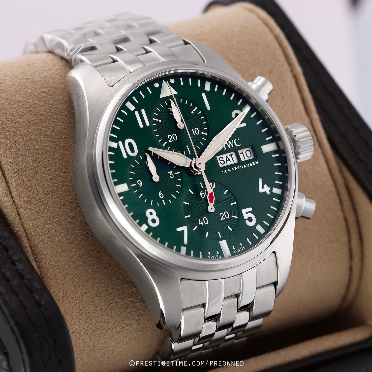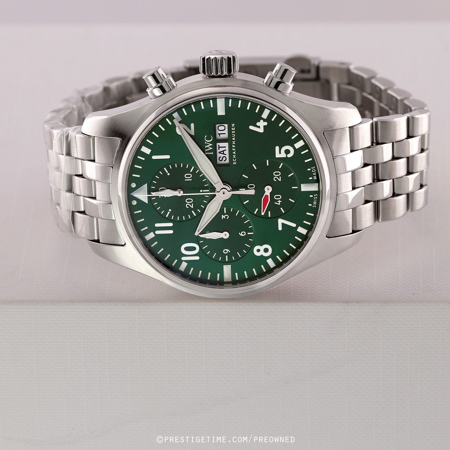 Case: Brushed stainless steel case with polished finished beveled corners. Polished stainless steel crown & chrono buttons. Green dial. Polished hands. The hour & minute hands with luminous fill. Bold numeral & index hour markers. Luminous quarter hour markings. Printed minutes/seconds track. Day & date window at 3 o'clock. Small seconds sub-dial at 6 o'clock.
