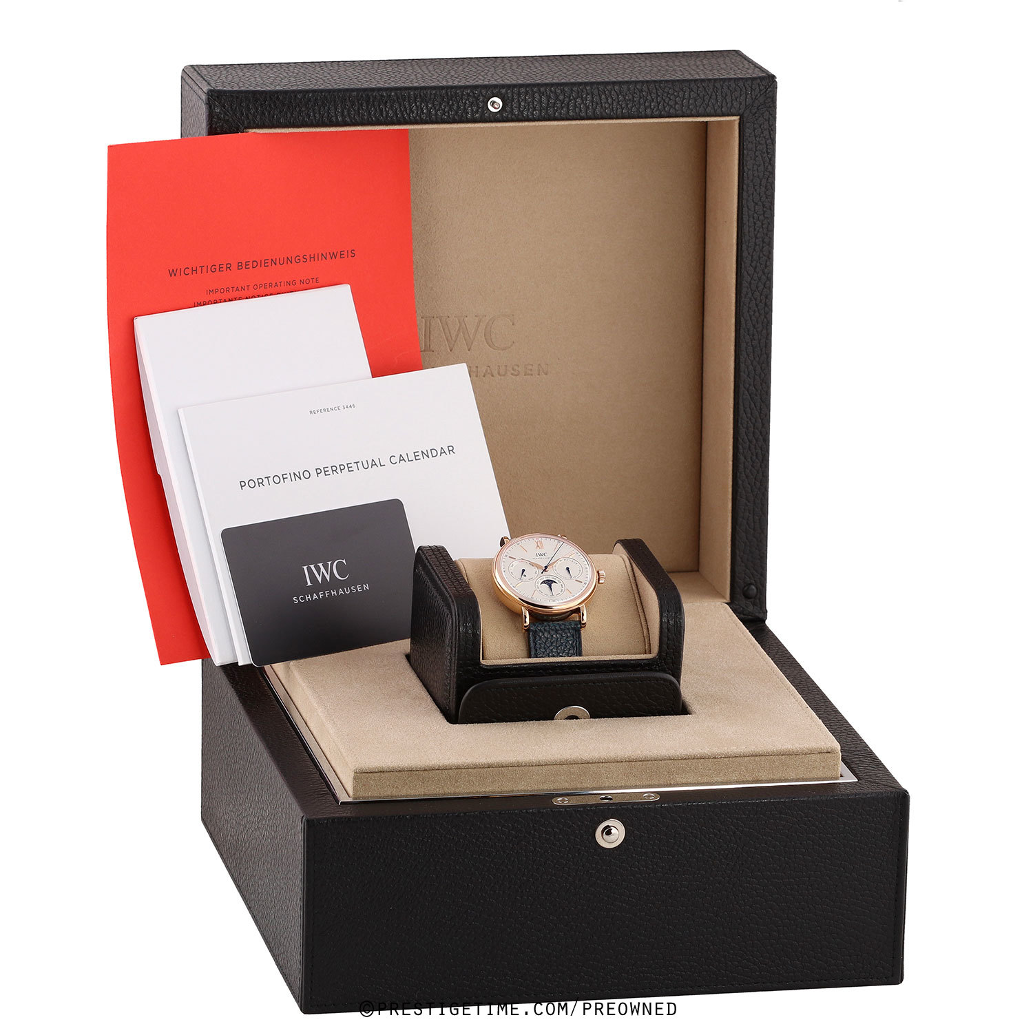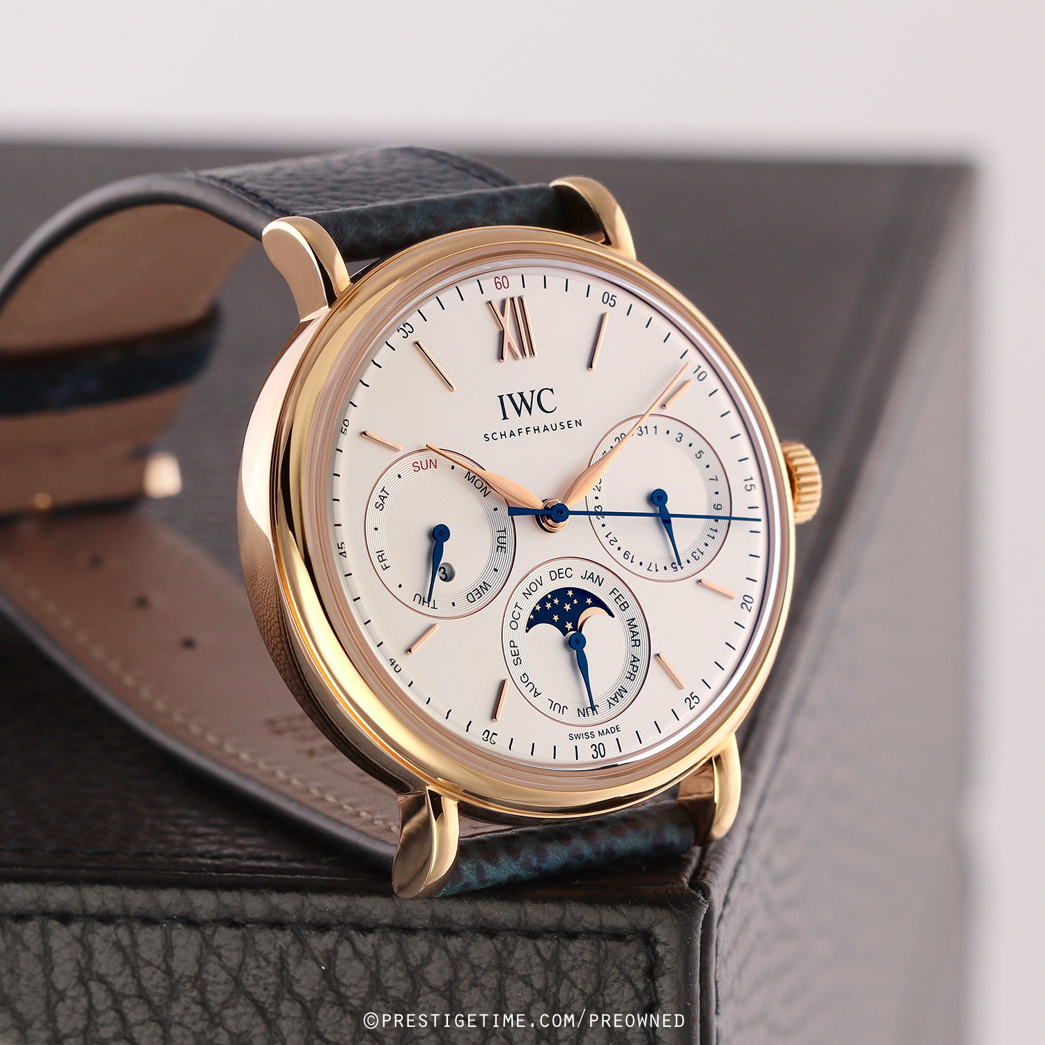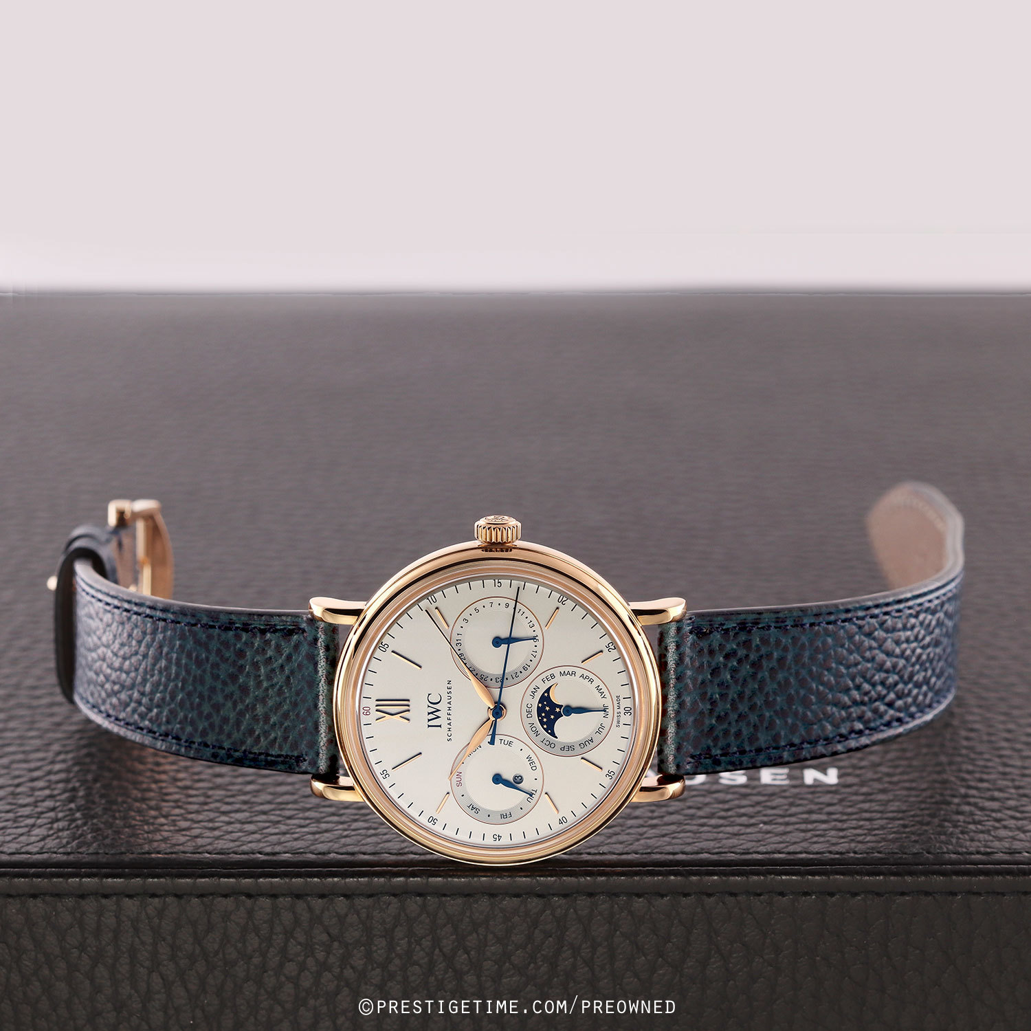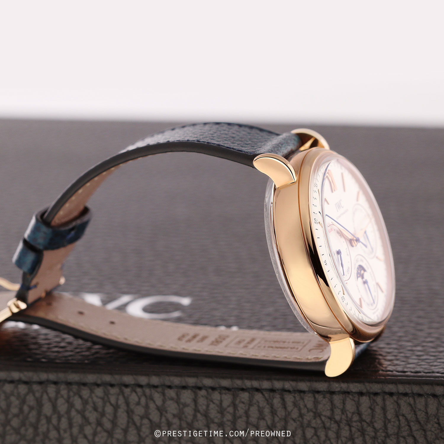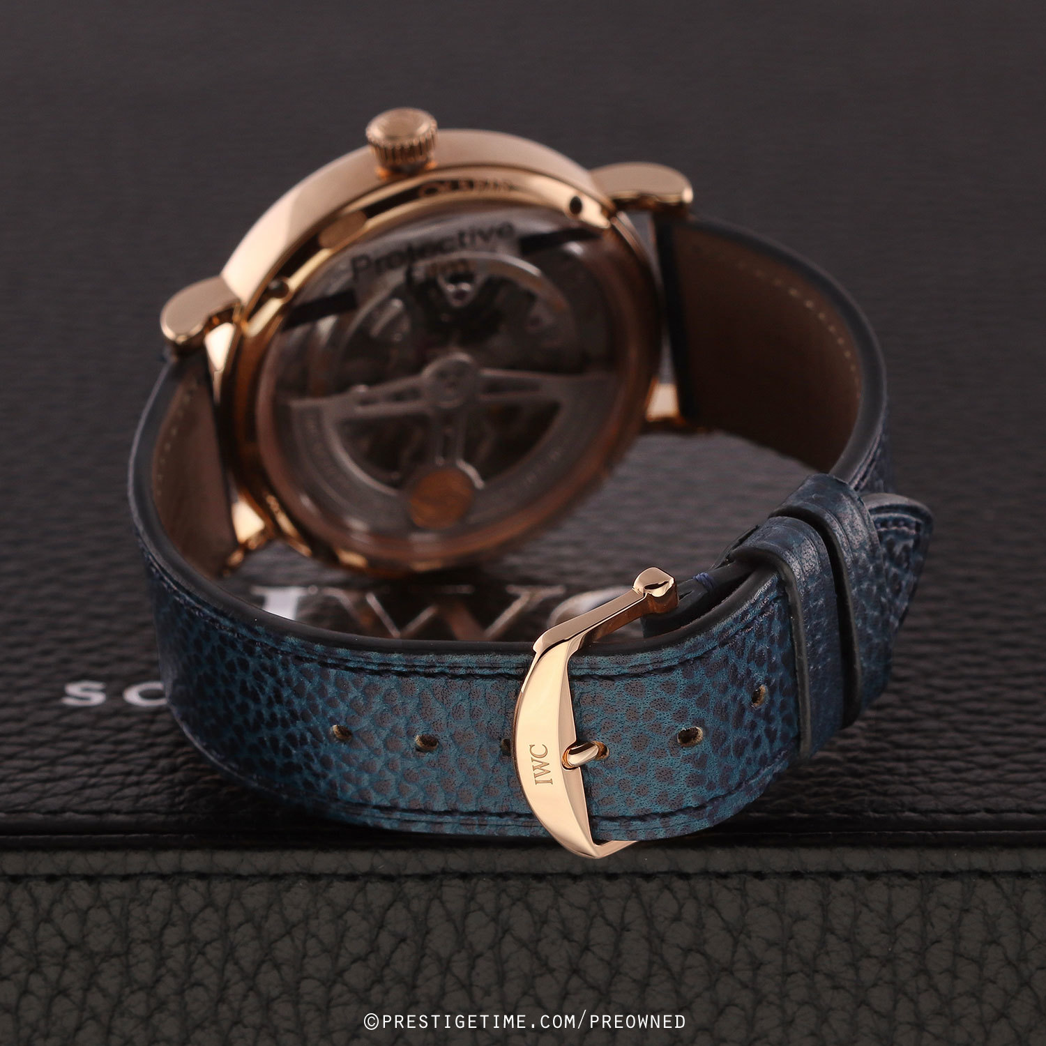 Strap: Fitted on its IWC original blue calfskin leather strap with a polished 18kt rose gold tang buckle. The strap is in excellent, near new condition with it full wear lifespan remaining. We would be comfortable rating the strap as in 98%+ condition.