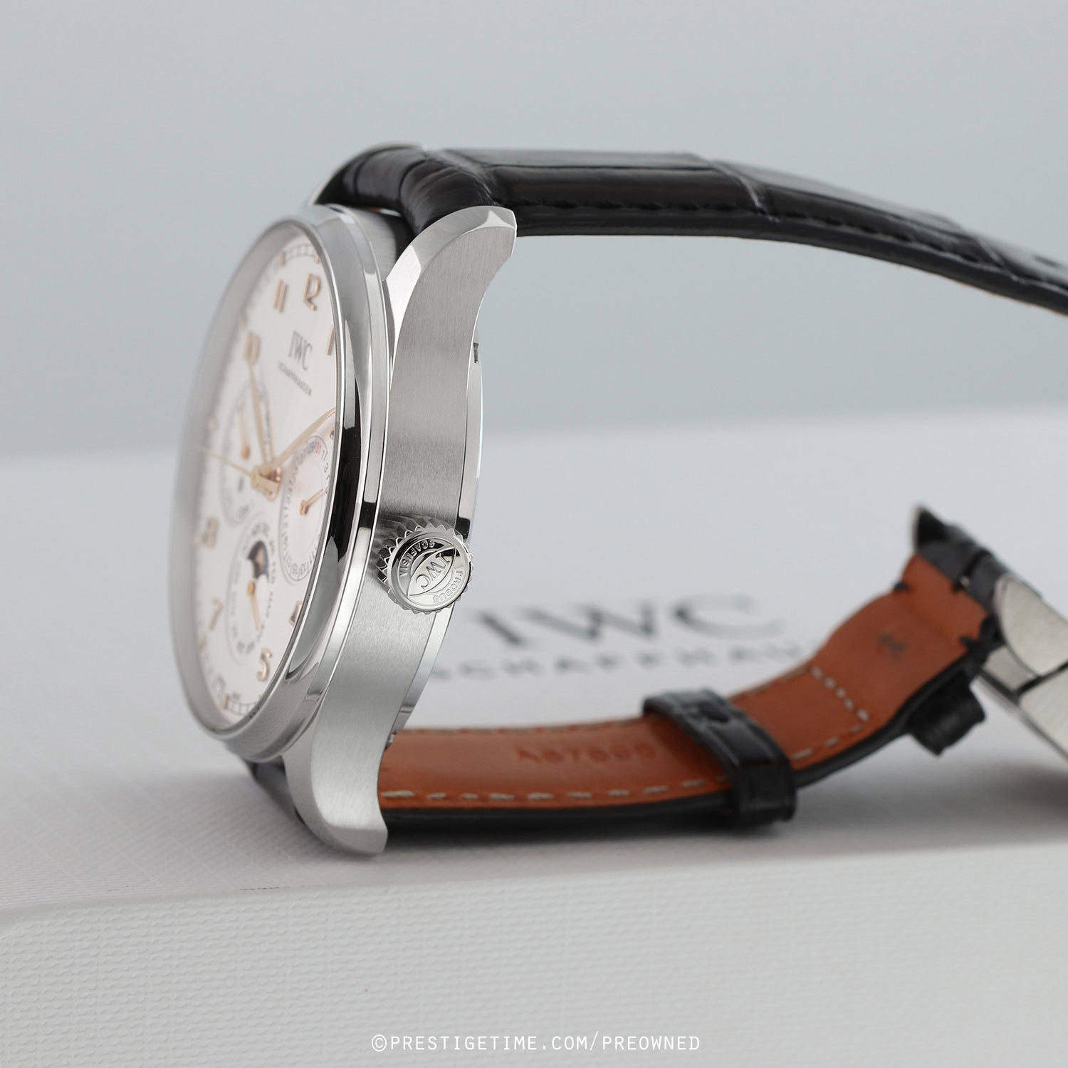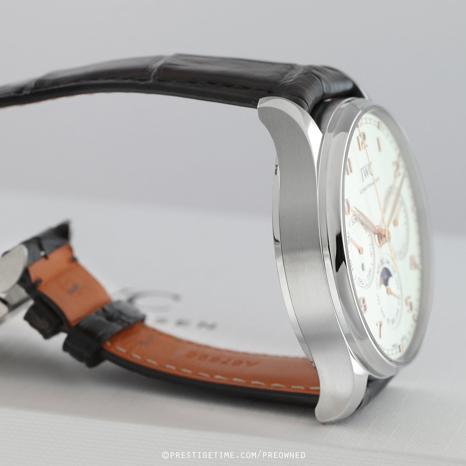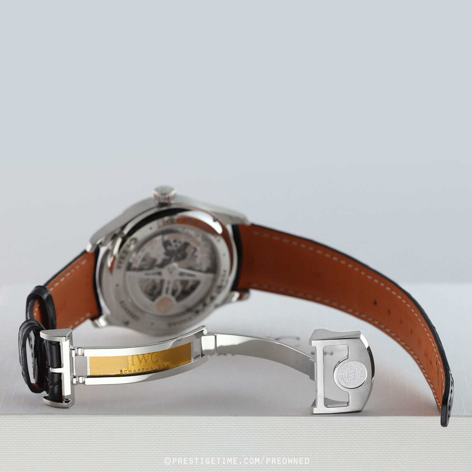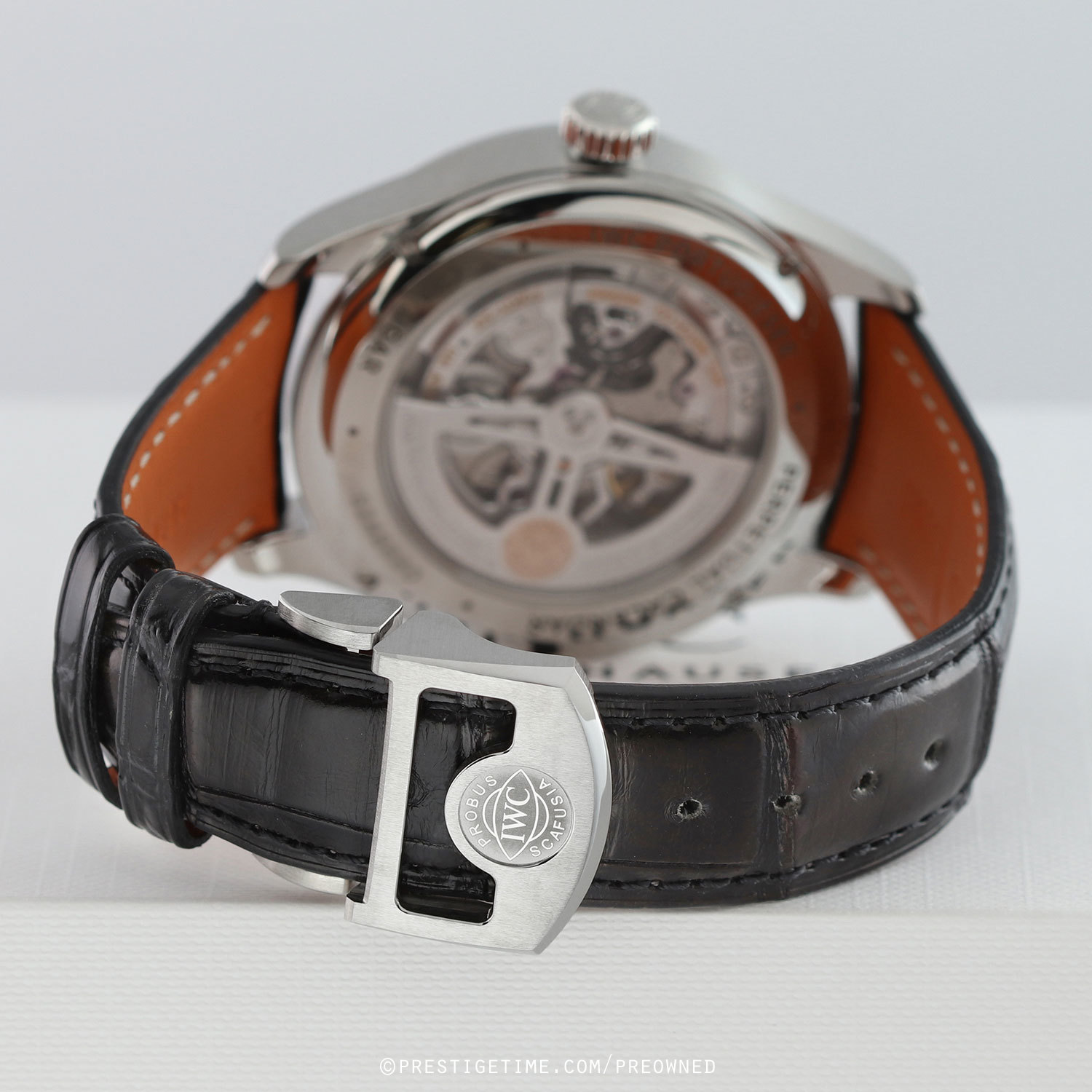 Strap: Fitted on its original IWC by Santoni black alligator strap with Santoni's signature orange calfskin leather lining & a stainless steel deployant buckle. The strap is in excellent near-new condition with its full wear lifespan remaining. We would be comfortable rating the strap in 98%+ overall condition.
