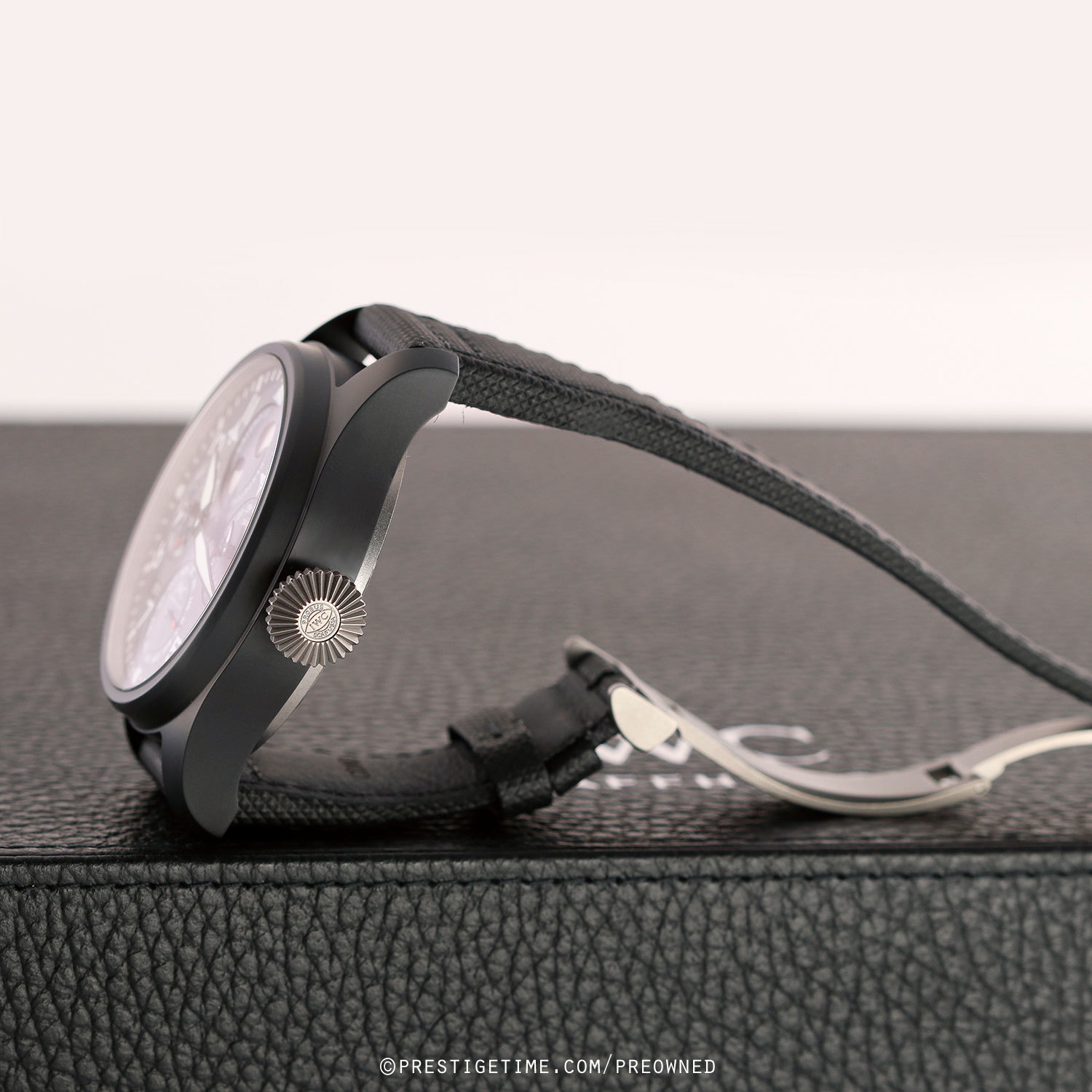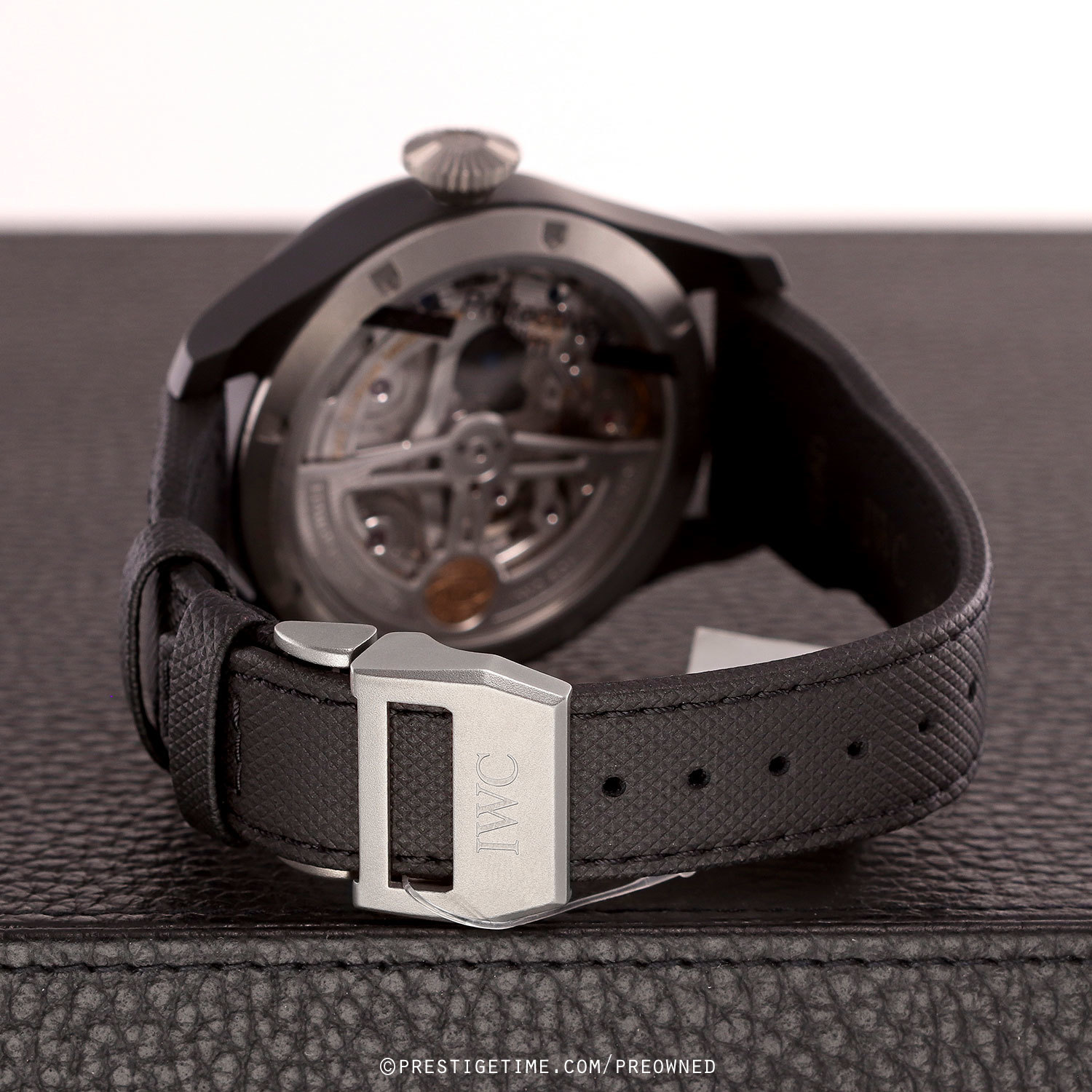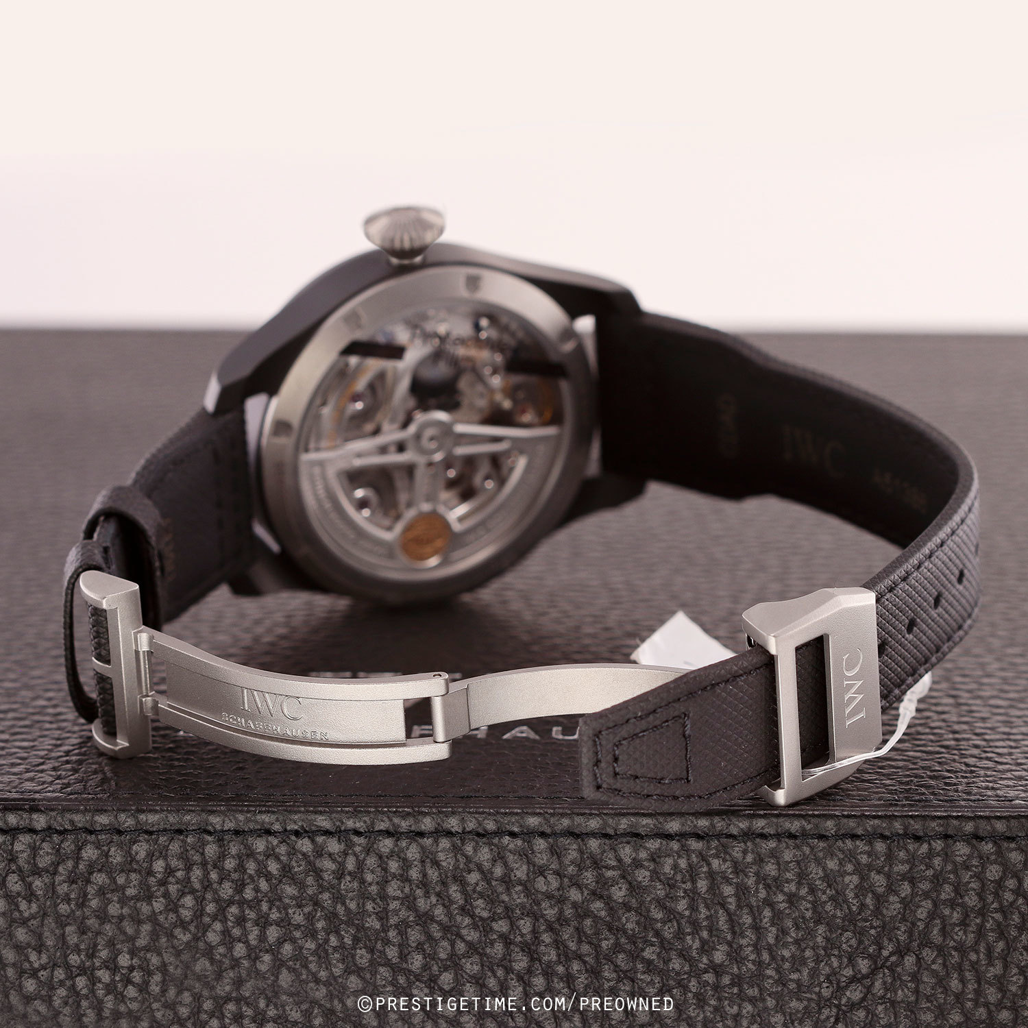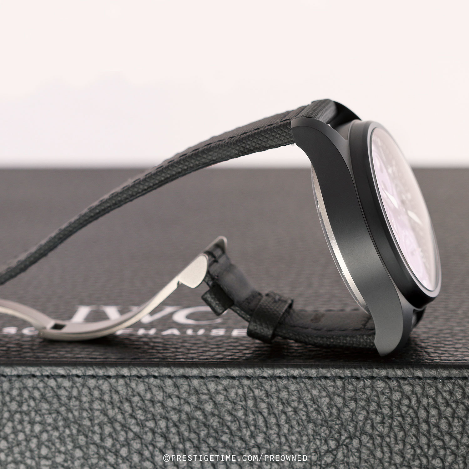 Strap: Fitted on its IWC original black calfskin leather strap with a titanium deployant buckle. The strap is unworn in new condition with its full wear lifespan remaining.