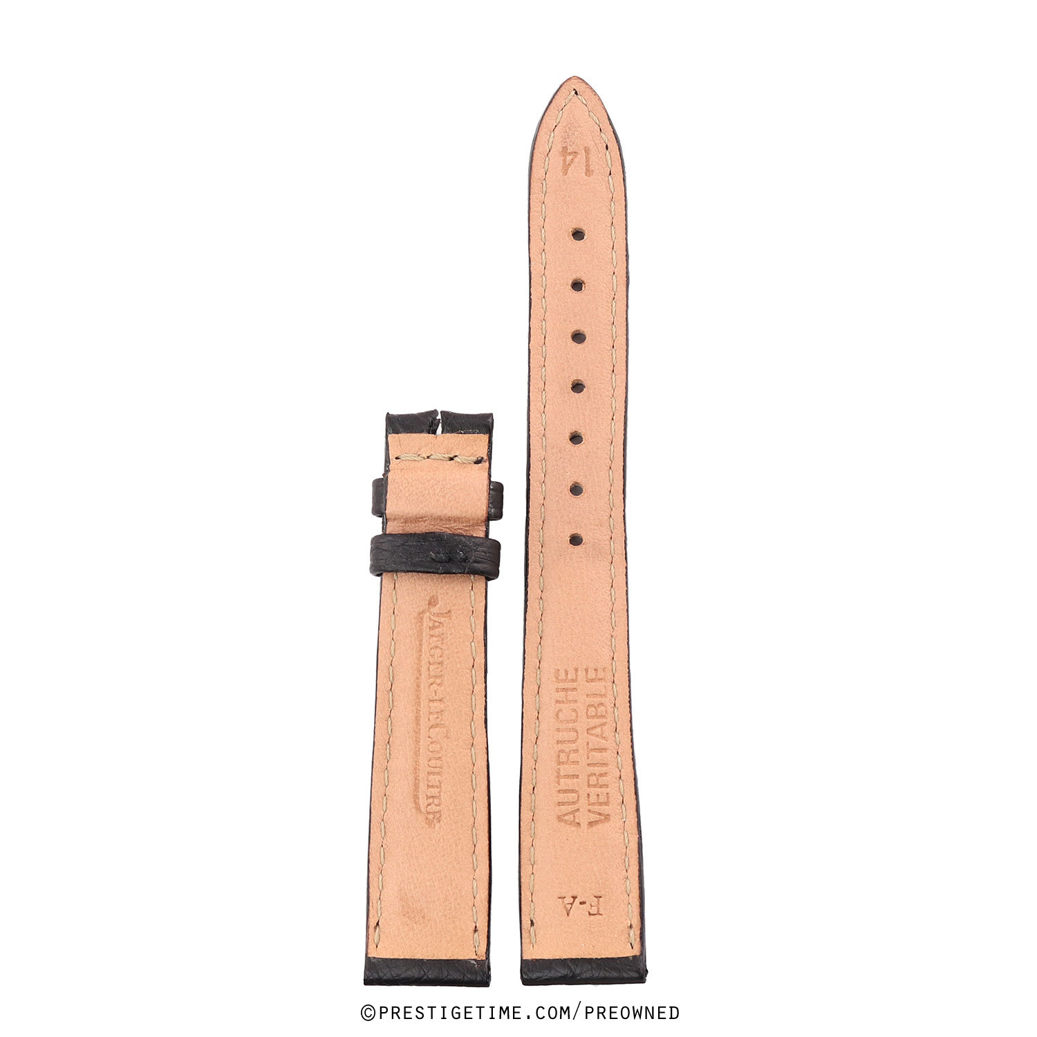 Genuine Jaeger LeCoultre light brown ostrich leather strap. Measures 14mm at the lugs & 12mm at the buckle. Unworn, light shop wear. 65mm buckle end. 105mm tail end.