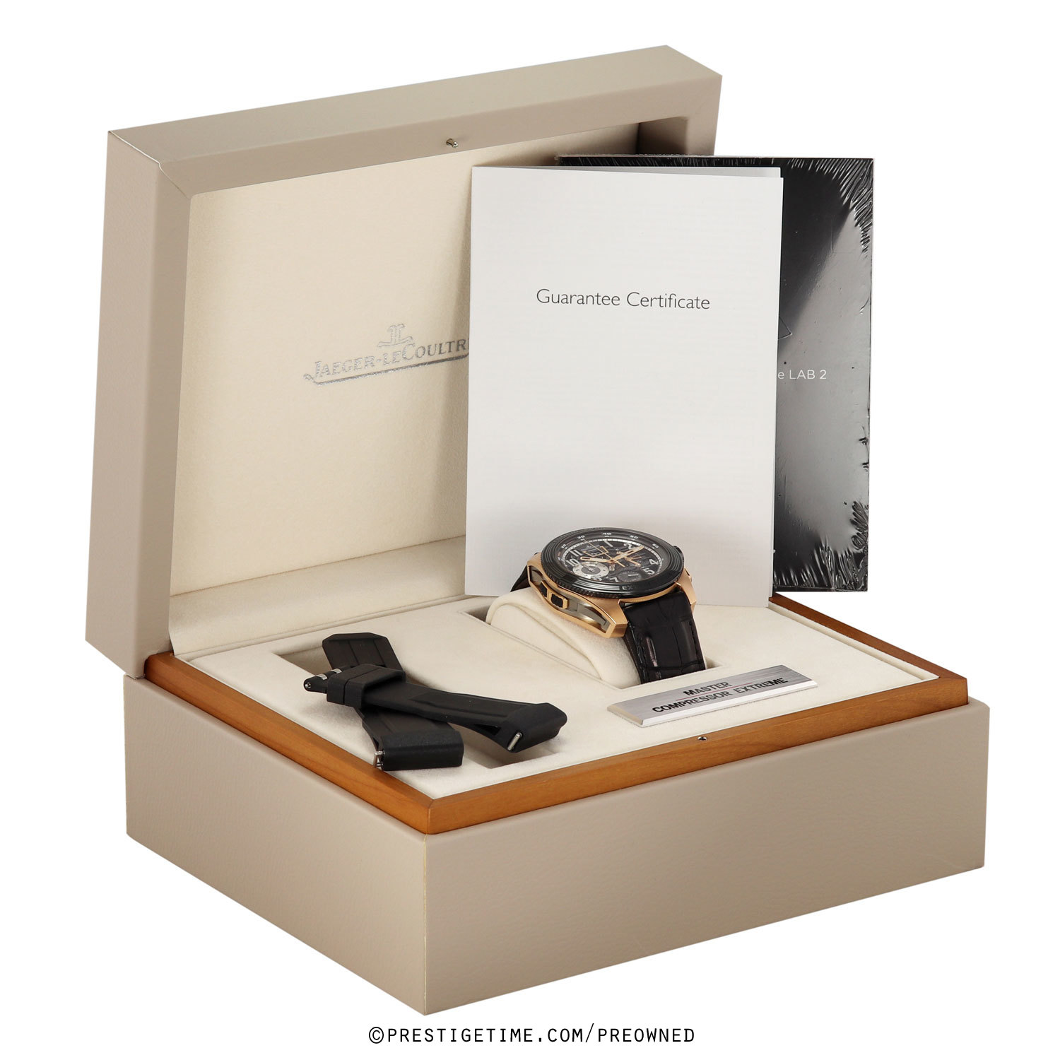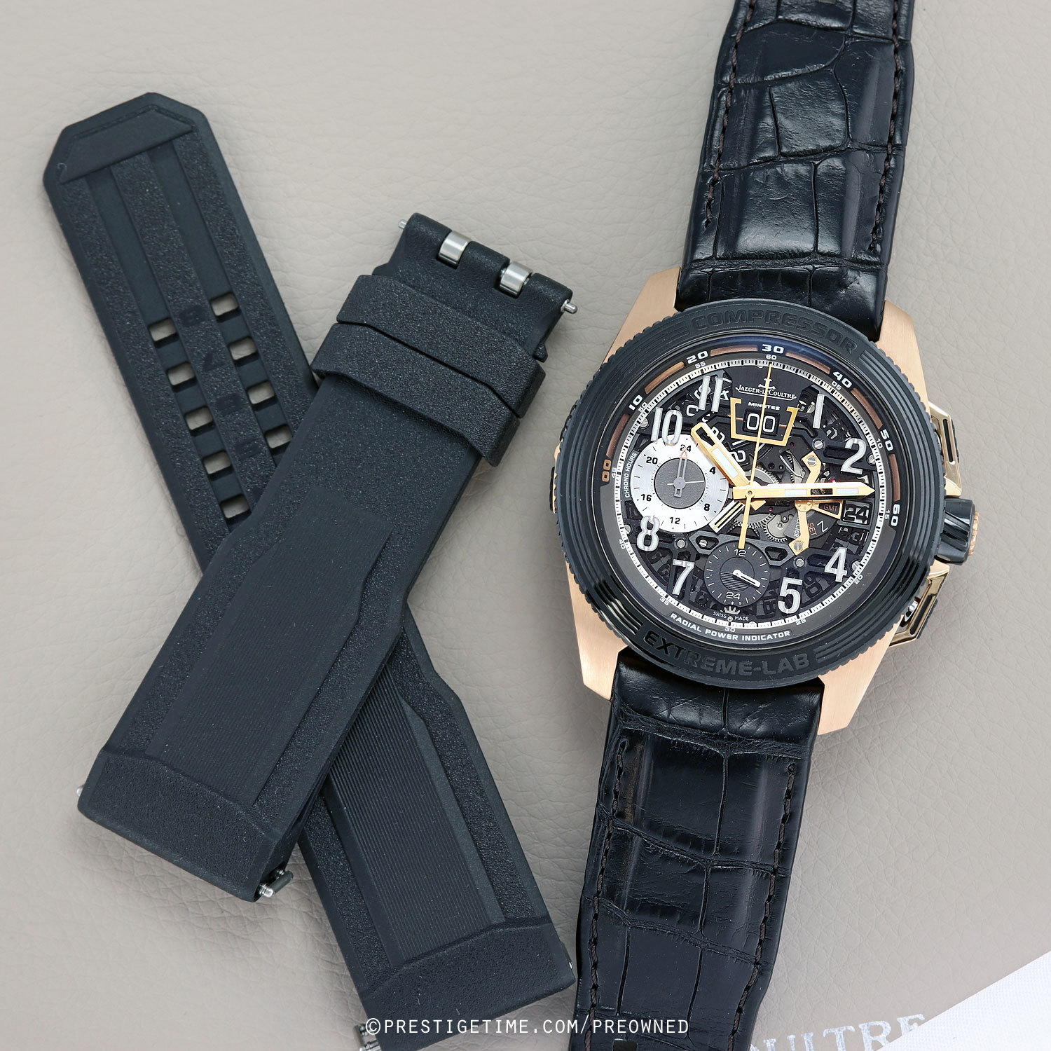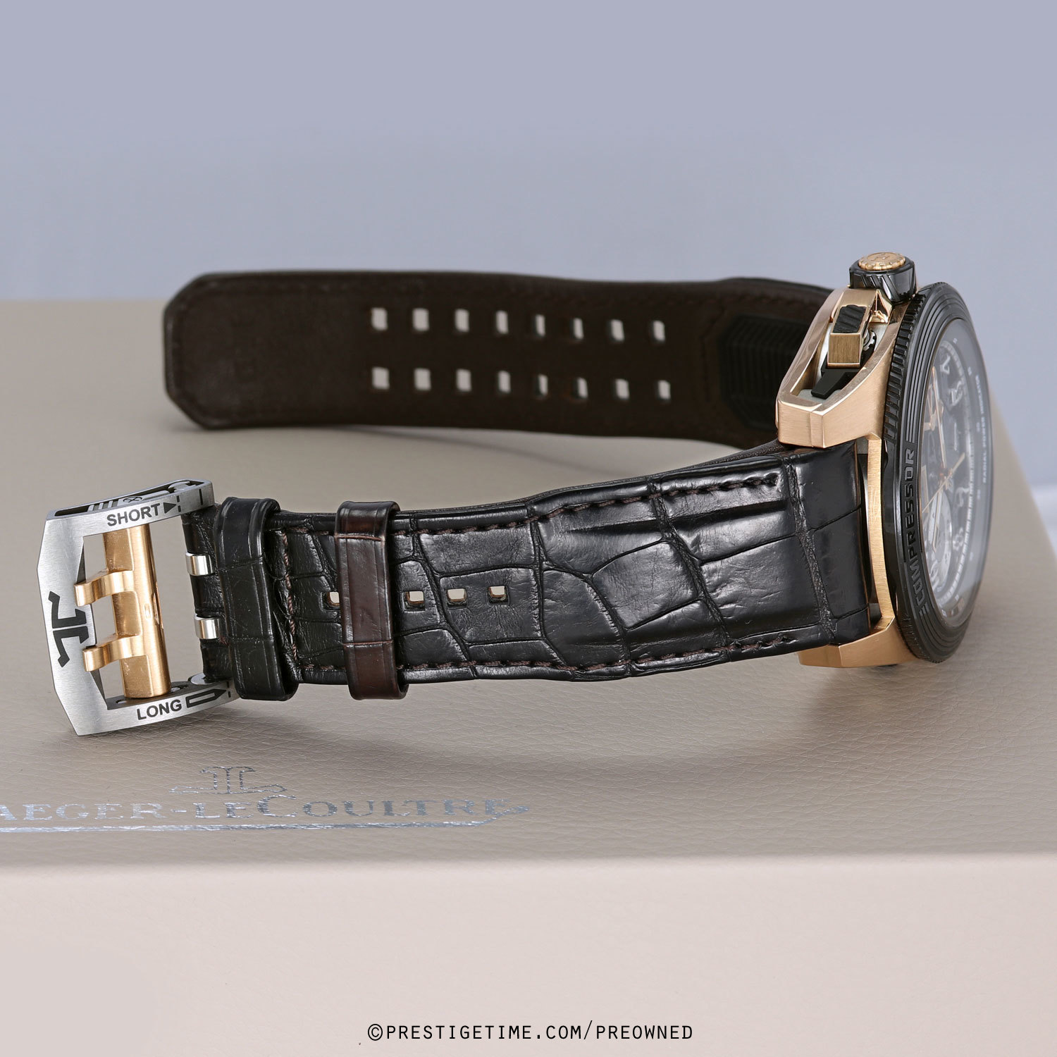 Strap: Fitted on its original dark brown (almost black) alligator with integrated rubber grips on the back. The alligator strap is in excellent condition with only light signs of wear & with most of its wear life remaining, we would categorize the strap as being in 95% condition. Quick release system allows for easy & quick strap changes, requiring no tools. Tang buckle with short & long adjustments allowing for a perfect fit. Delivered with an additional unworn OEM JLC black rubber strap to fit.
