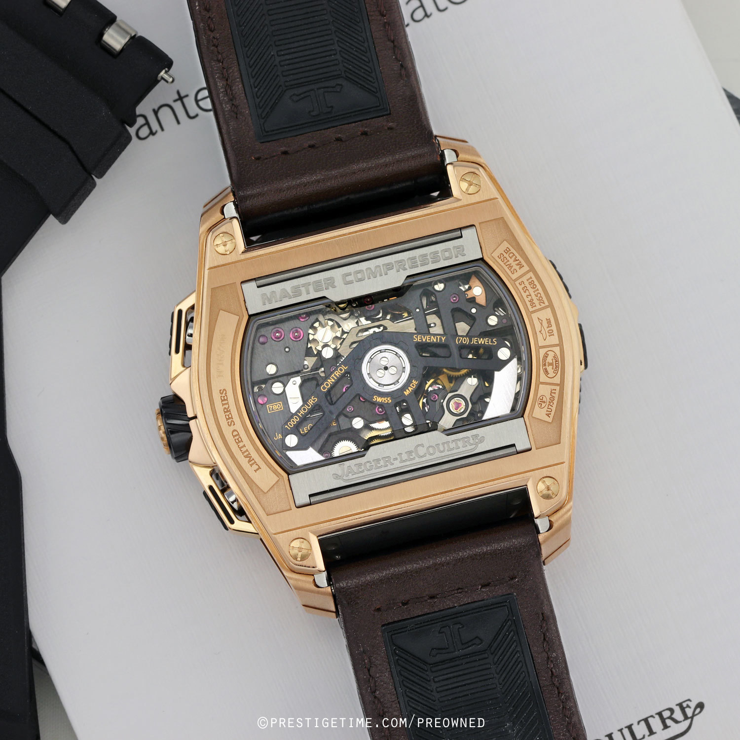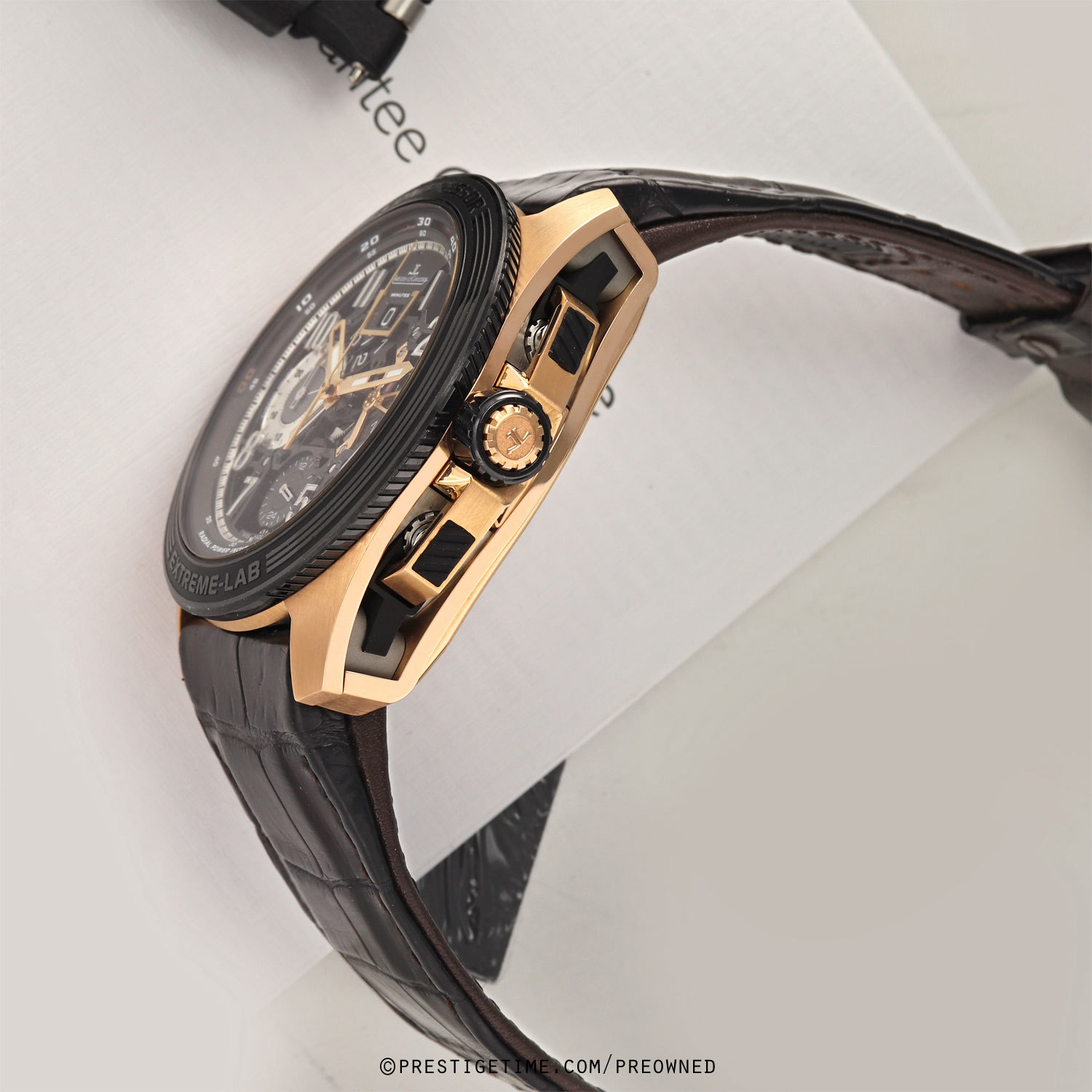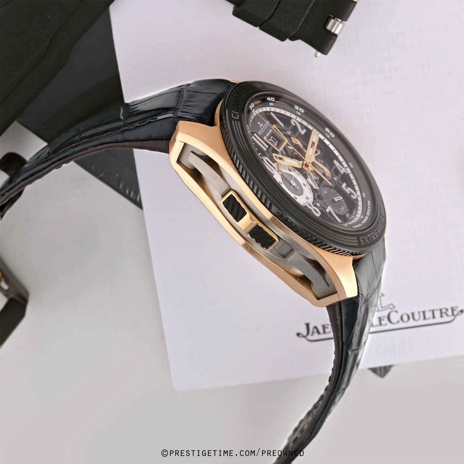 Movement: Powered by an in-house Jaeger LeCoultre caliber 780, beats at 28,800 vph, composed out of 569 parts, contains 70 jewels & has a power reserve of +/- 60 hours. Features a lubrication-free, free-sprung escapement using silicon components, and ceramic ball-bearings for the rotor which requiring no lubrication over its lifetime. The bridges are dark ruthenium finished. As with all JLC watches this watch has undergone a rigorous '1000 HOURS CONTROL' (41 days) test before leaving the factory.