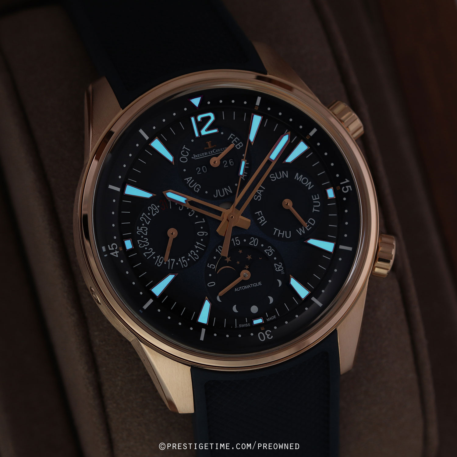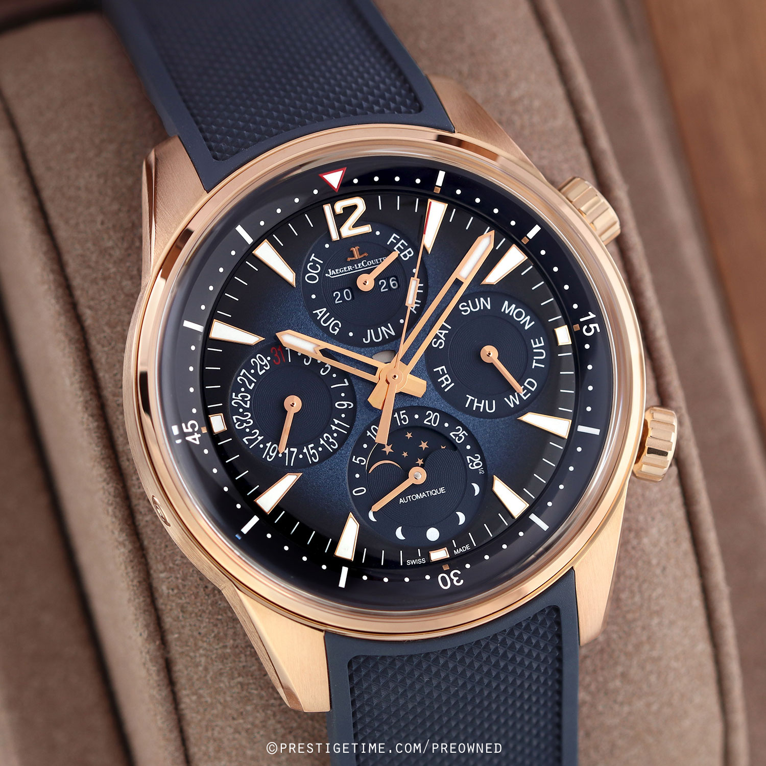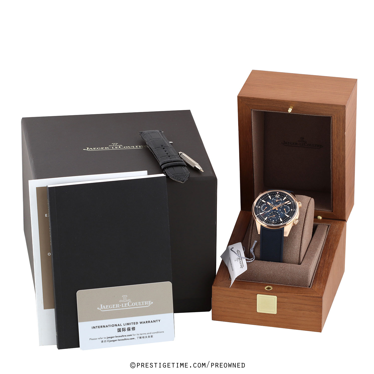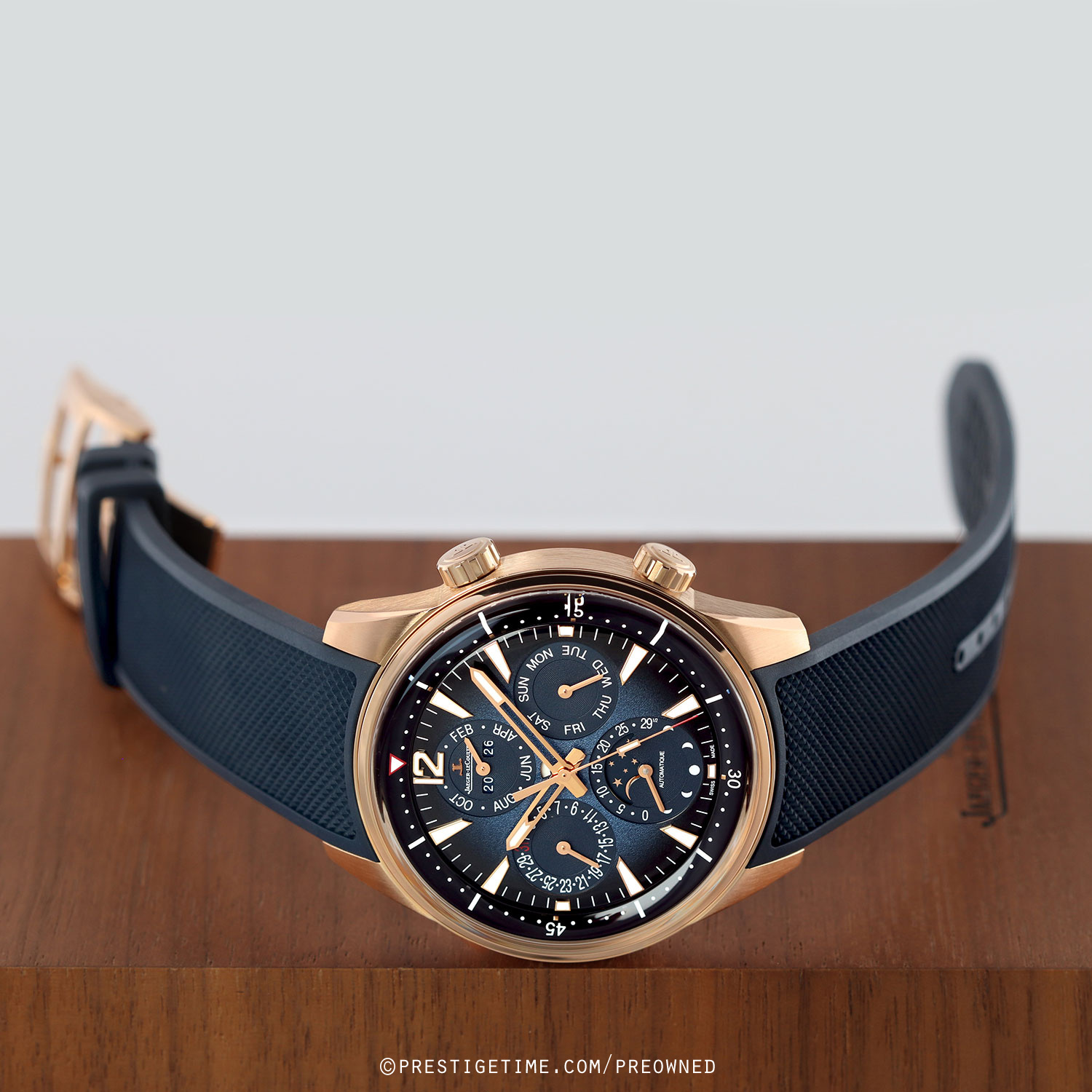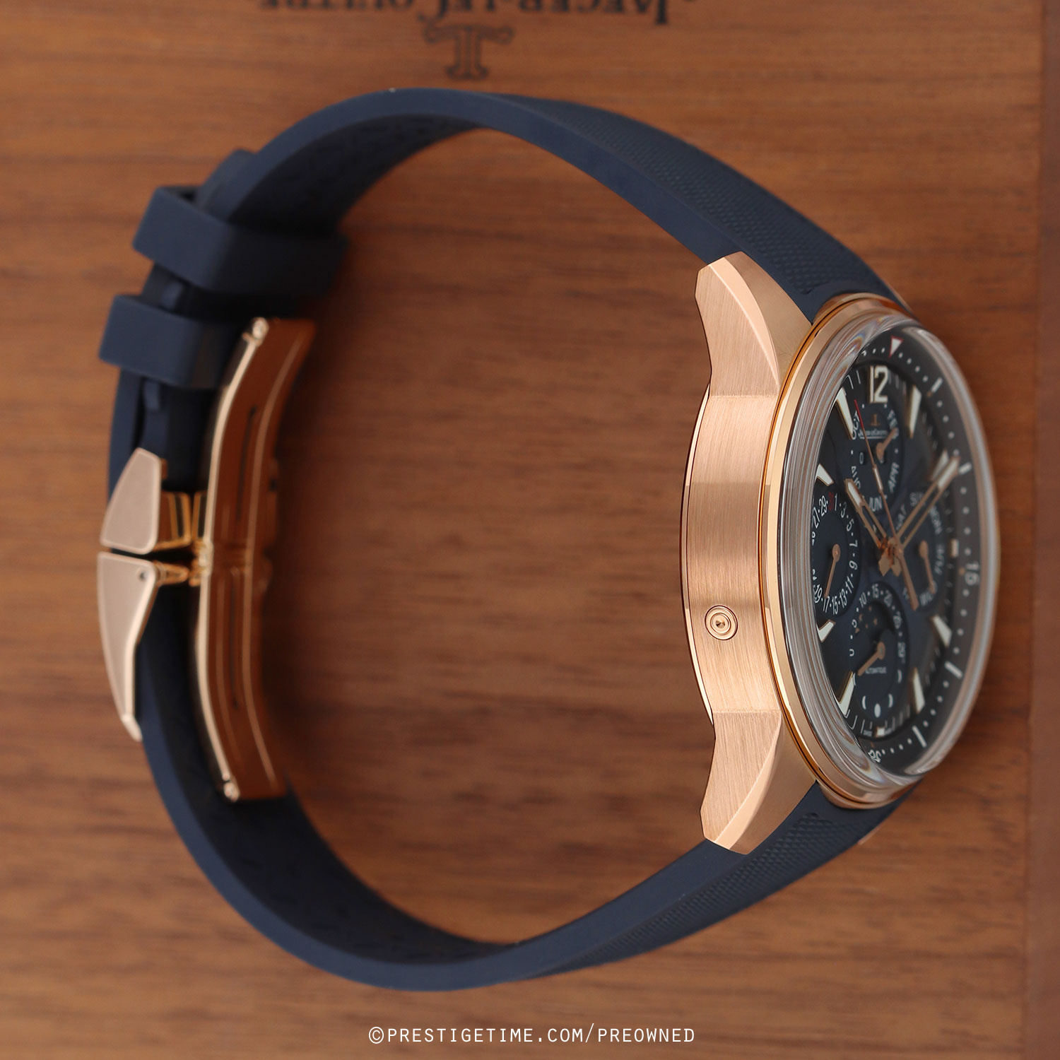 - Fitted on its JLC original blue rubber strap with a solid 18kt rose gold push-button deployant buckle. The strap is excellent near-new condition with the vast majority of its wear lifespan remaining. We would rate this strap in 97% overall condition.