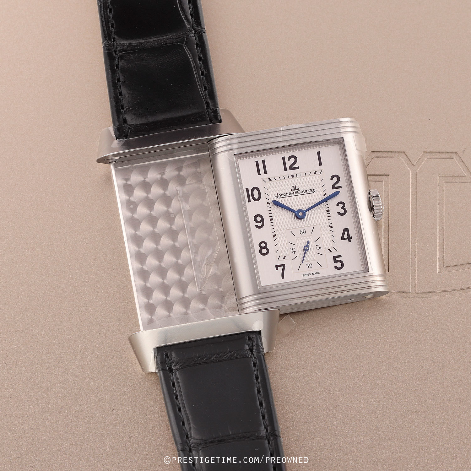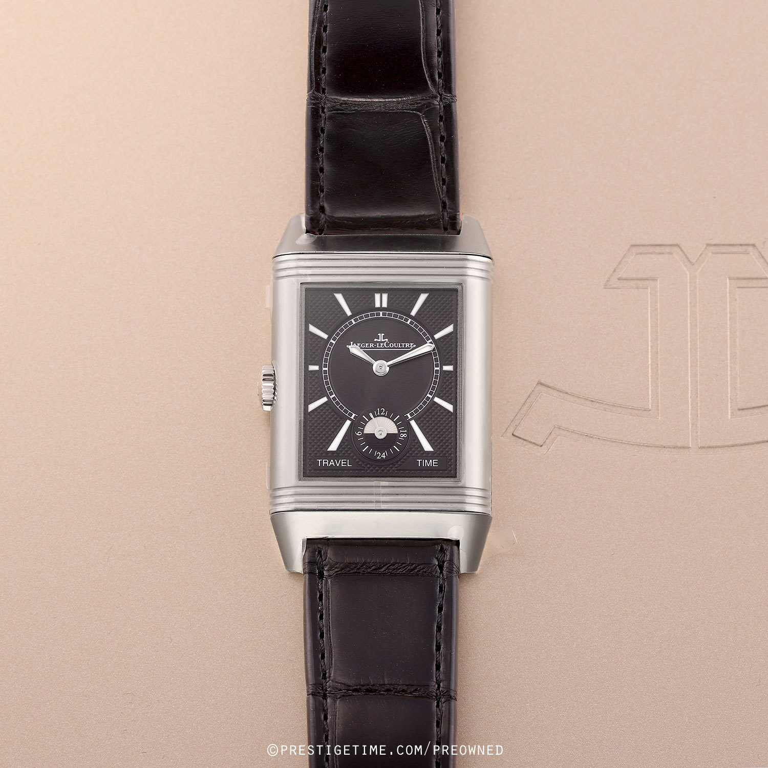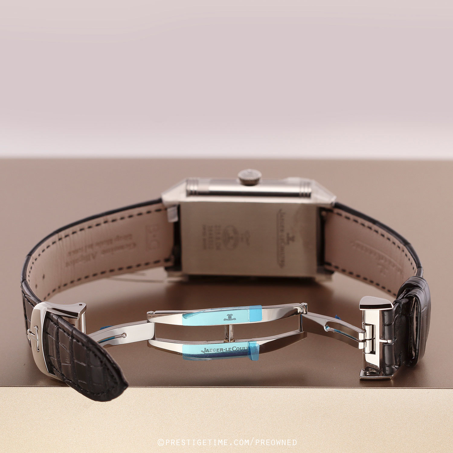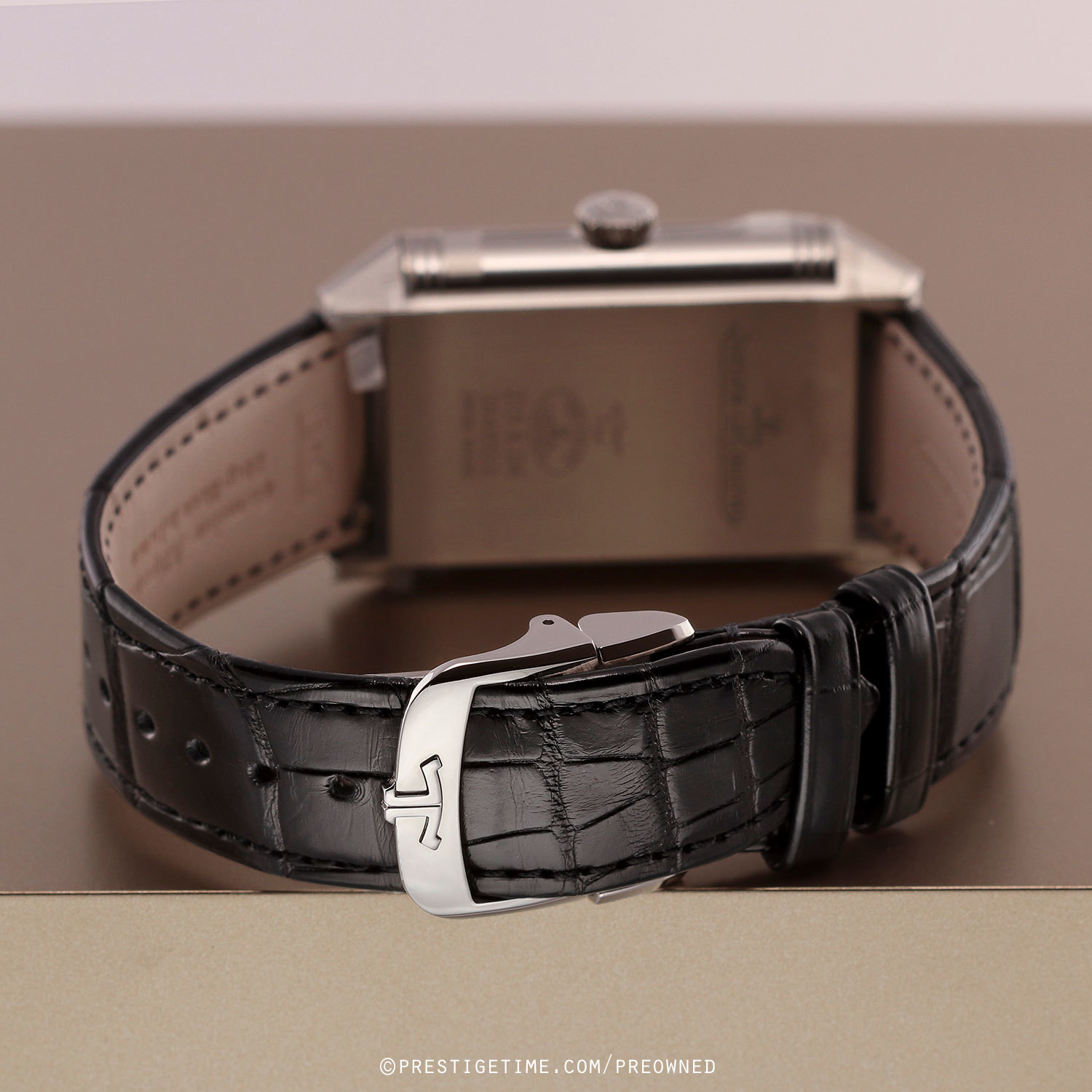 Strap: Fitted on its original JLC black alligator leather strap with a stainless steel deployant buckle. The strap is unworn in brand new condition with its full wear lifespan remaining.
