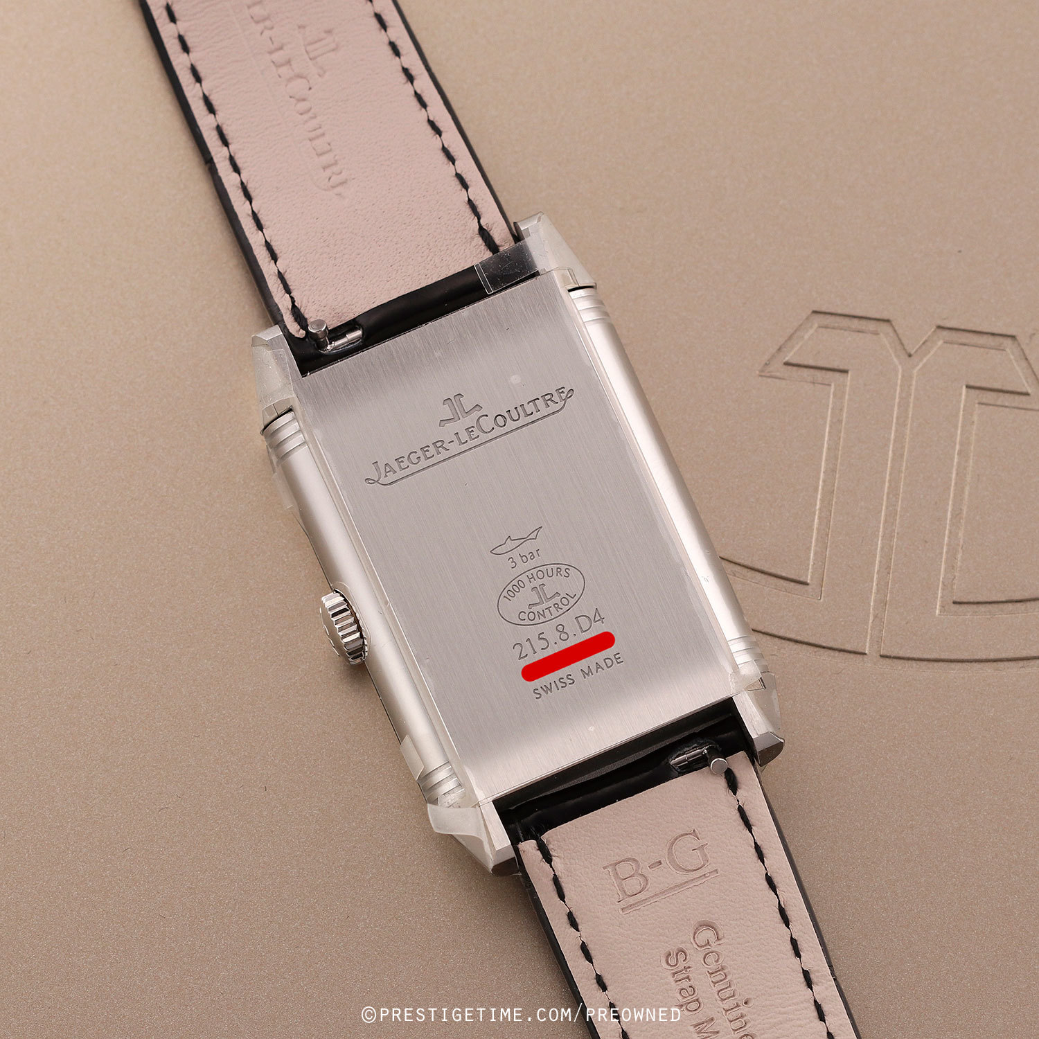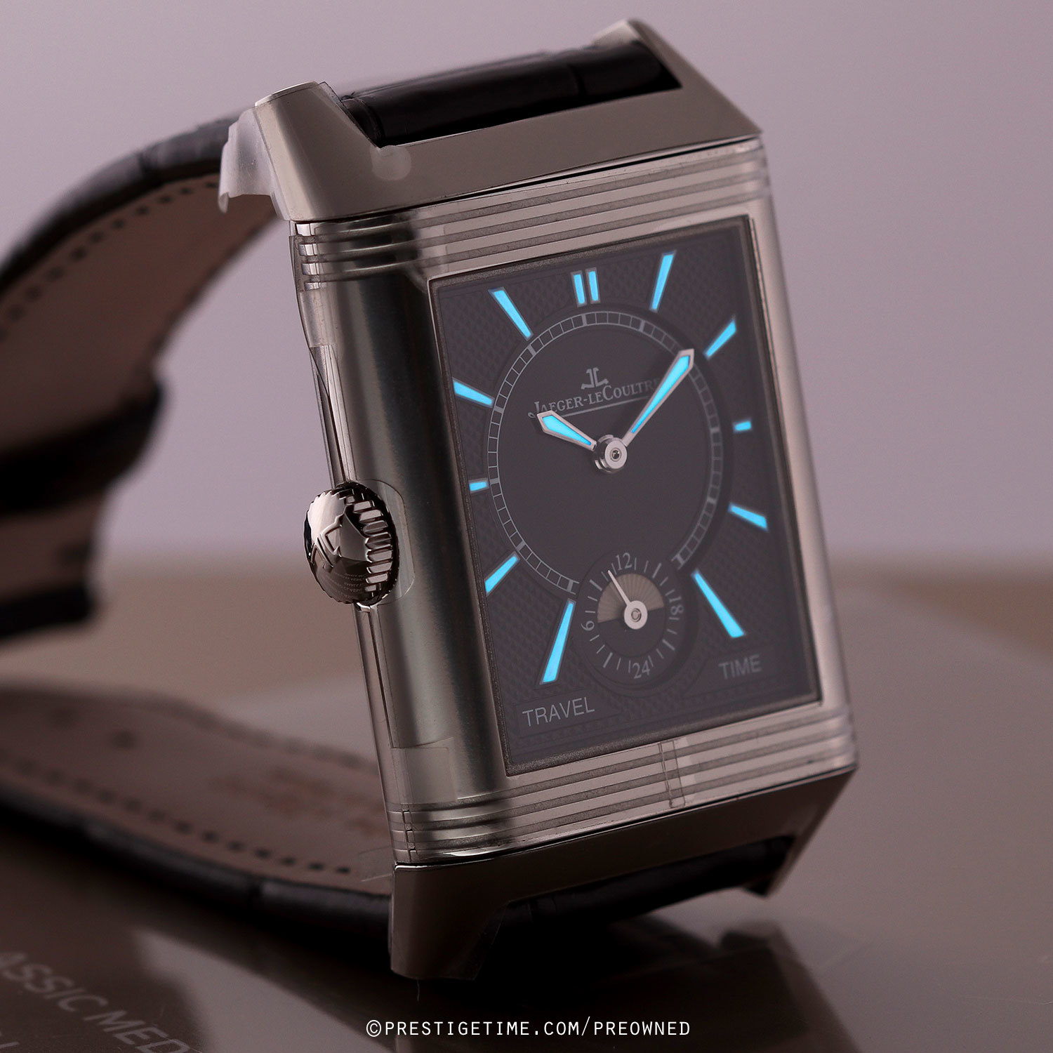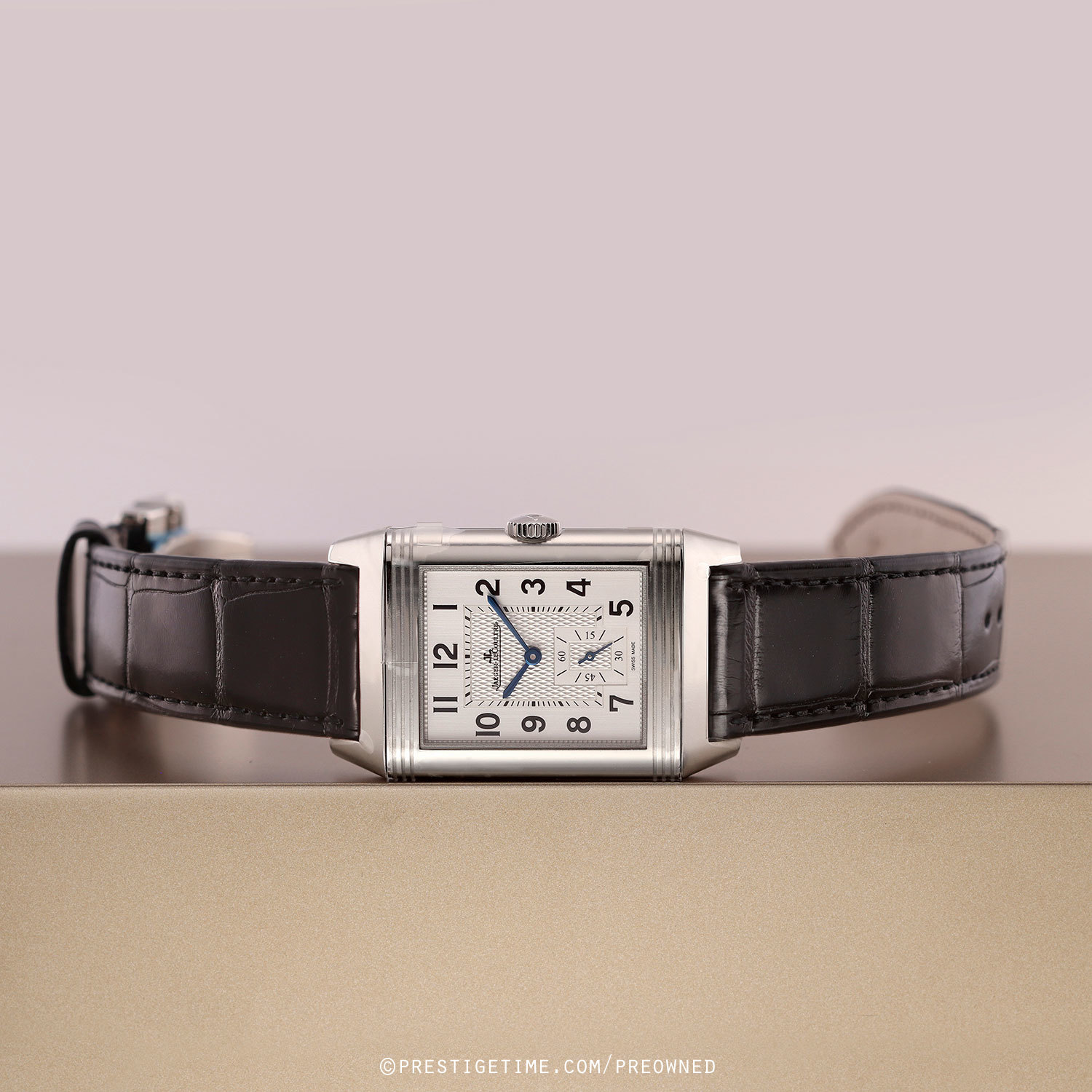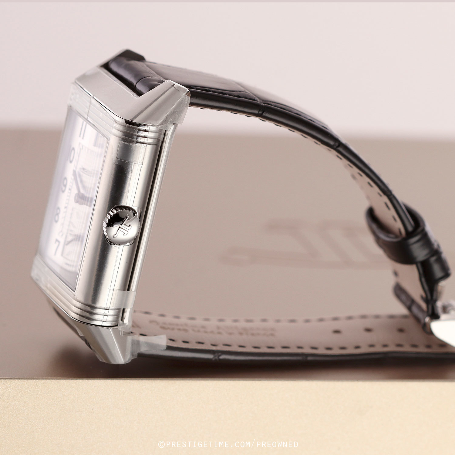 Strap: Fitted on its original JLC black alligator leather strap with a stainless steel deployant buckle. The strap is unworn in brand new condition with its full wear lifespan remaining.
