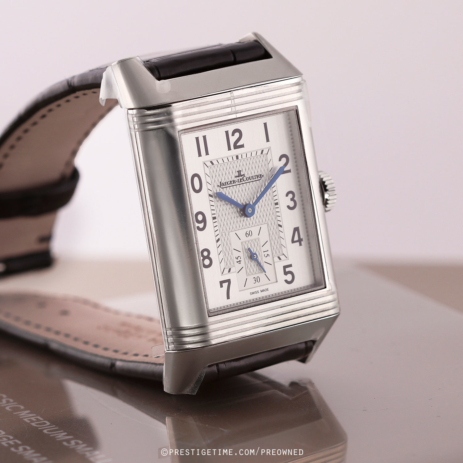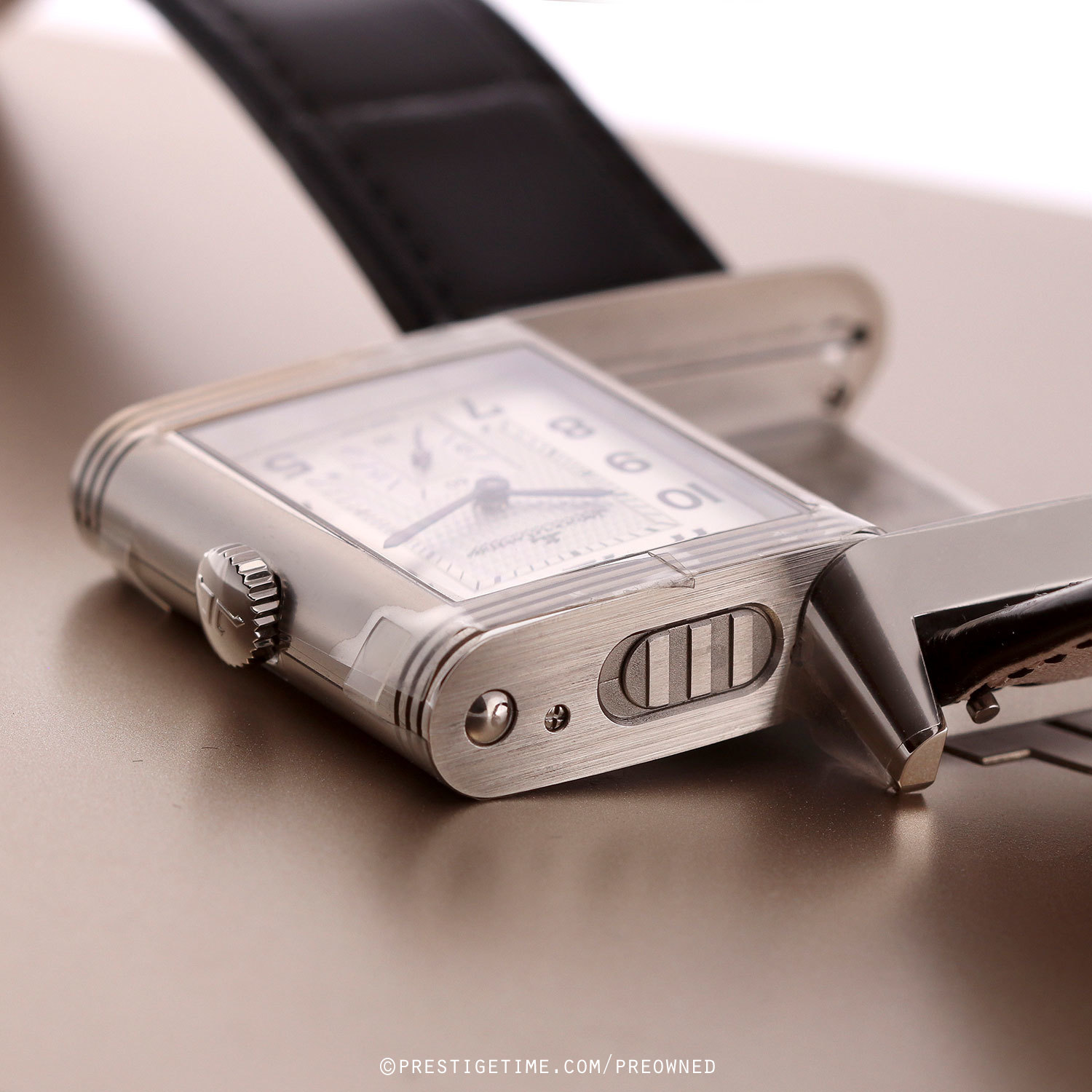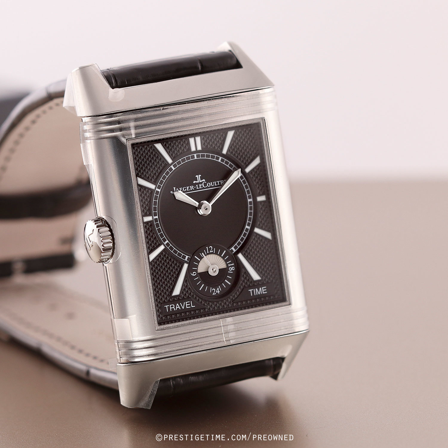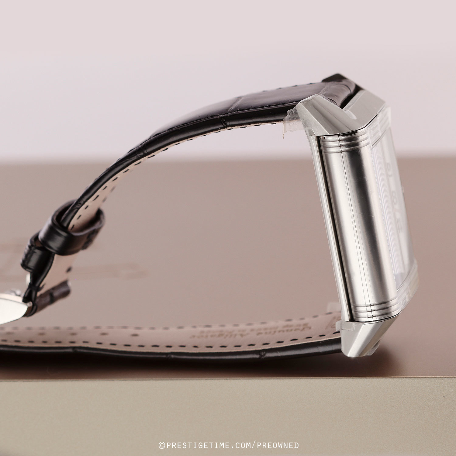 Strap: Fitted on its original JLC black alligator leather strap with a stainless steel deployant buckle. The strap is unworn in brand new condition with its full wear lifespan remaining.