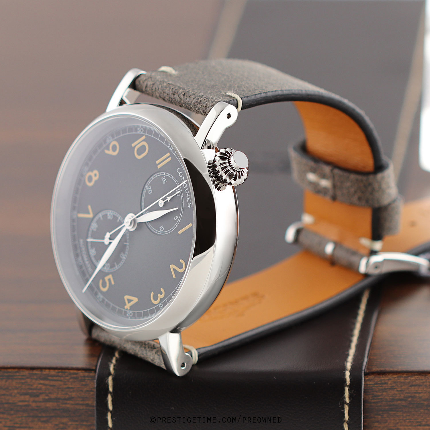 Strap: Fitted on its original distressed grey calfskin leather strap with a tang buckle & an extension strap to fit over a flight suit. The strap is unworn.