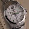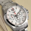 Case: Brushed & polished stainless steel case. Silver dial with a fine concentric circle pattern texture. Darkened polished time related hands, the hour & minute hands with luminous fill. Red chrono-related hands. Applied polished darkened steel hour markers, indexes with luminous fill. Fine red printed minute track. Dial flange with seconds & fractions of a second track. Date window at 4.30. Small seconds sub-dial at 6 o'clock.