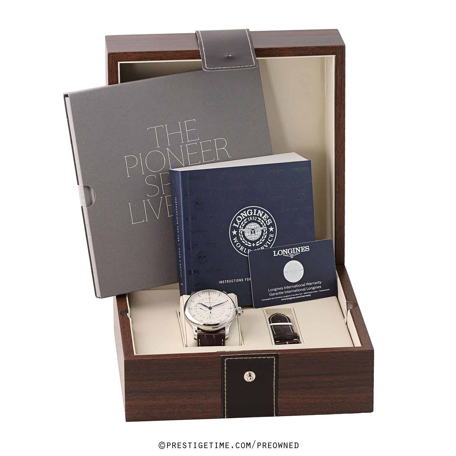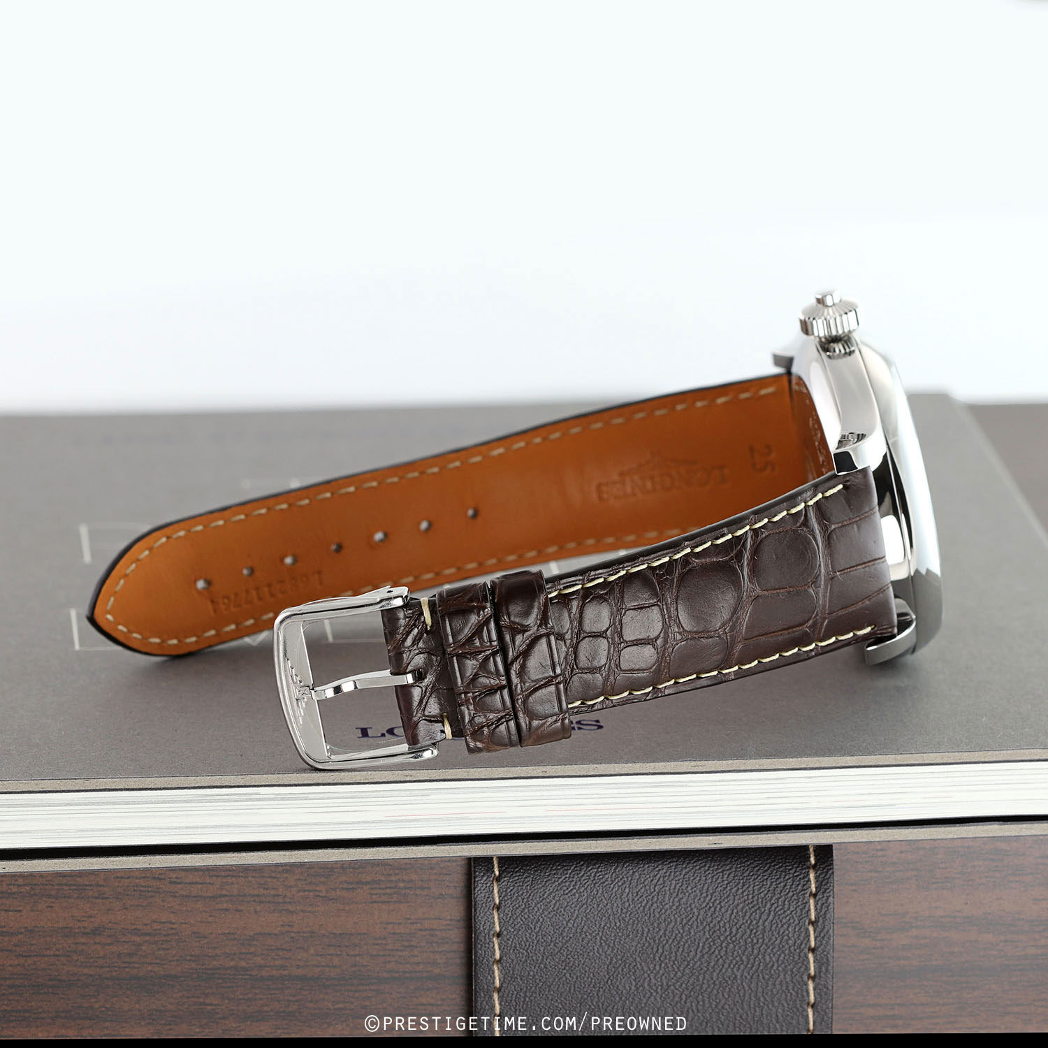 Strap: Fitted on it original Longines brown alligator leather strap with a stainless steel tang buckle. Delivered with an extension leather strap for fitting over a flight suit. The strap is unworn, in brand new condition with its complete wear lifespan remaining.