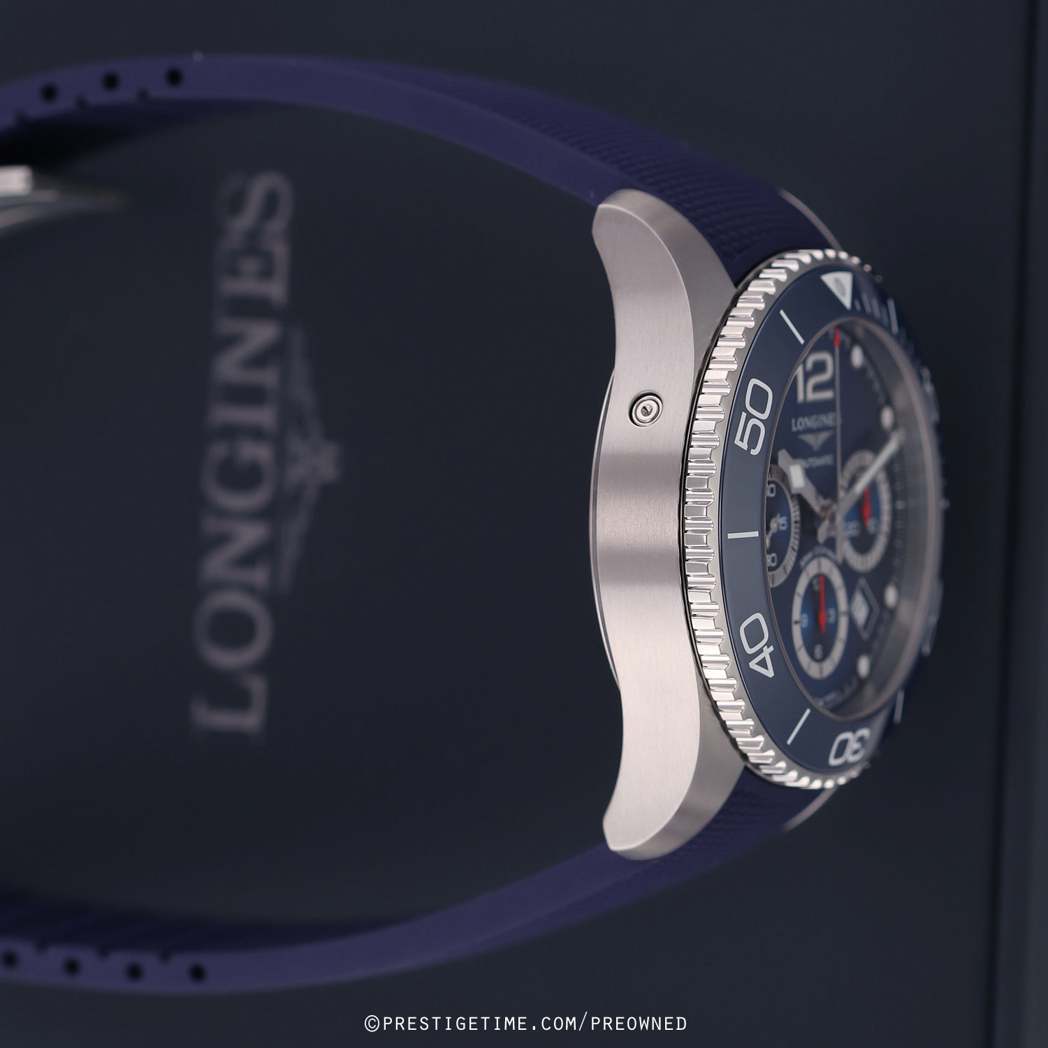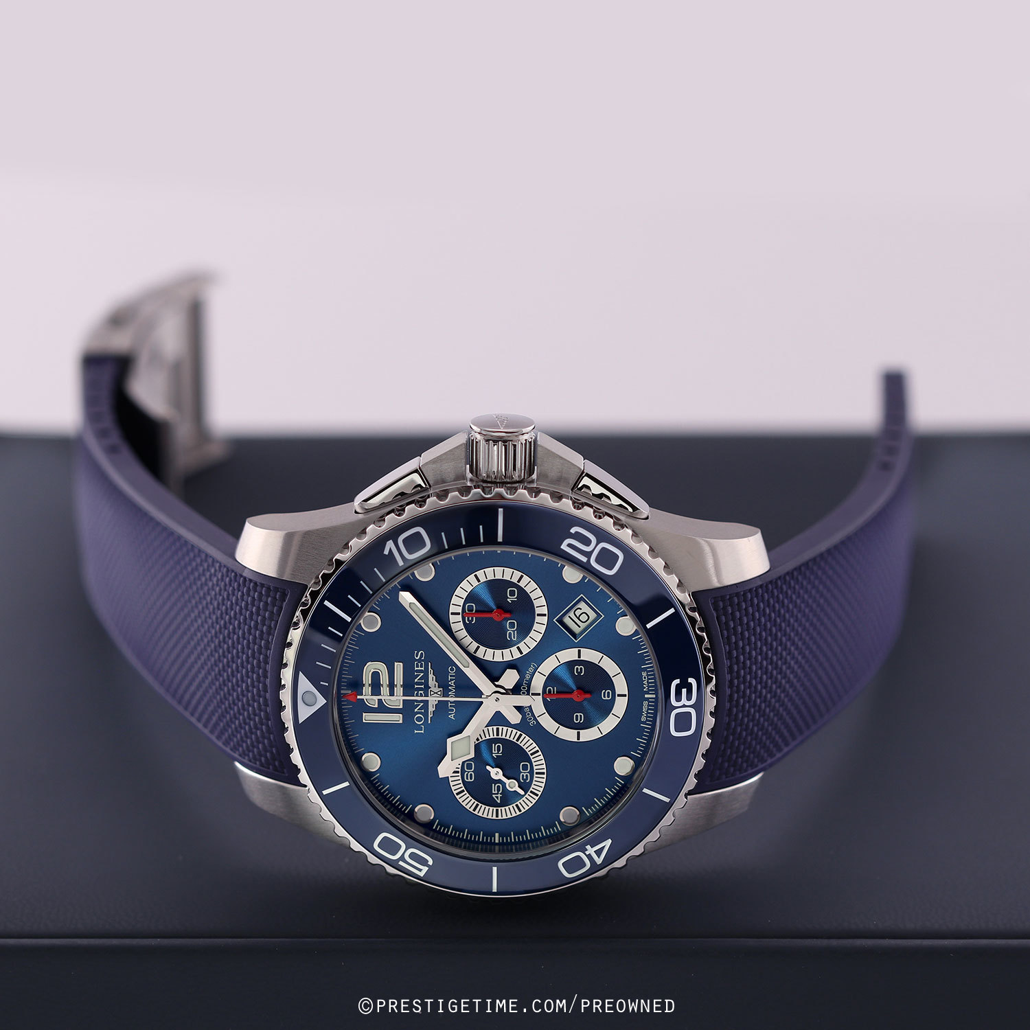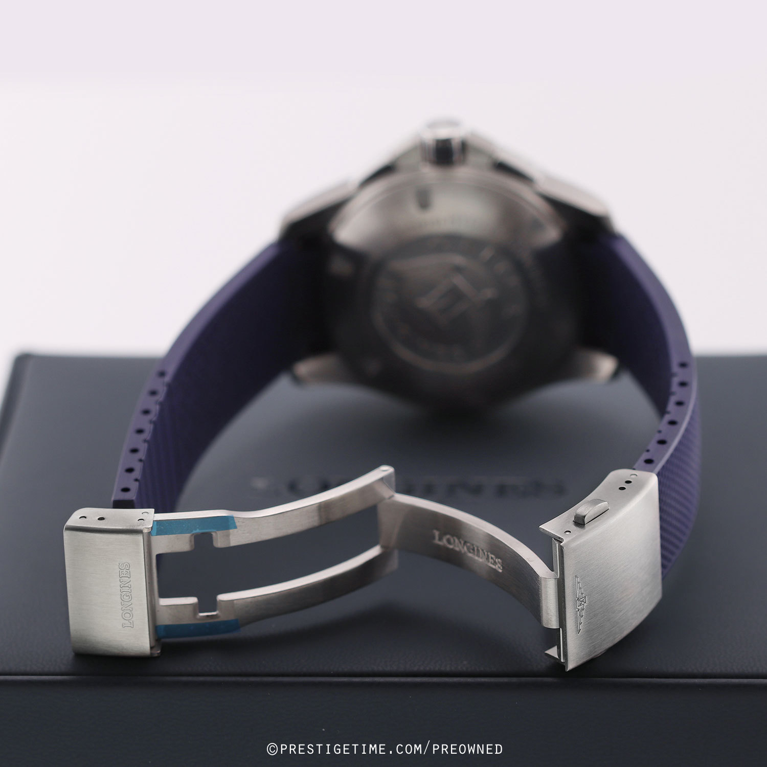 Strap: Fitted on its original Longines blue rubber strap with a push-button folding clasp. The strap is unworn & uncut at its full length which will fit up t o a 9" wrist. The strap will, most likely, need to be cut to size.