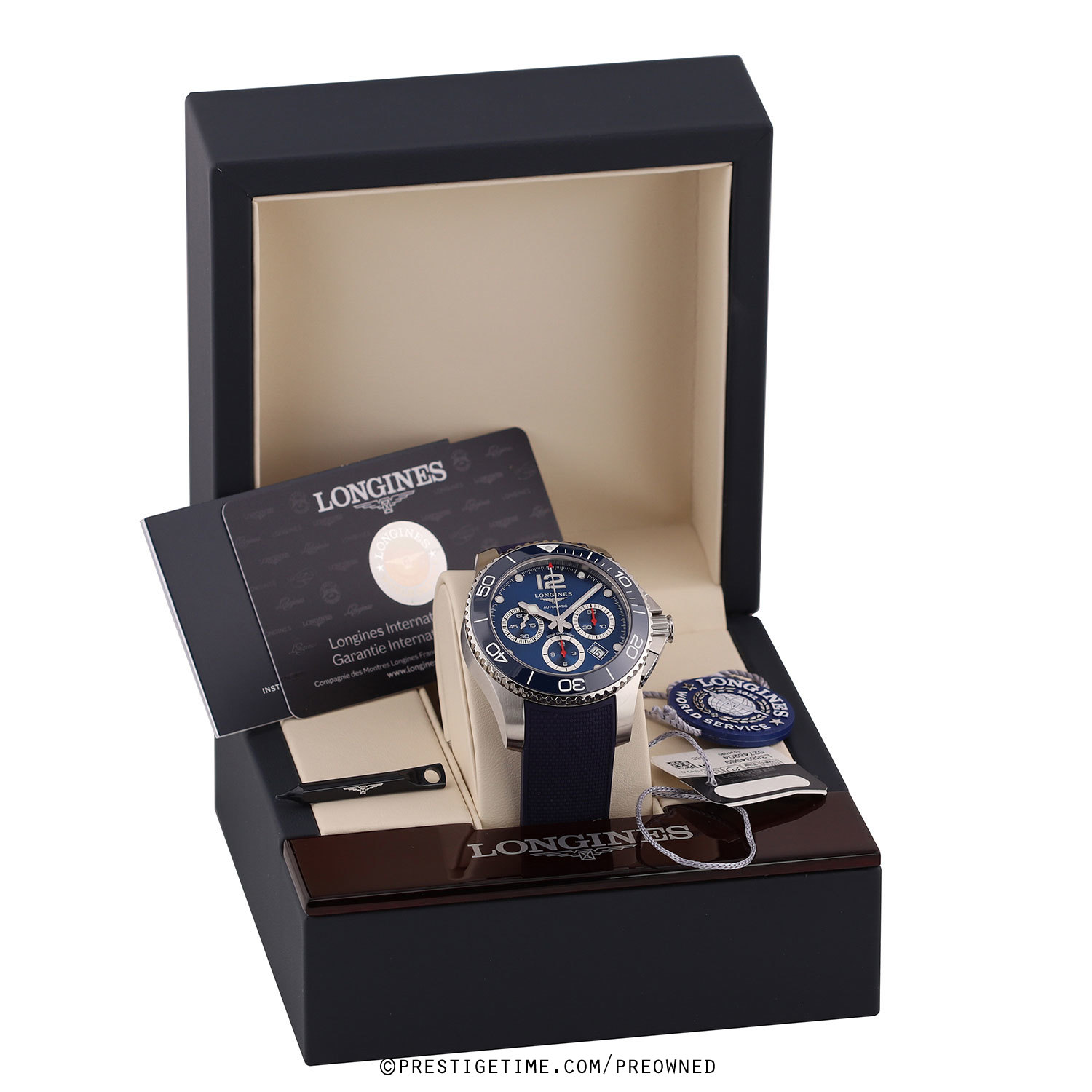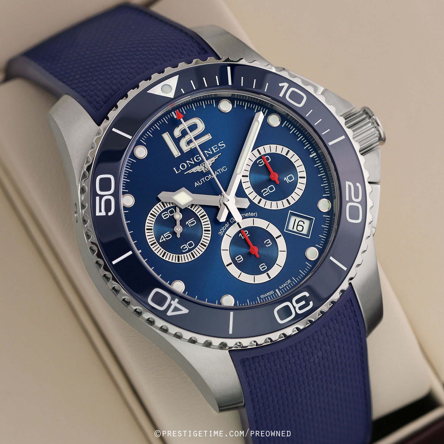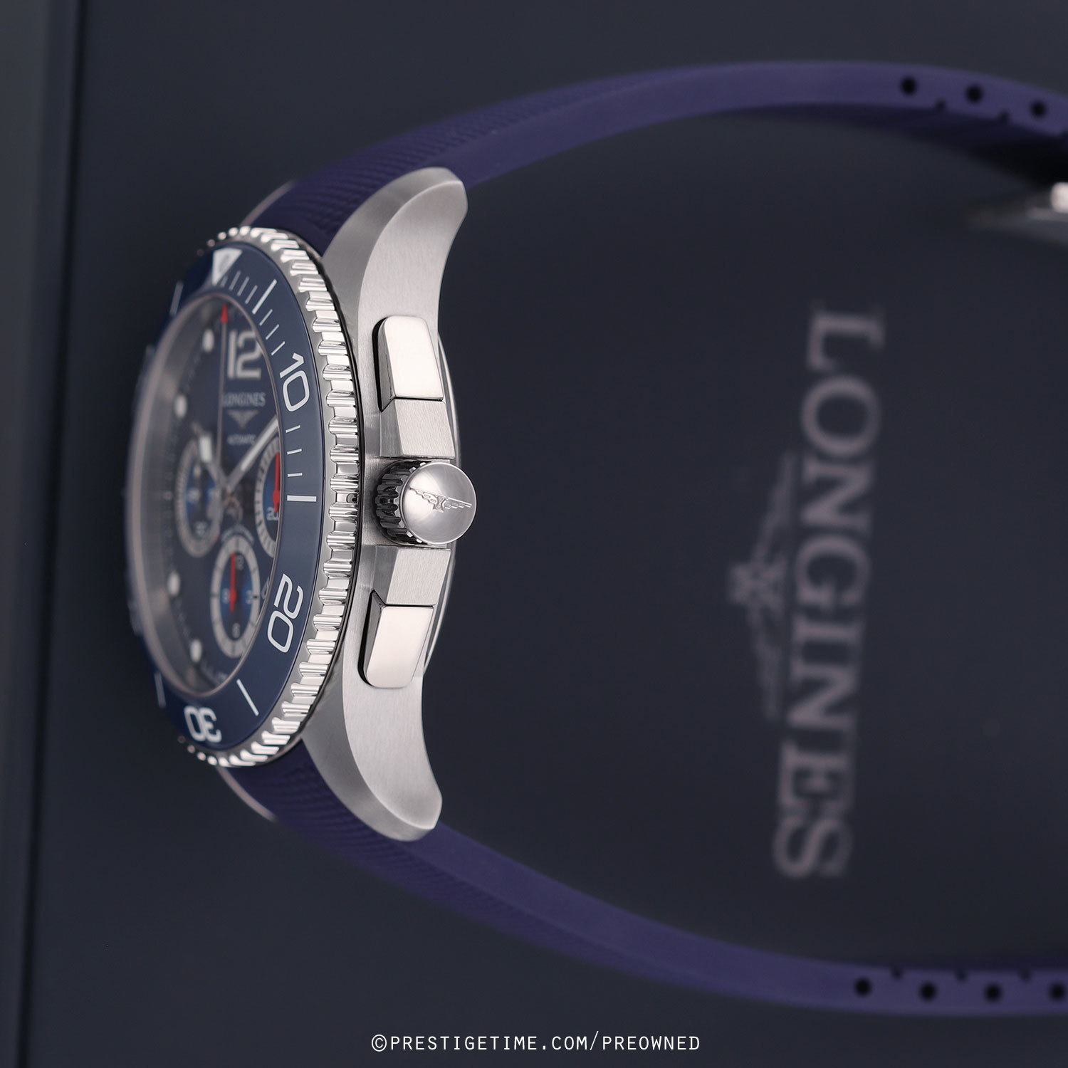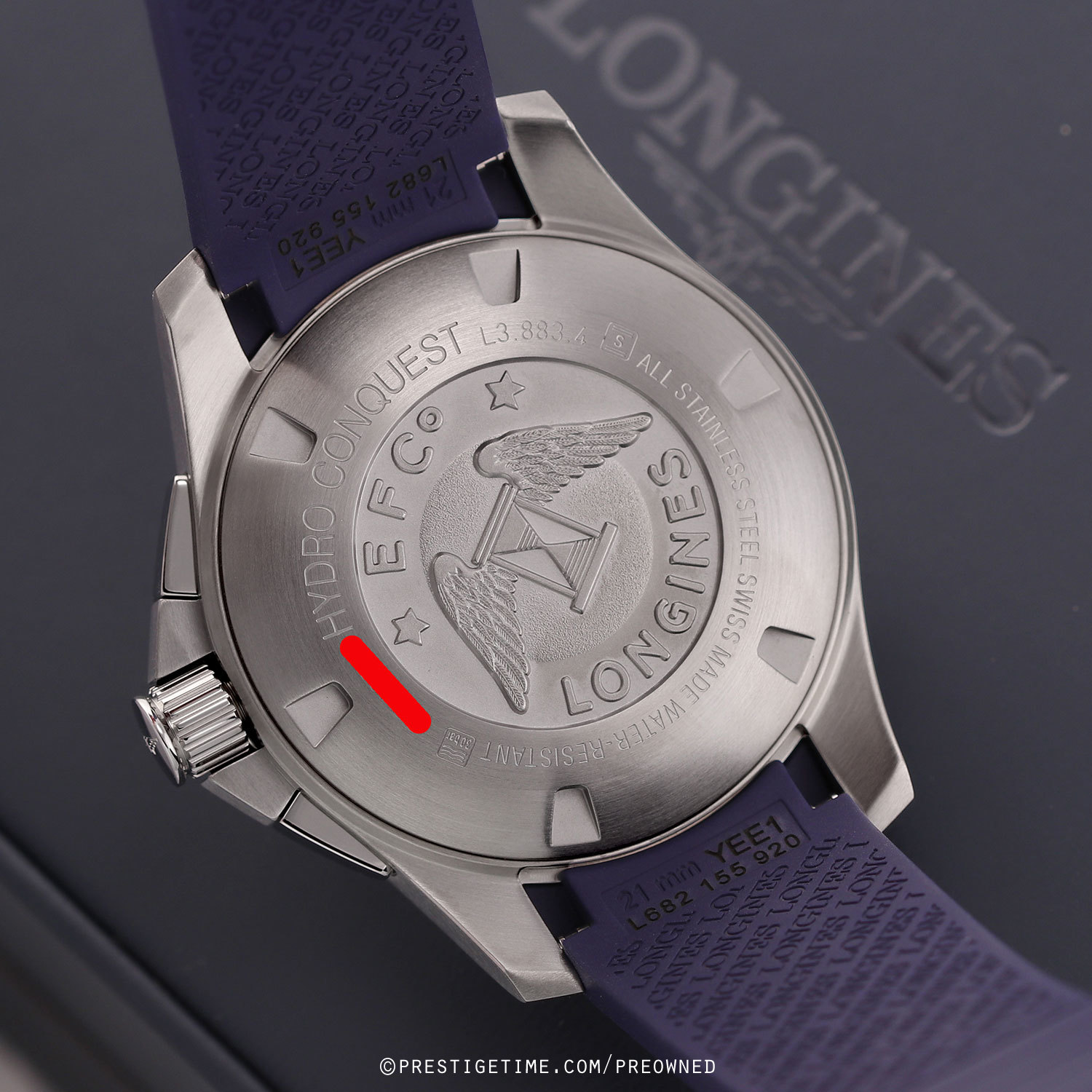 Strap: Fitted on its original Longines blue rubber strap with a push-button folding clasp. The strap is unworn & uncut at its full length which will fit up t o a 9" wrist. The strap will, most likely, need to be cut to size.