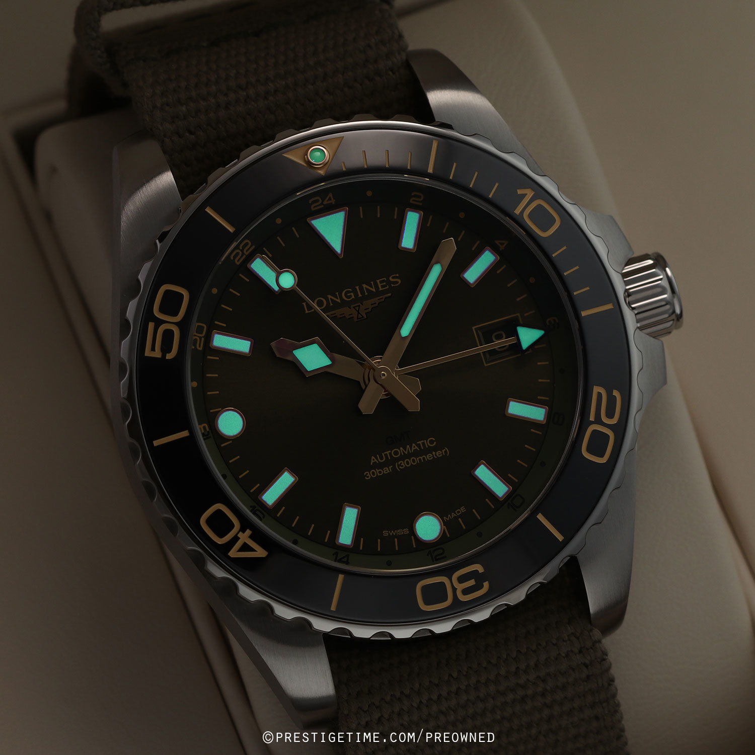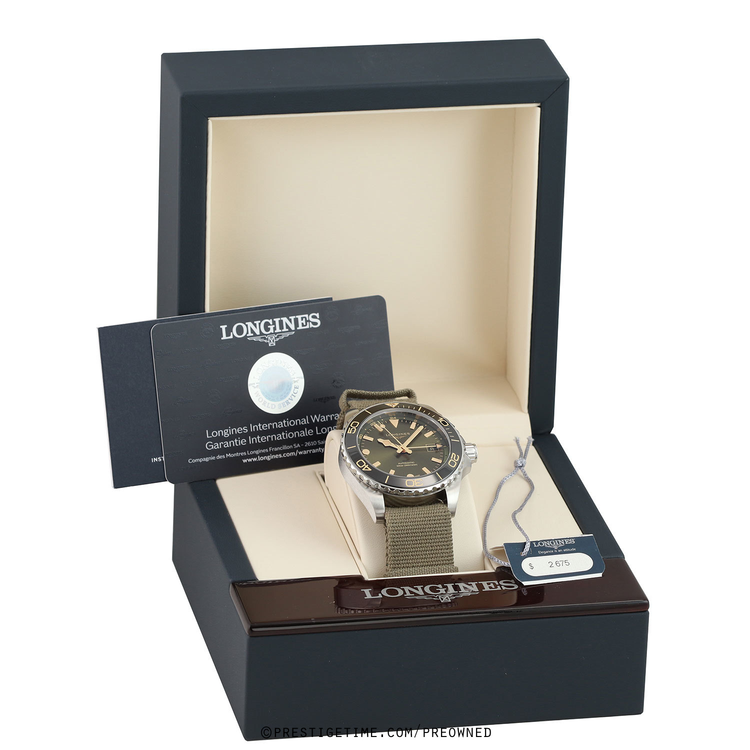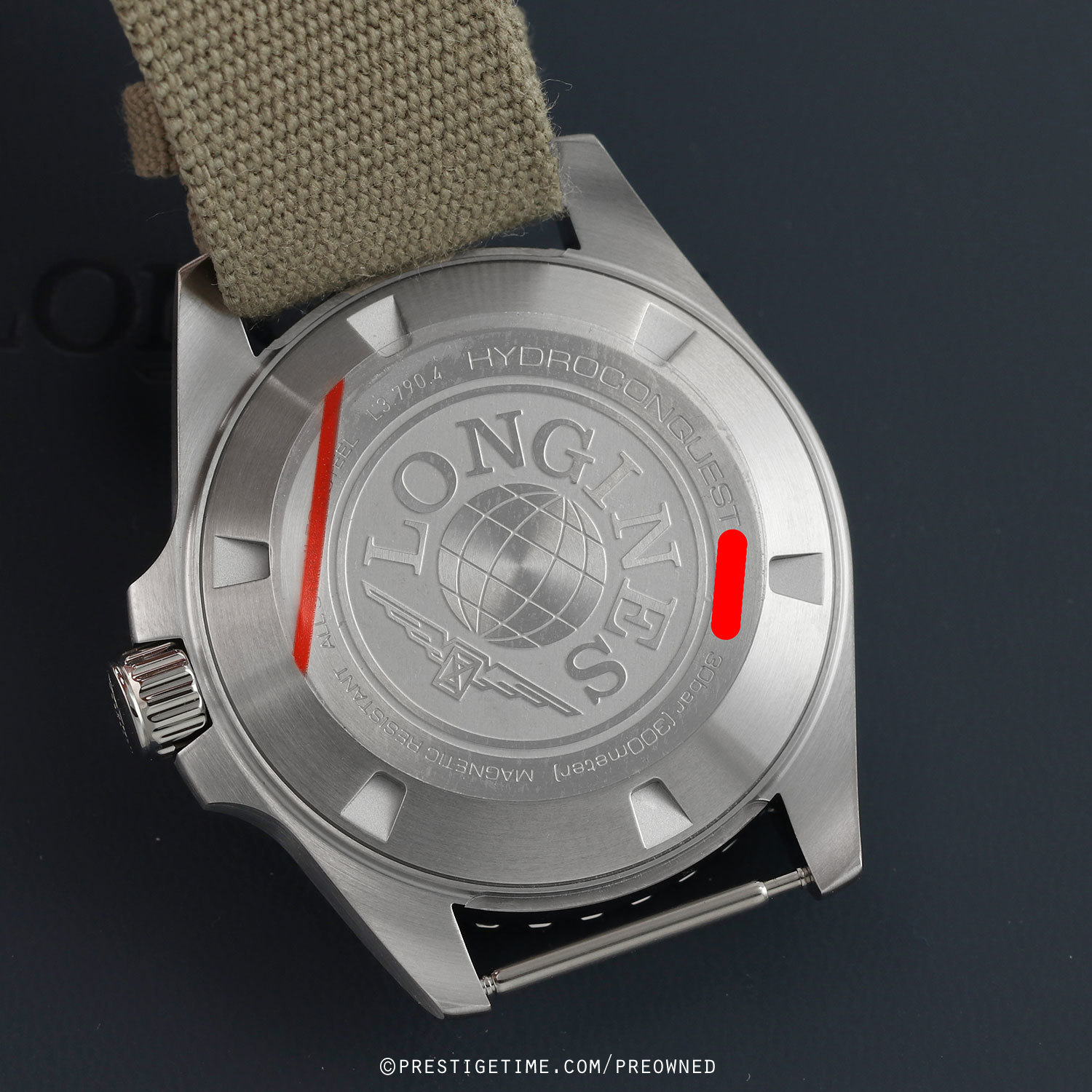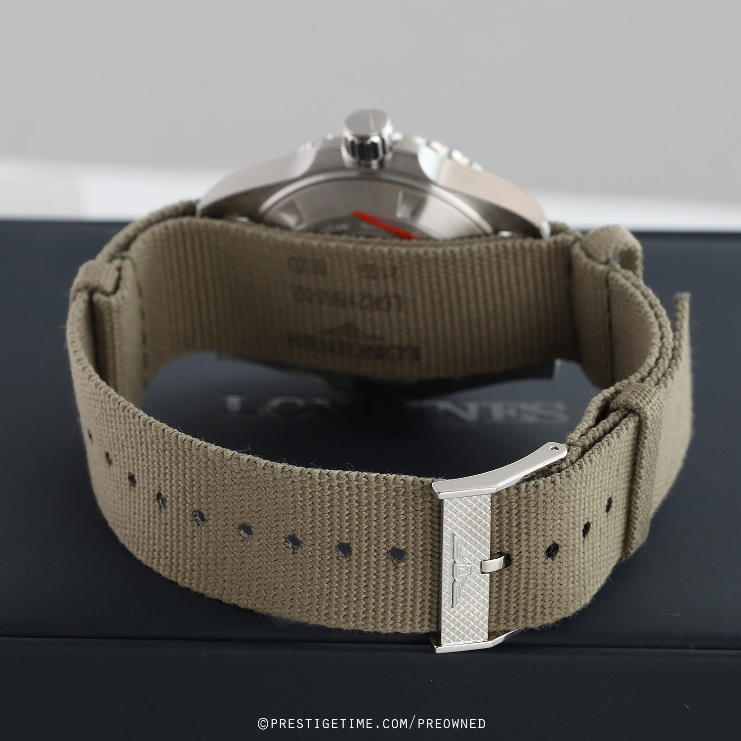 Strap: Fitted on its original Longines khaki green NATO fabric strap with a stainless steel tang buckle. The strap is in pristine near brand new condition with its full wear life-span remaining. We would rate the strap as in 99%