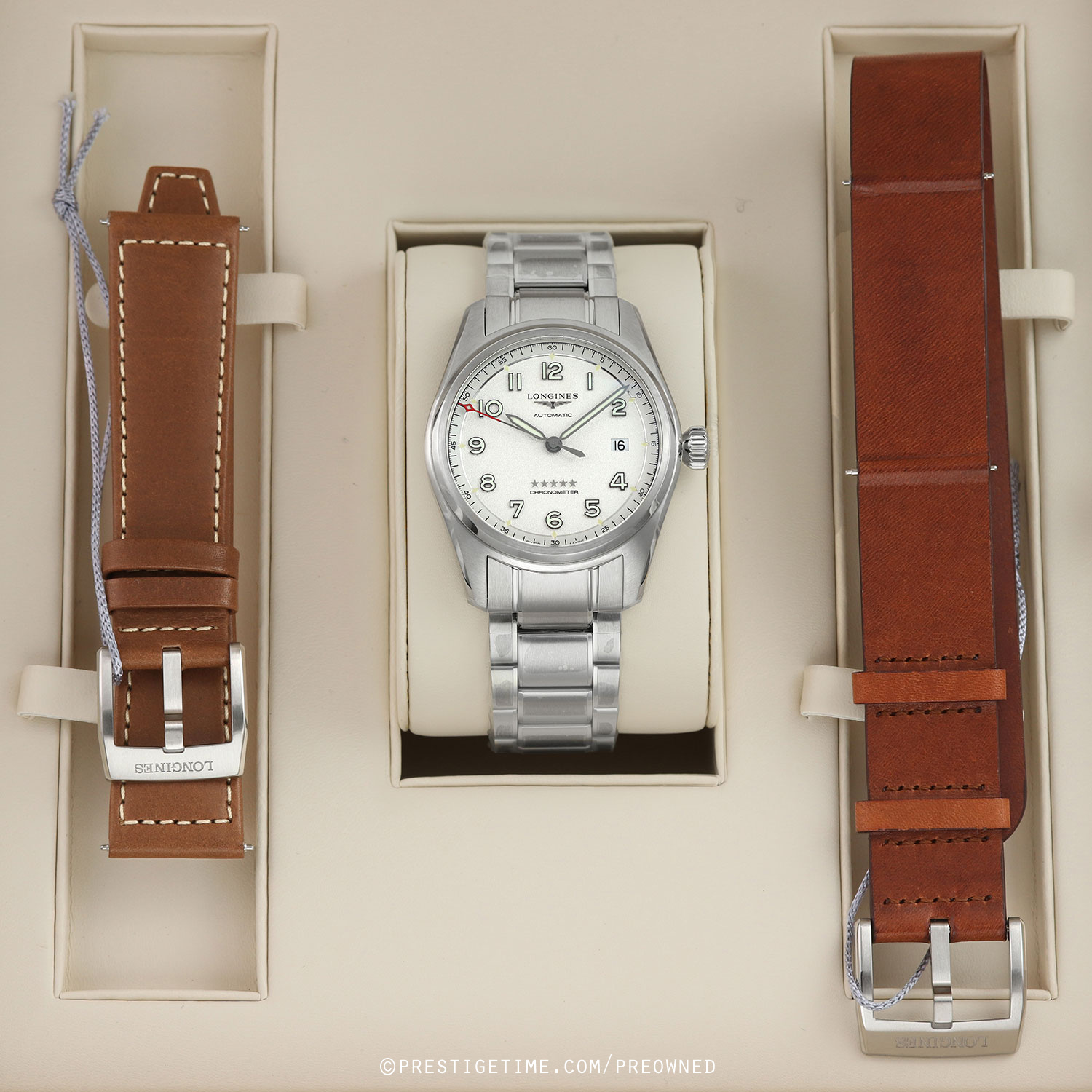 - An additional Longines original honey brown calfskin NATO style strap with a stainless steel tang buckle. This strap is brand new & unworn with its full wear lifespan remaining.