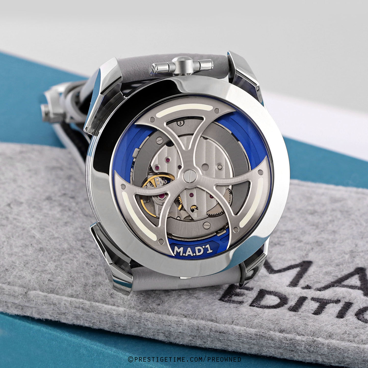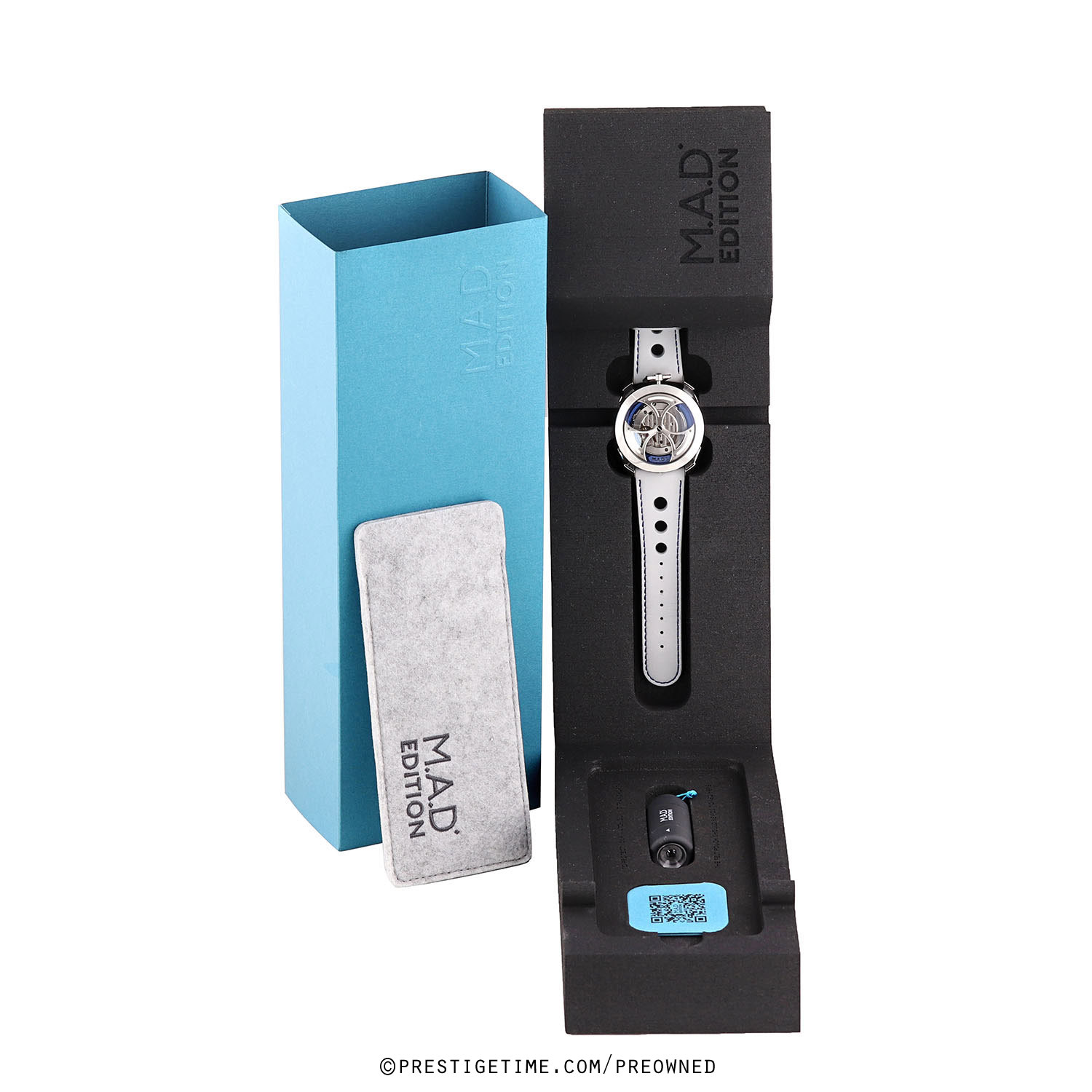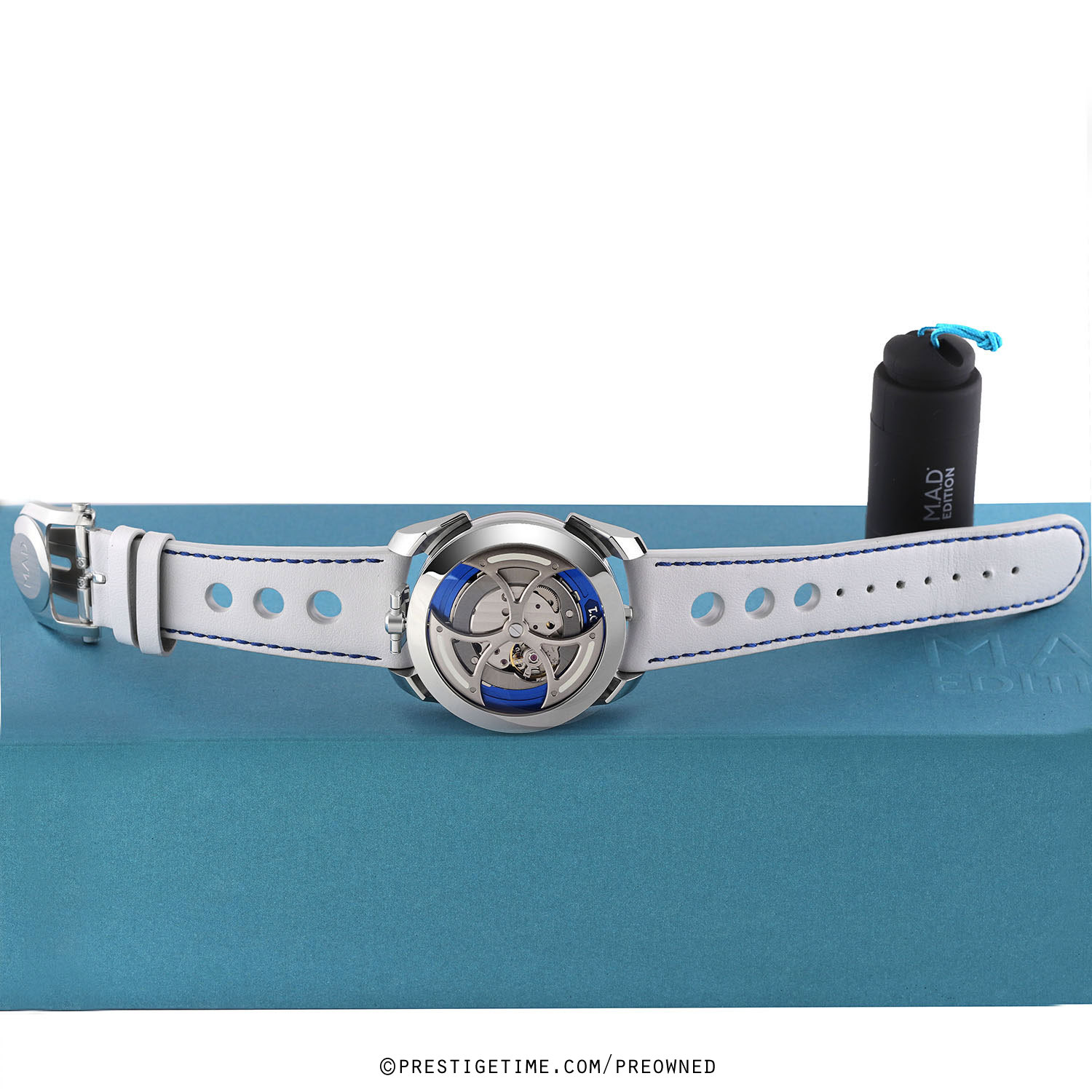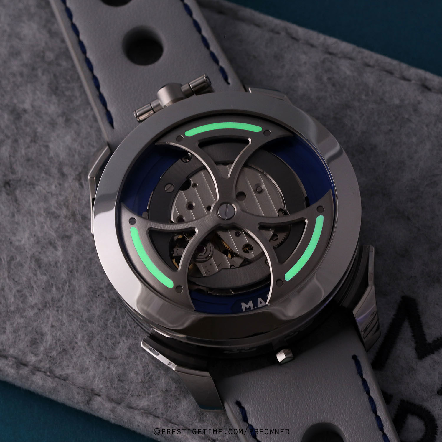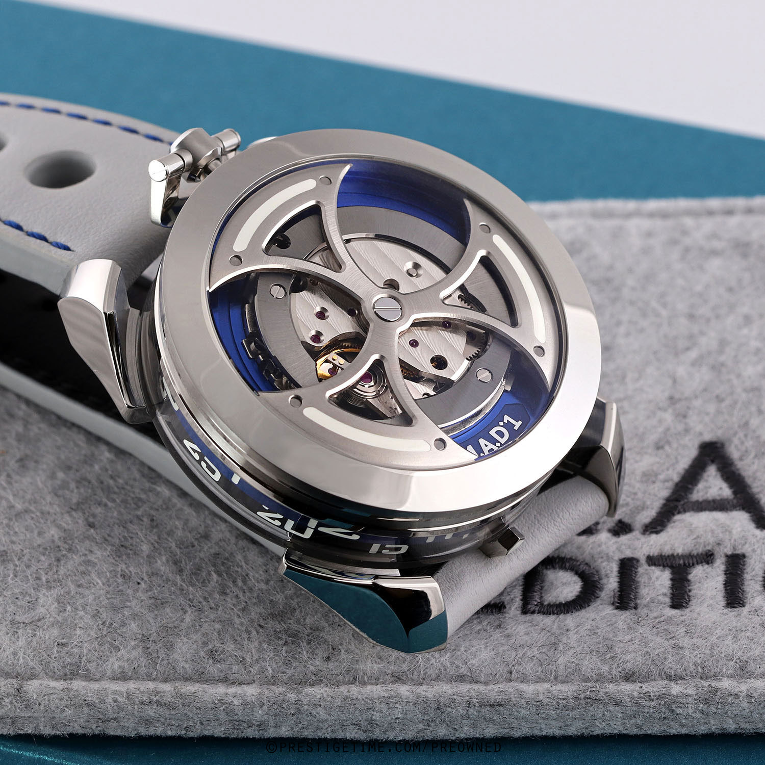 Strap: Fitted on its original MB&F light grey calfskin leather strap with a stainless steel deployant buckle. The strap is excellent near new condition with the vast majority of its wear-lifespan remaining. We would be comfortable grading this strap in 98% condition.
