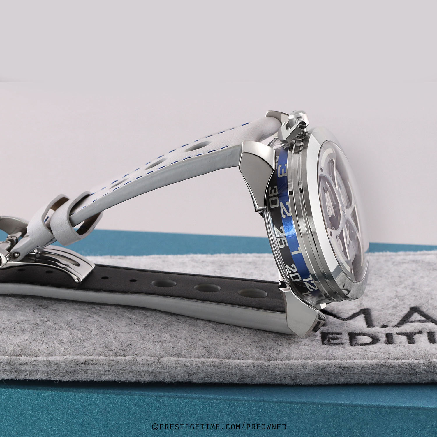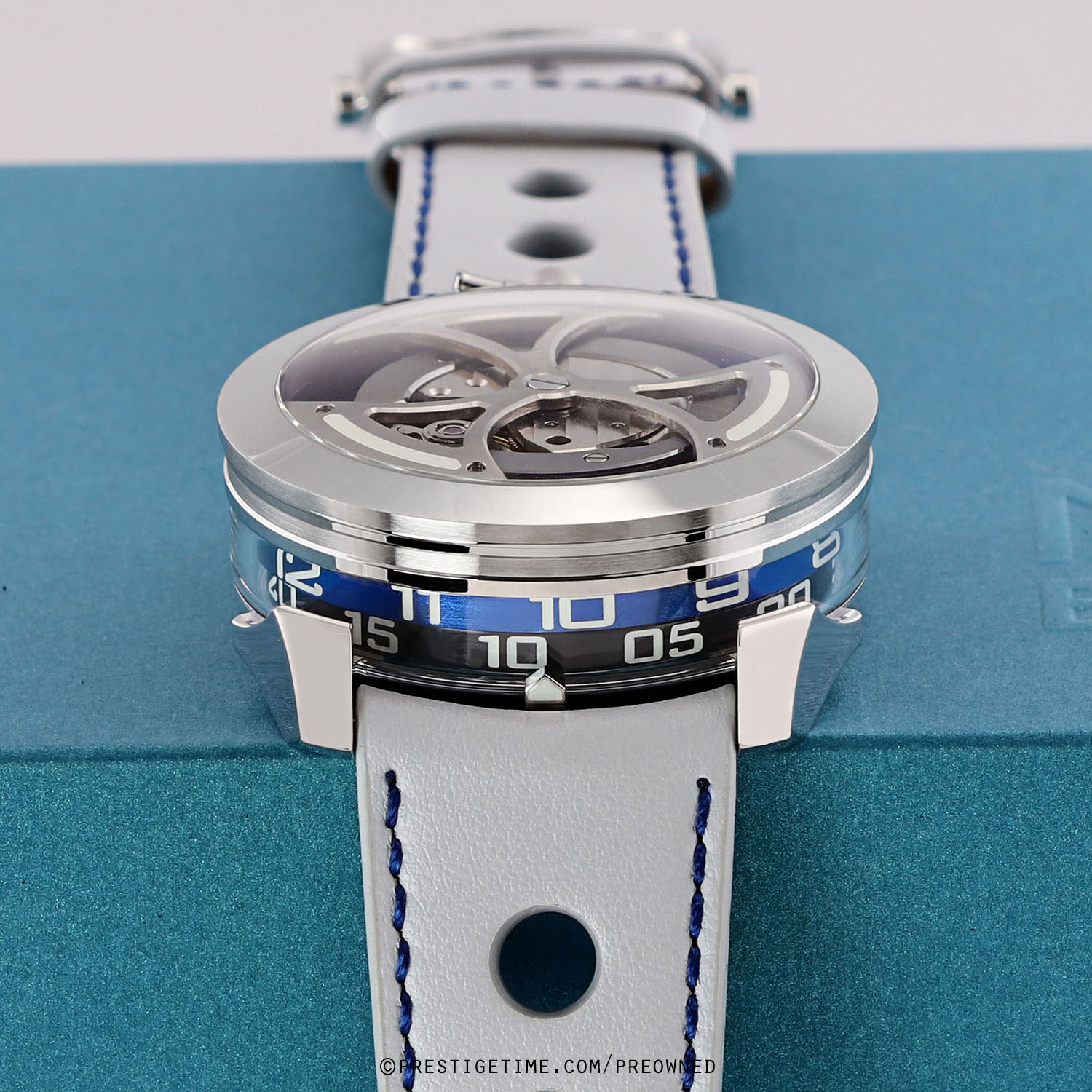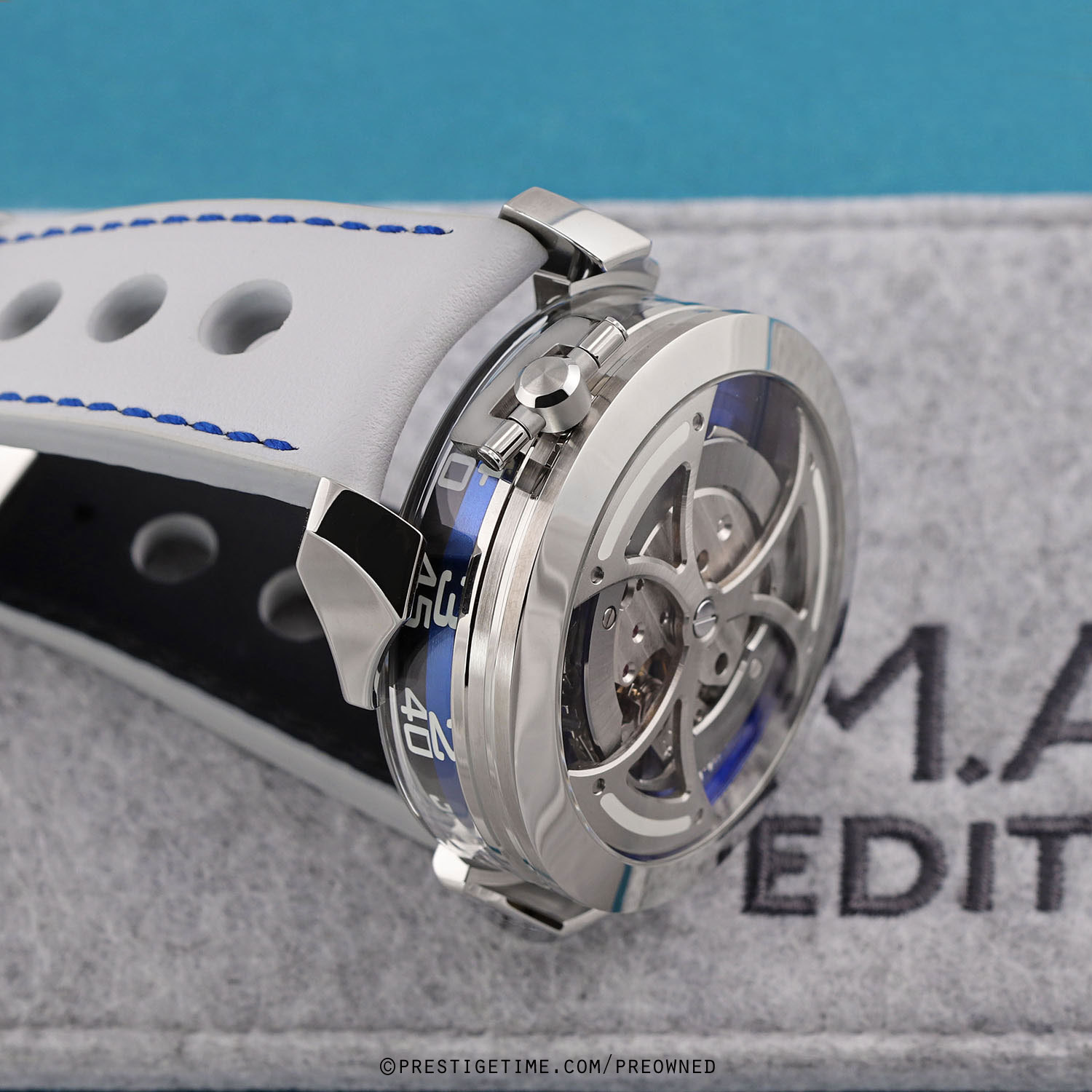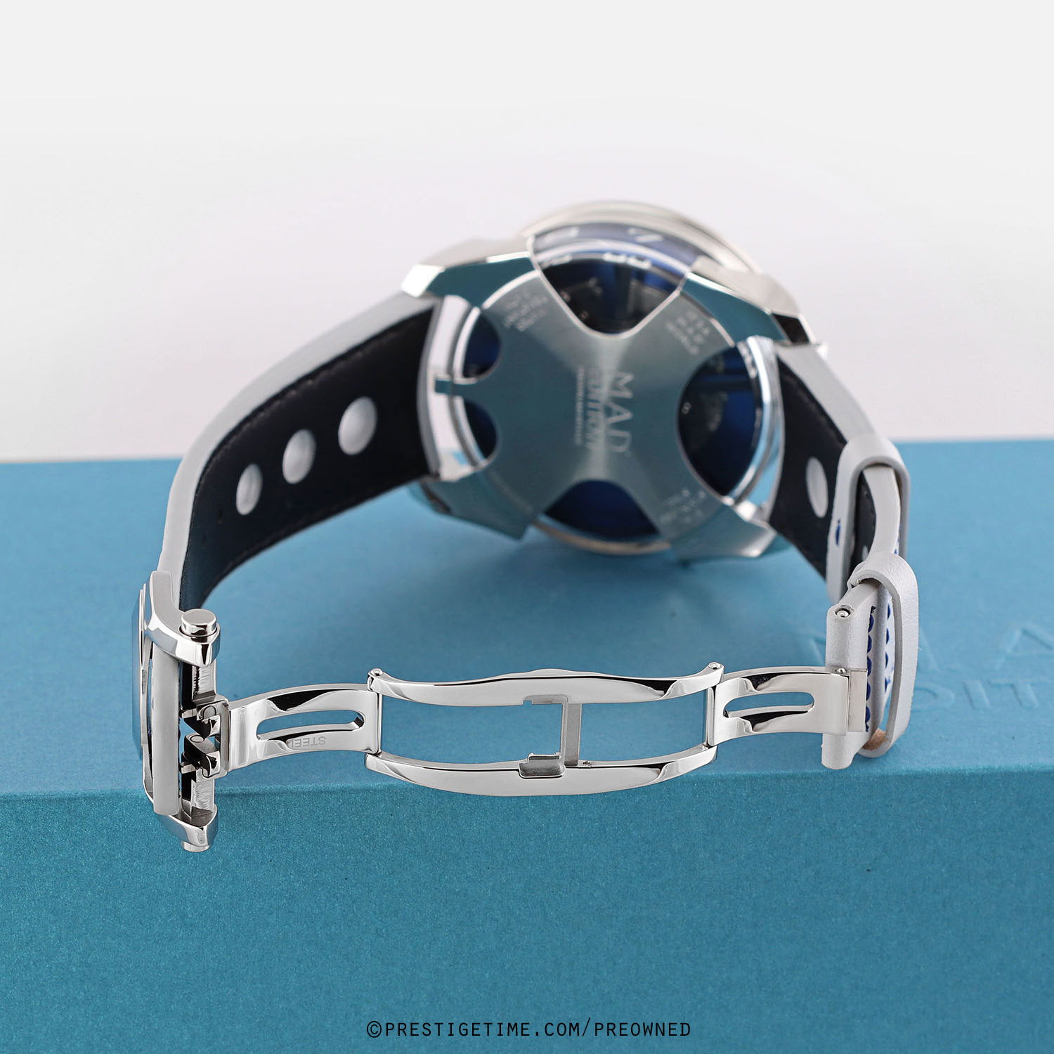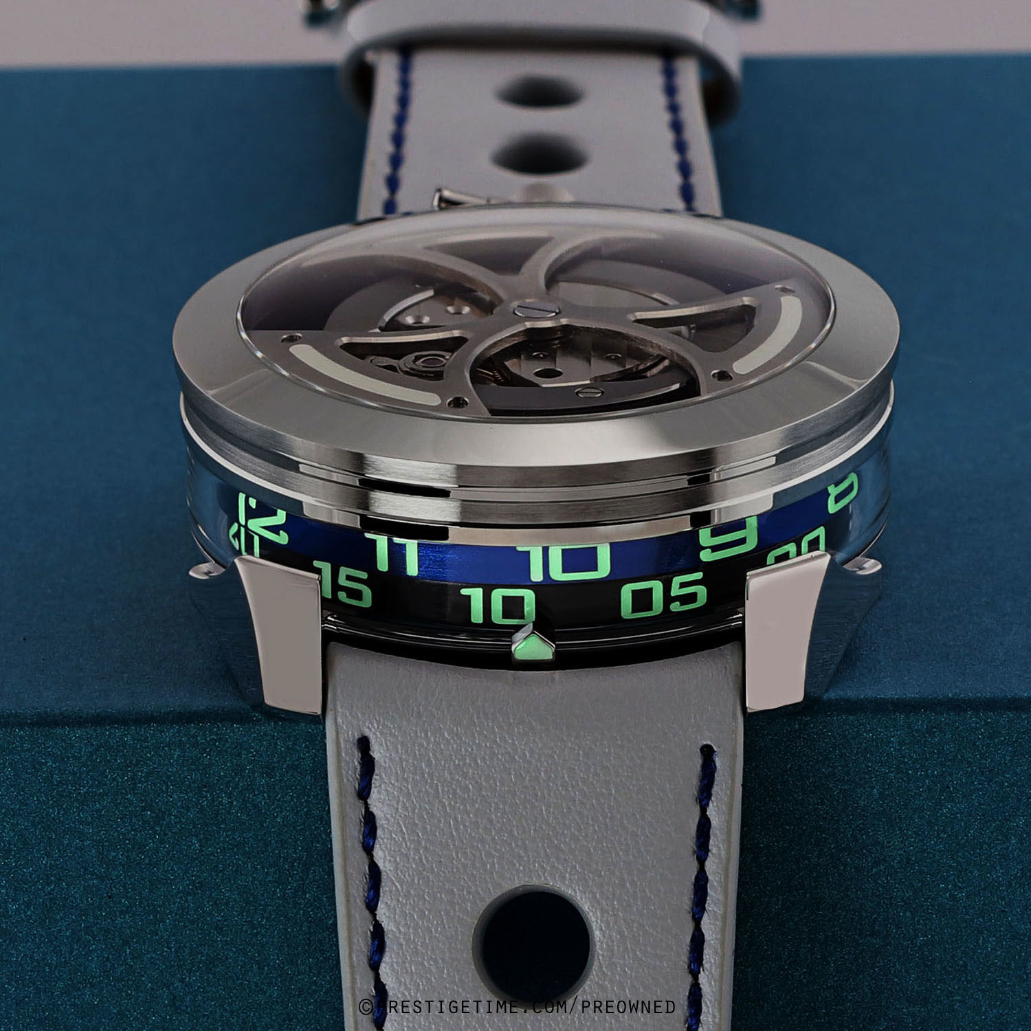 Strap: Fitted on its original MB&F light grey calfskin leather strap with a stainless steel deployant buckle. The strap is excellent near new condition with the vast majority of its wear-lifespan remaining. We would be comfortable grading this strap in 98% condition.