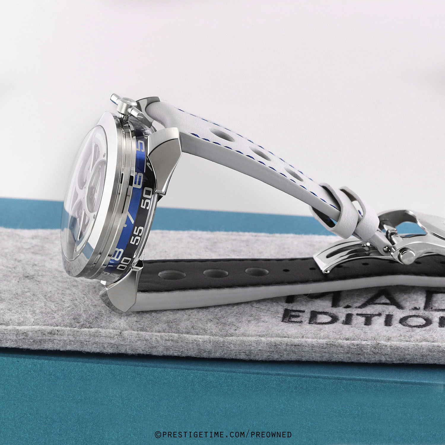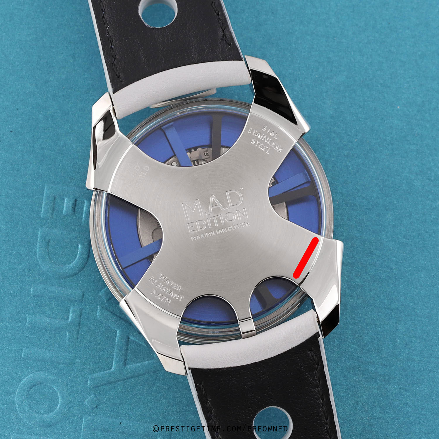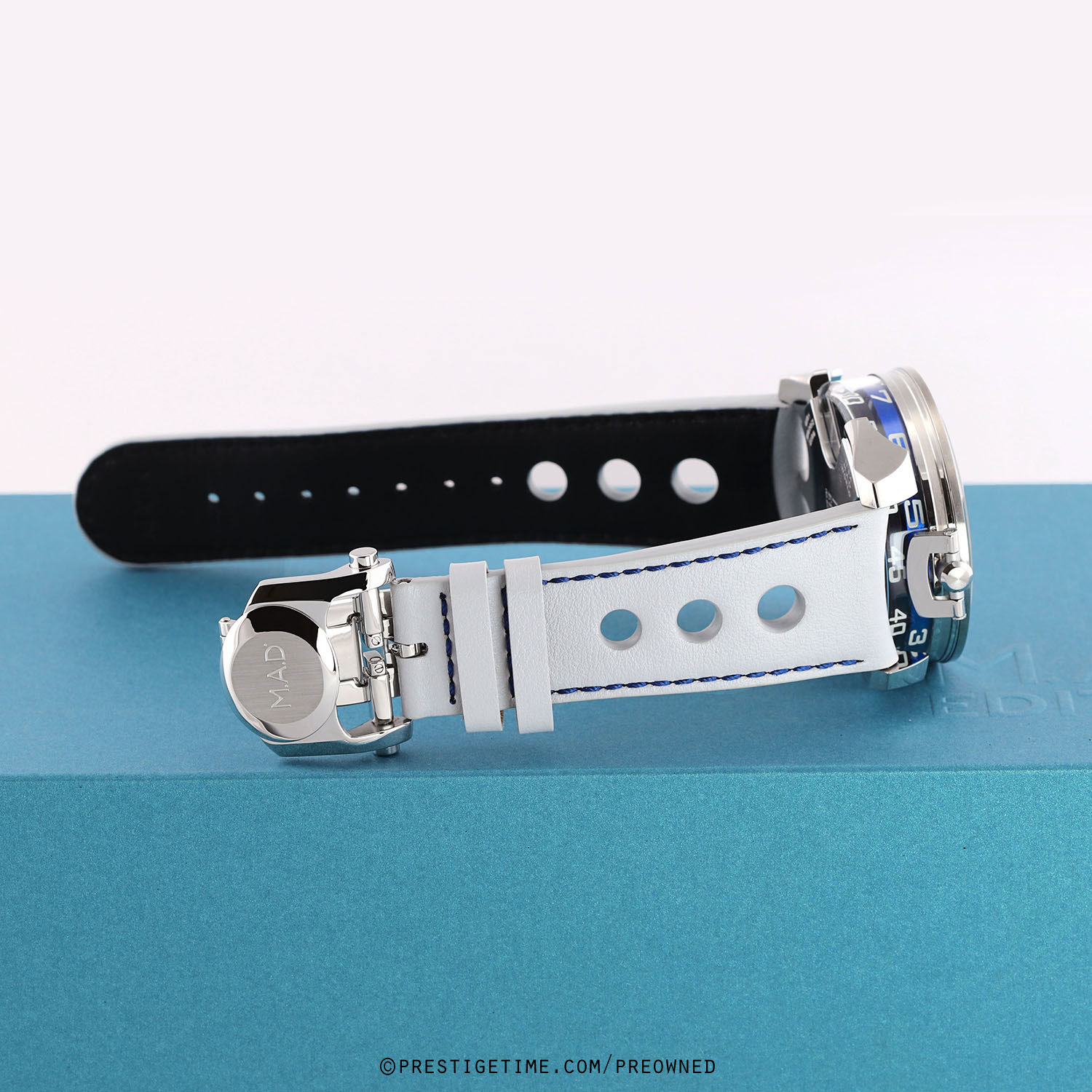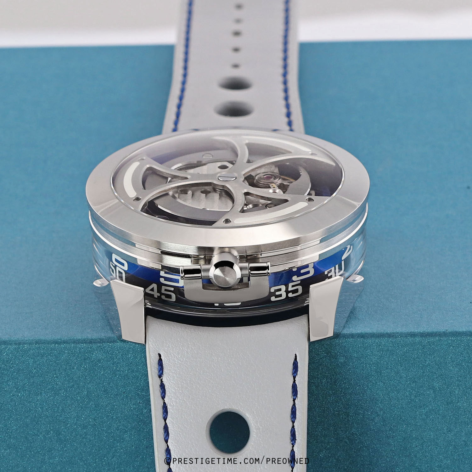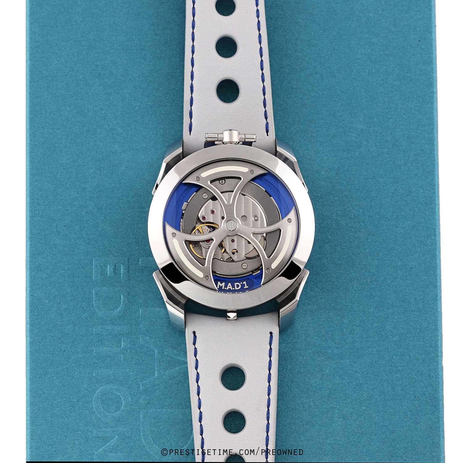Strap: Fitted on its original MB&F light grey calfskin leather strap with a stainless steel deployant buckle. The strap is excellent near new condition with the vast majority of its wear-lifespan remaining. We would be comfortable grading this strap in 98% condition.