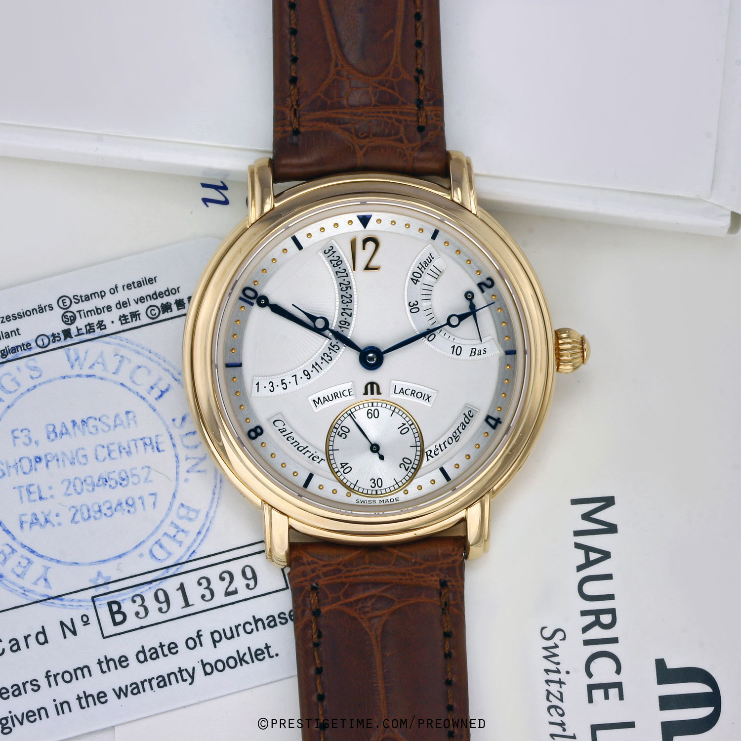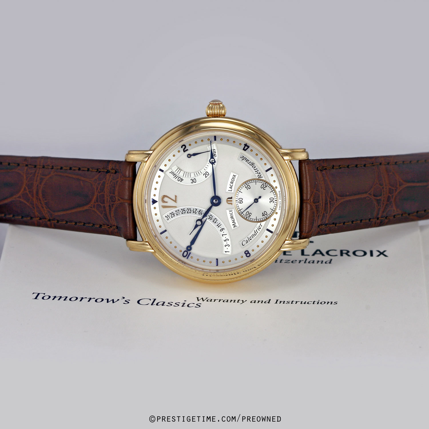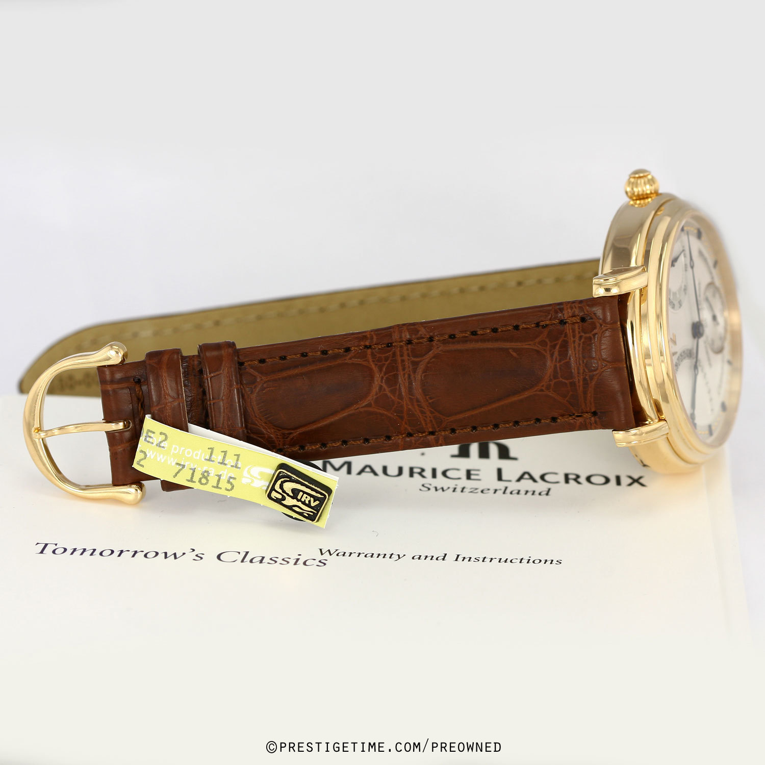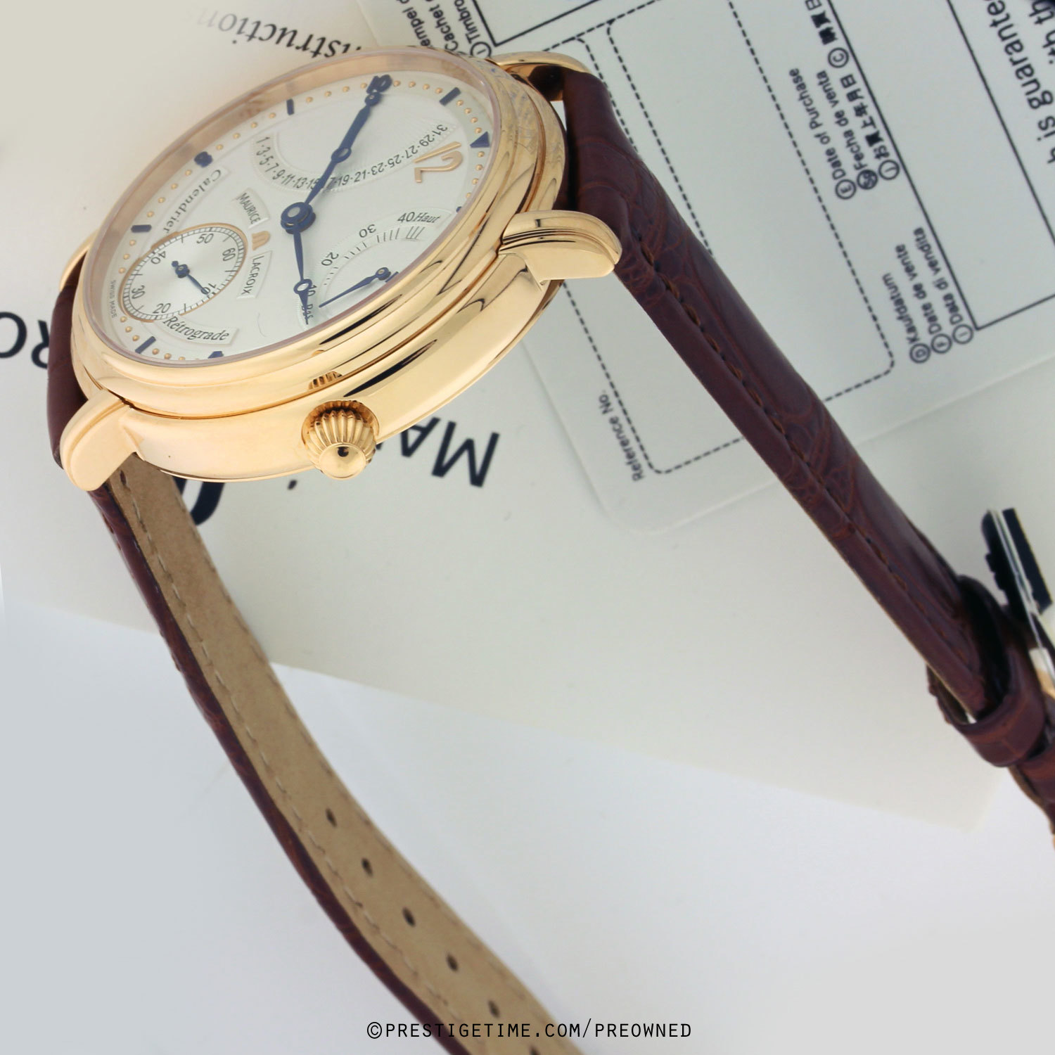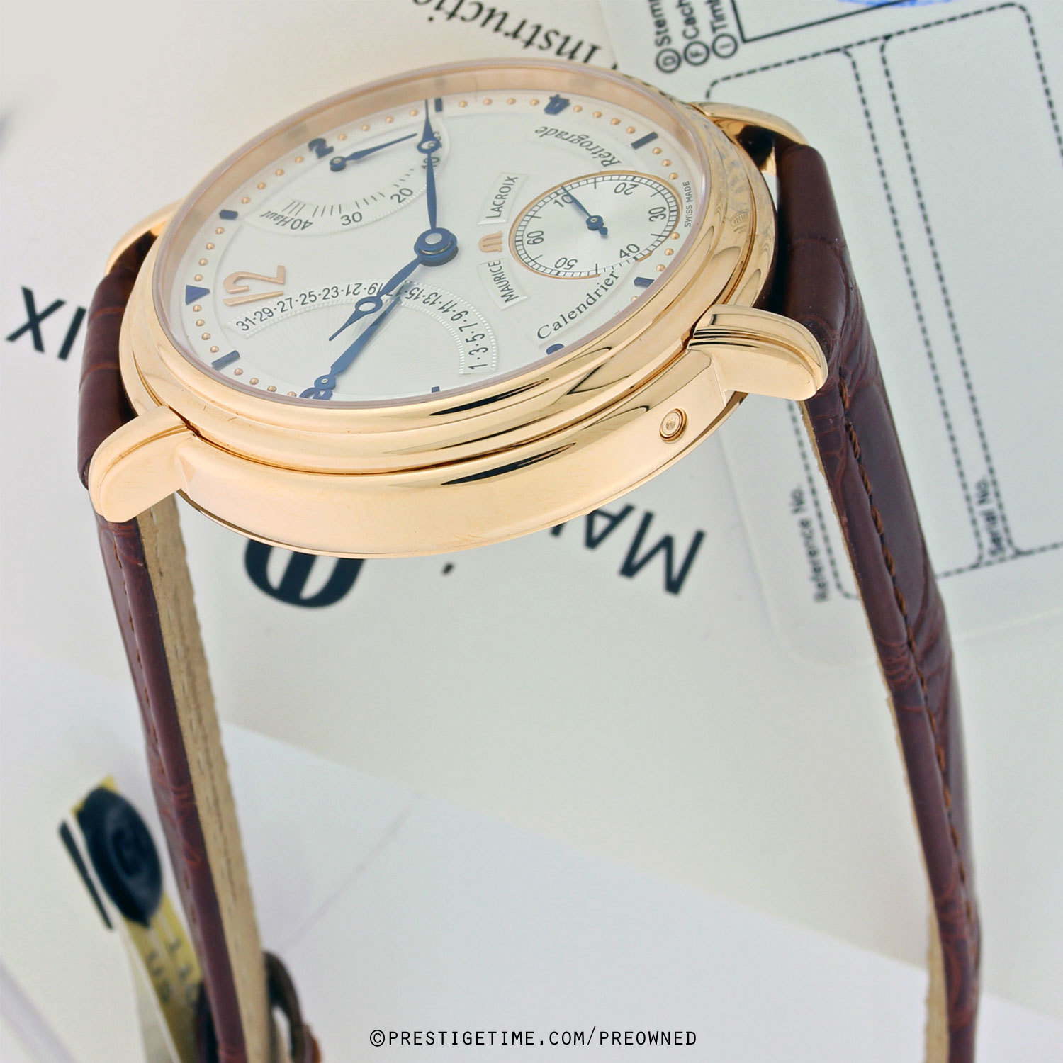 Fitted on a brand new unworn Maurice Lacroix original brown alligator leather strap with a solid rose gold Maurice Lacroix tang buckle.