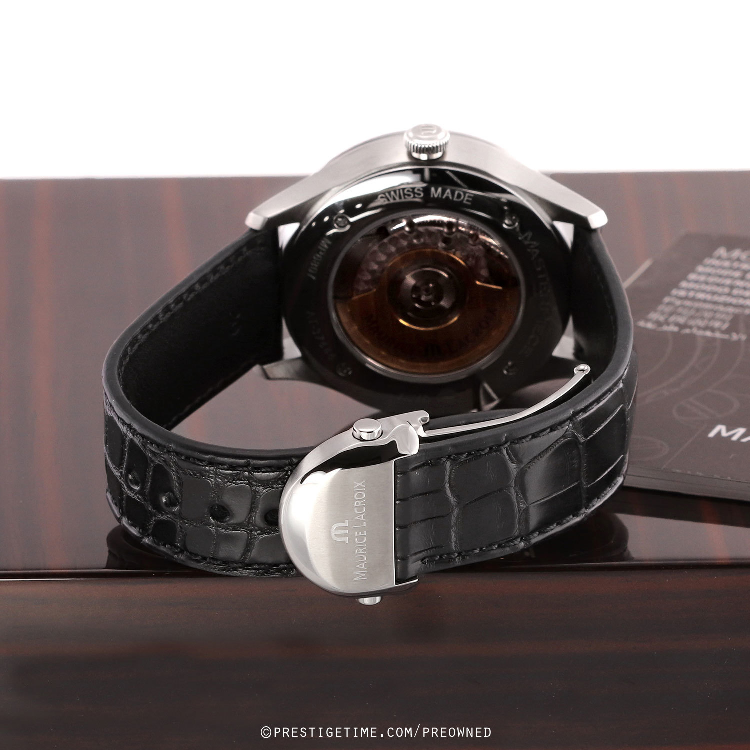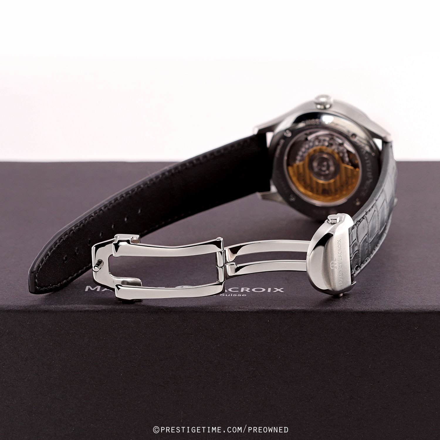 Strap: Fitted with its original Maurice Lacroix black calfskin strap with alligator print & a stainless steel deployant buckle. The strap is unworn and still crisp with full life remaining.