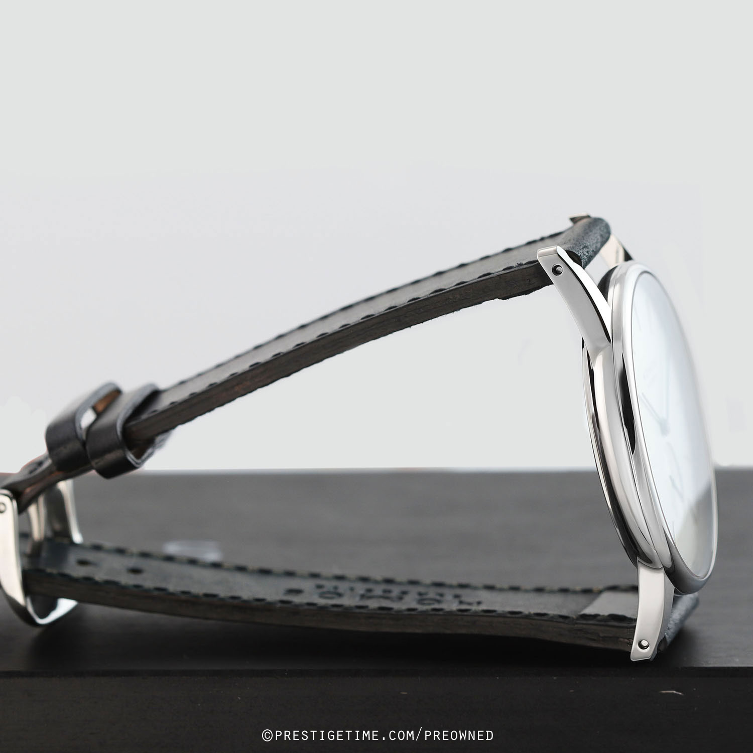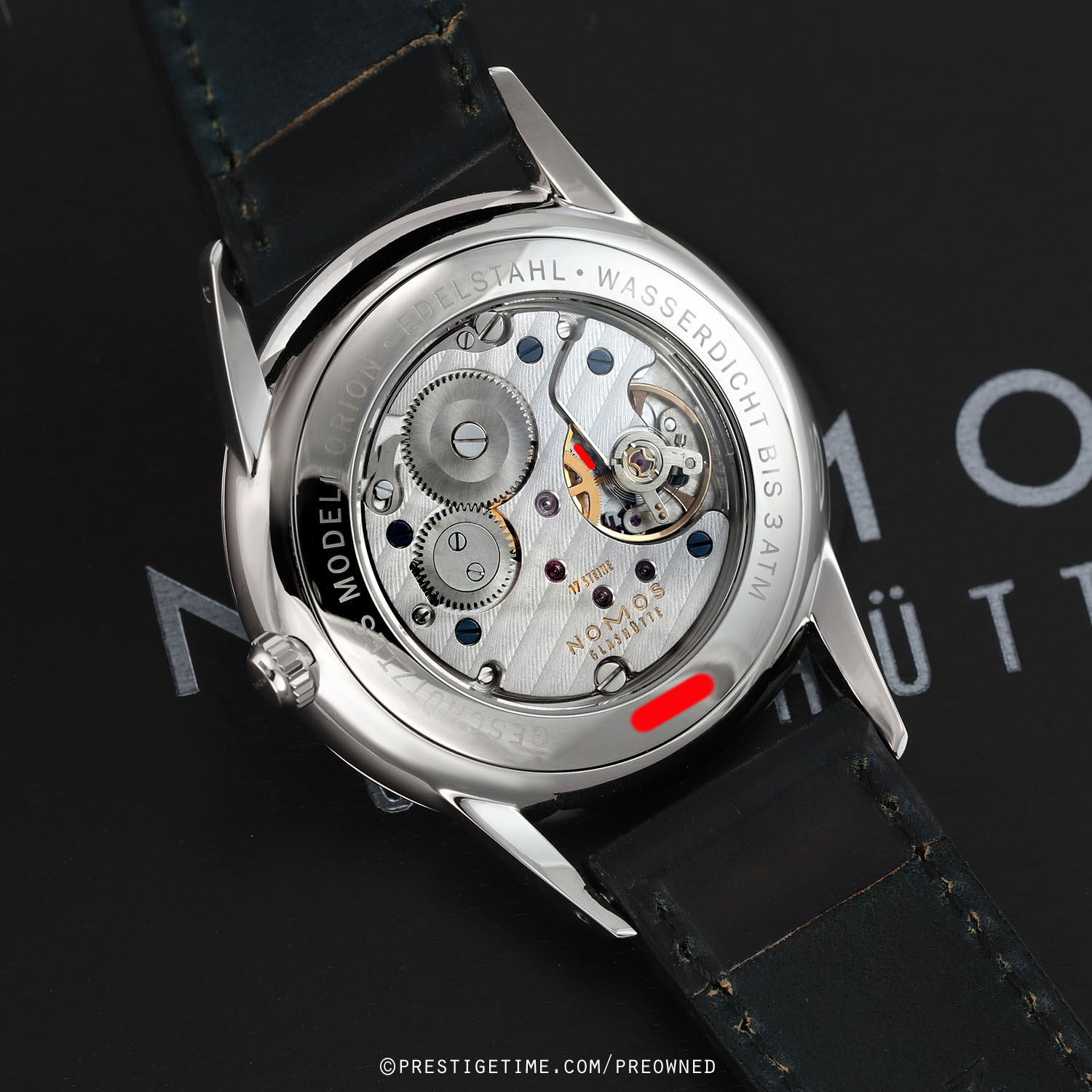 Movement: Powered by a manual winding Nomos in-house caliber α (Alpha), which measures only 2.6mm thick, with 17 jewels & a power reserve of +/- 43 hours. The movement is beautifully finished with tempered blued steel screws & rhodium plated surfaces with Glashütte ribbing and NOMOS perlage decoration.