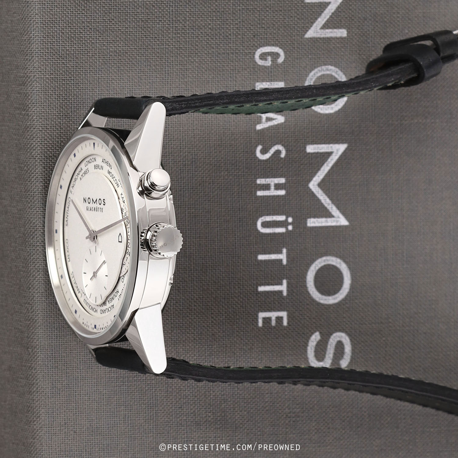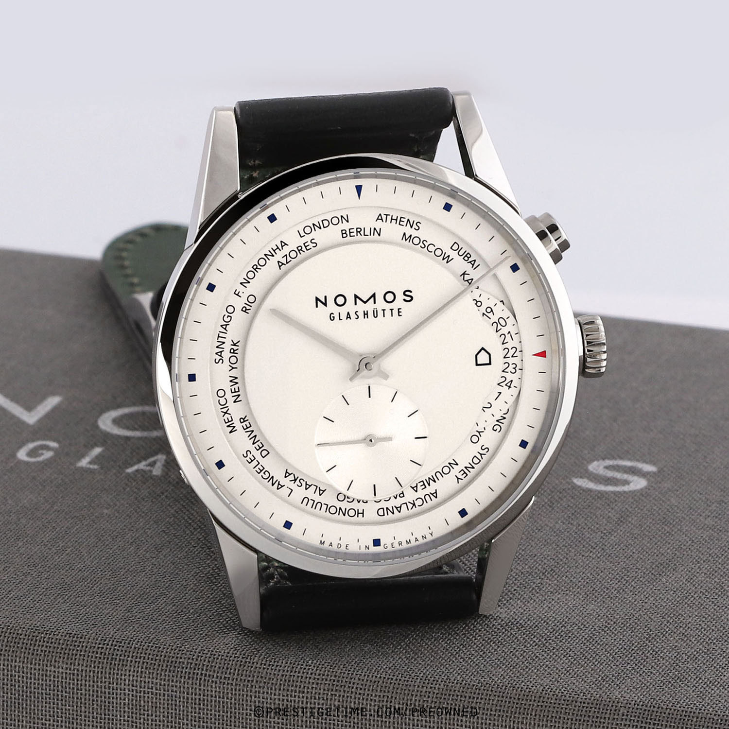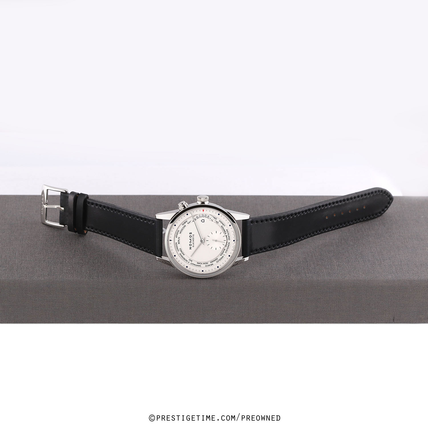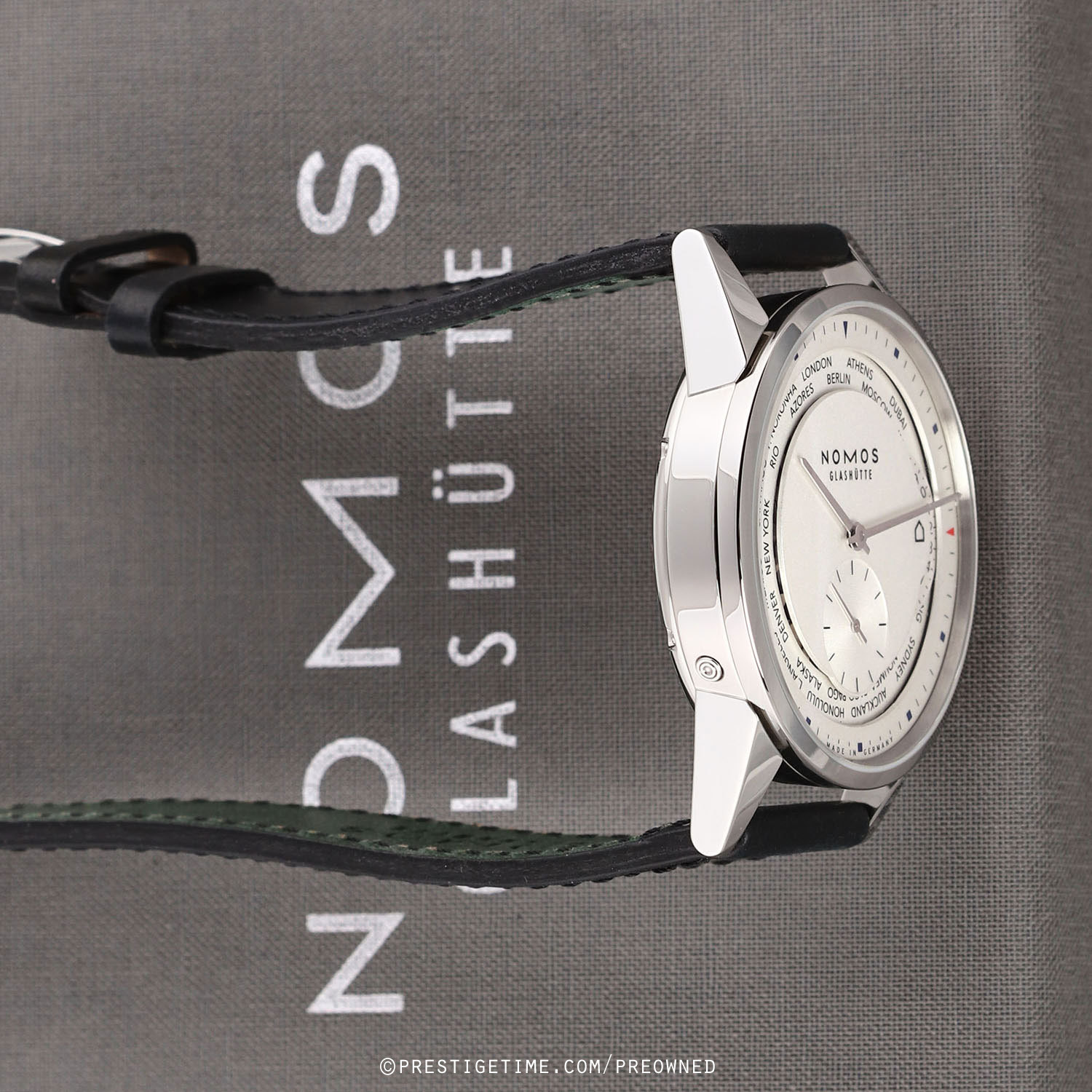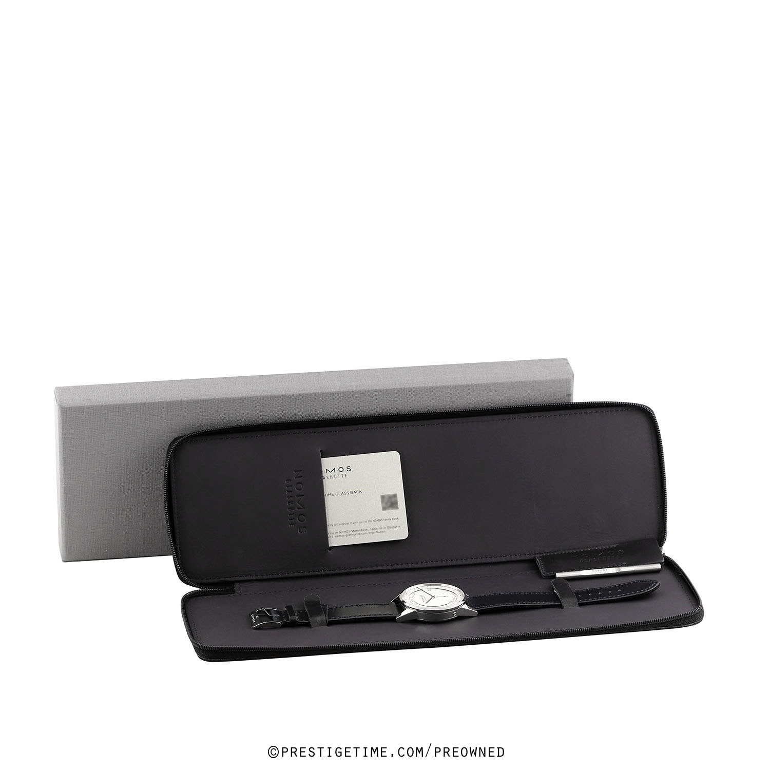 Strap: Fitted on its original NOMOS Glashutte black Horween genuine shell cordovan (horse-hide) leather strap with a polished stainless steel tang buckle. The strap is in new & unworn condition with its full wear lifespan remaining.