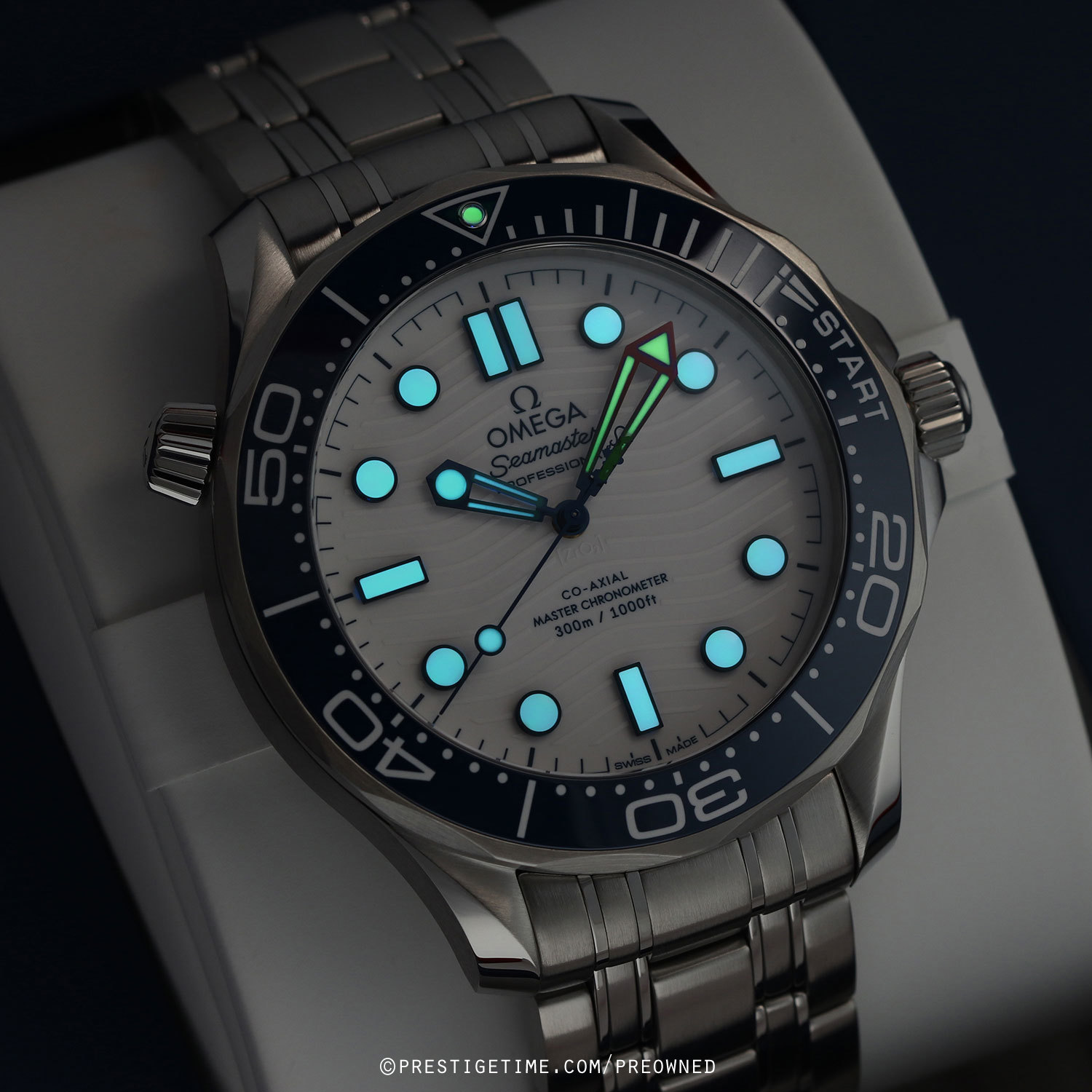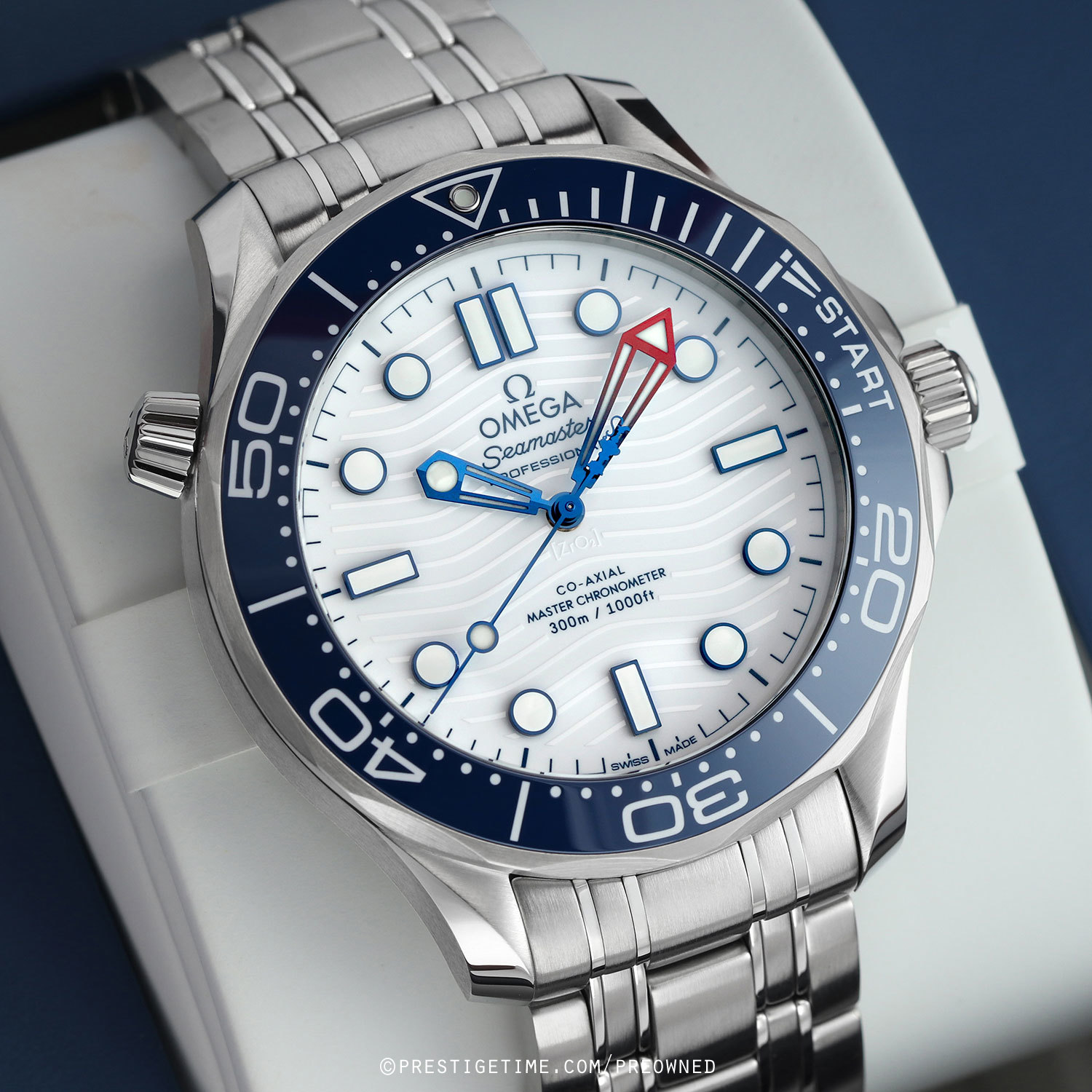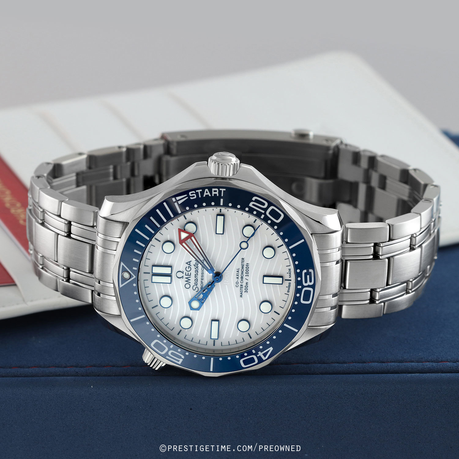 Case: Brushed stainless steel case with polished beveled corners. Helium escape valve at 10 o'clock. Stainless steel bezel with a polished blue ceramic insert featuring a white enamel filled regatta scale with a luminous dot at the starting point. White zirconium oxide [ZrO2] ceramic dial with a laser engraved wave design. Blued hands with luminous filled tips. Applied blued hour markers with luminous fill. Fine printed minute/seconds track.