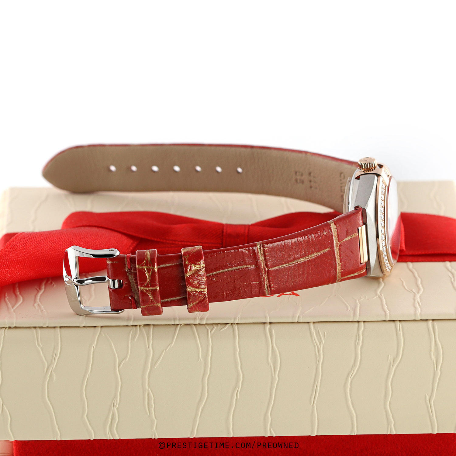 Strap: Presented on its original Omega red-orange alligator strap, highlighted by golden tone accents within the creases to echo the tones of the dial, and with a stainless steel tang buckle. The strap is unworn, in brand new condition with its full wear-lifespan remaining.