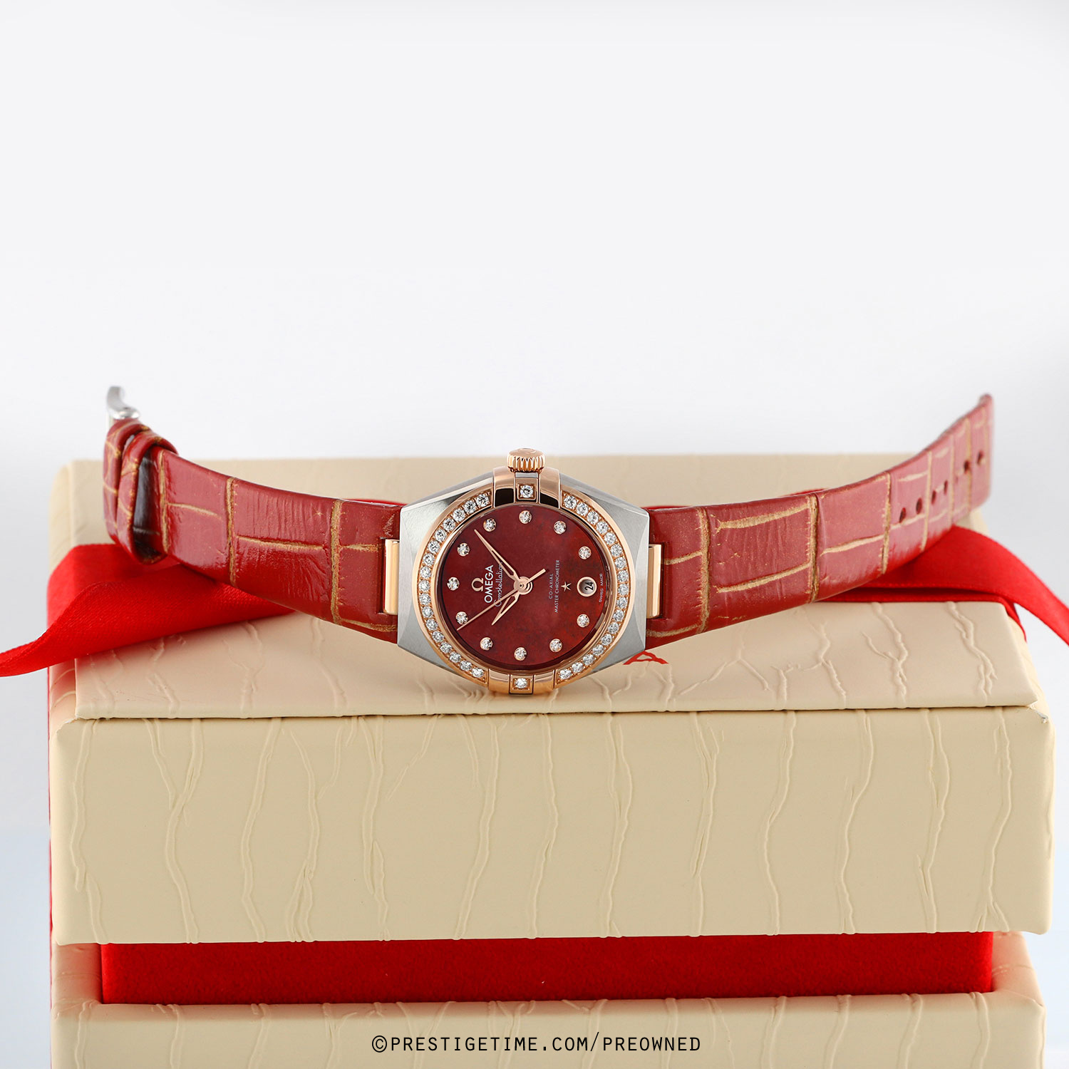 Case: Brushed & polished stainless steel case with a solid 18kt Sedna (rose) gold bezel, crown & strap lugs. Bezel set with diamonds. Natural red aventurine stone dial. Sedna gold hands. Applied Sedna gold hour markers set with diamonds. Date window at 6 o'clock.