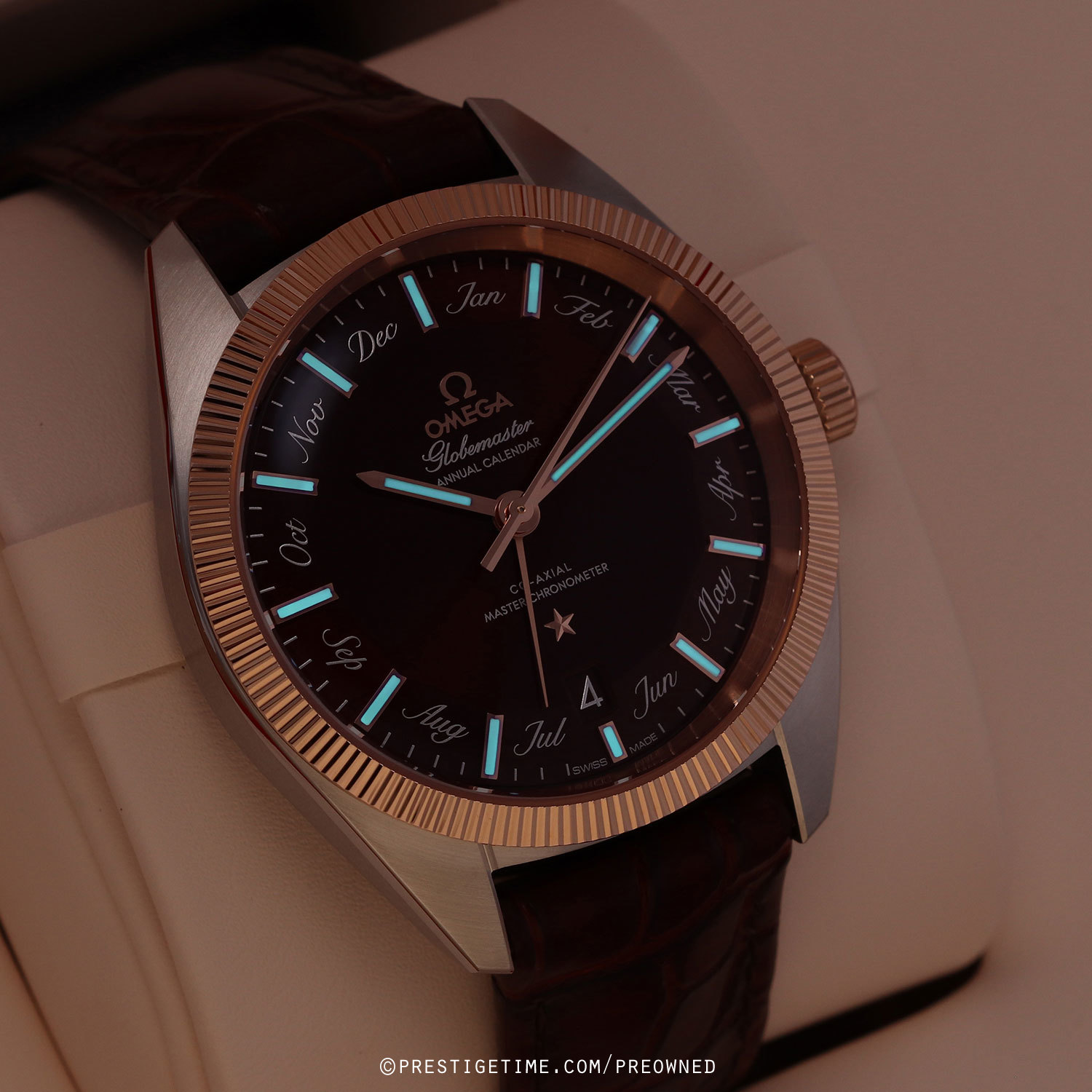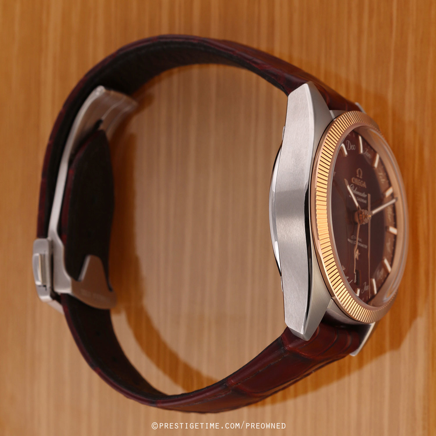 Case: Brushed stainless steel case with polished finished beveled corners & crown. Fluted 18kt Sedna-rose gold bezel & crown. Sapphire crystal case back with a medallion bearing Omega's Constellation emblem embedded at the center of the case-back crystal. Burgundy colored pie-pan dial with a fine sunray finish. Polished Sedna gold hands, the hour & minute hands with luminous fill. Applied polished Sedna gold index hour markers with luminous fill. Fine printed minute/seconds track. Date window at 6 o'clock.