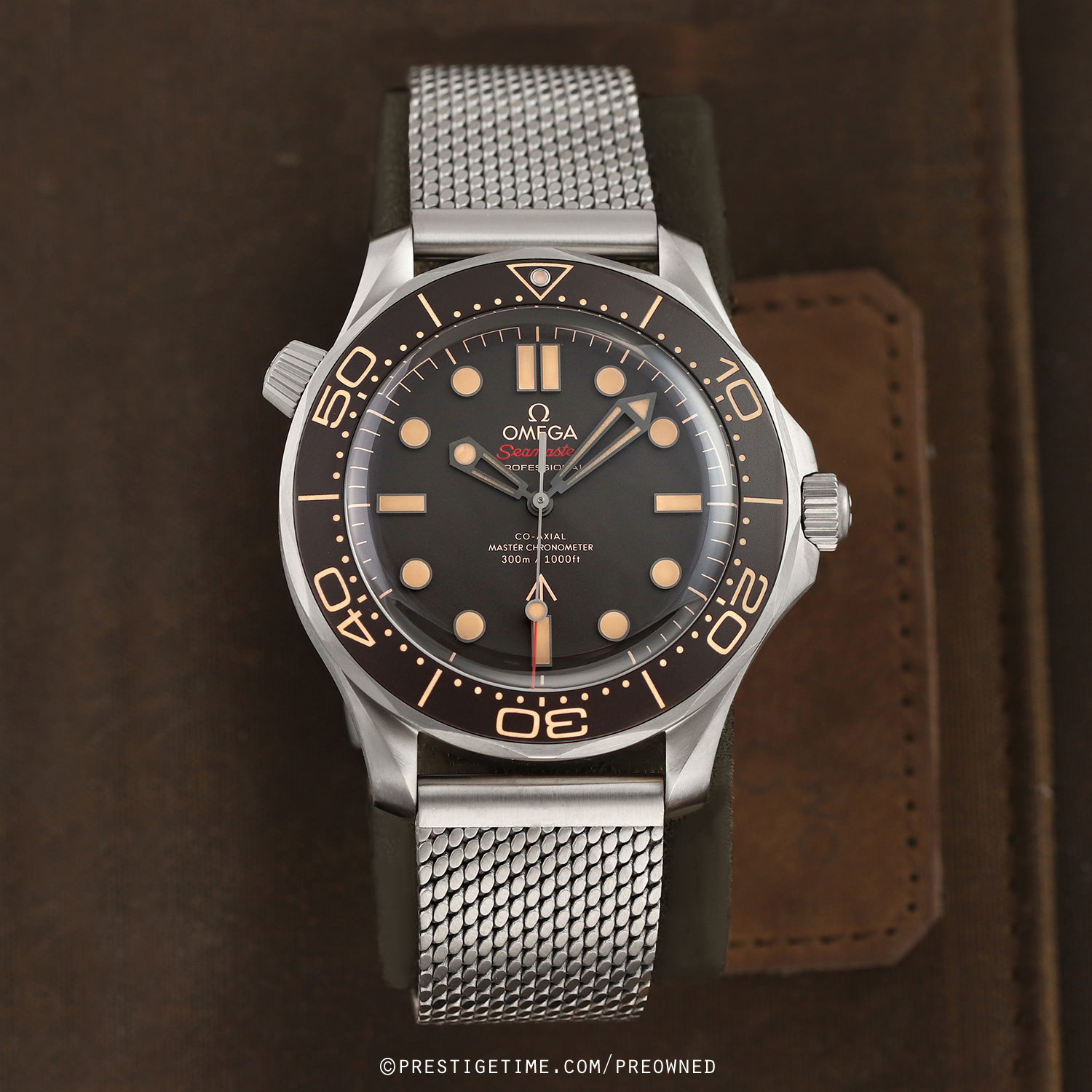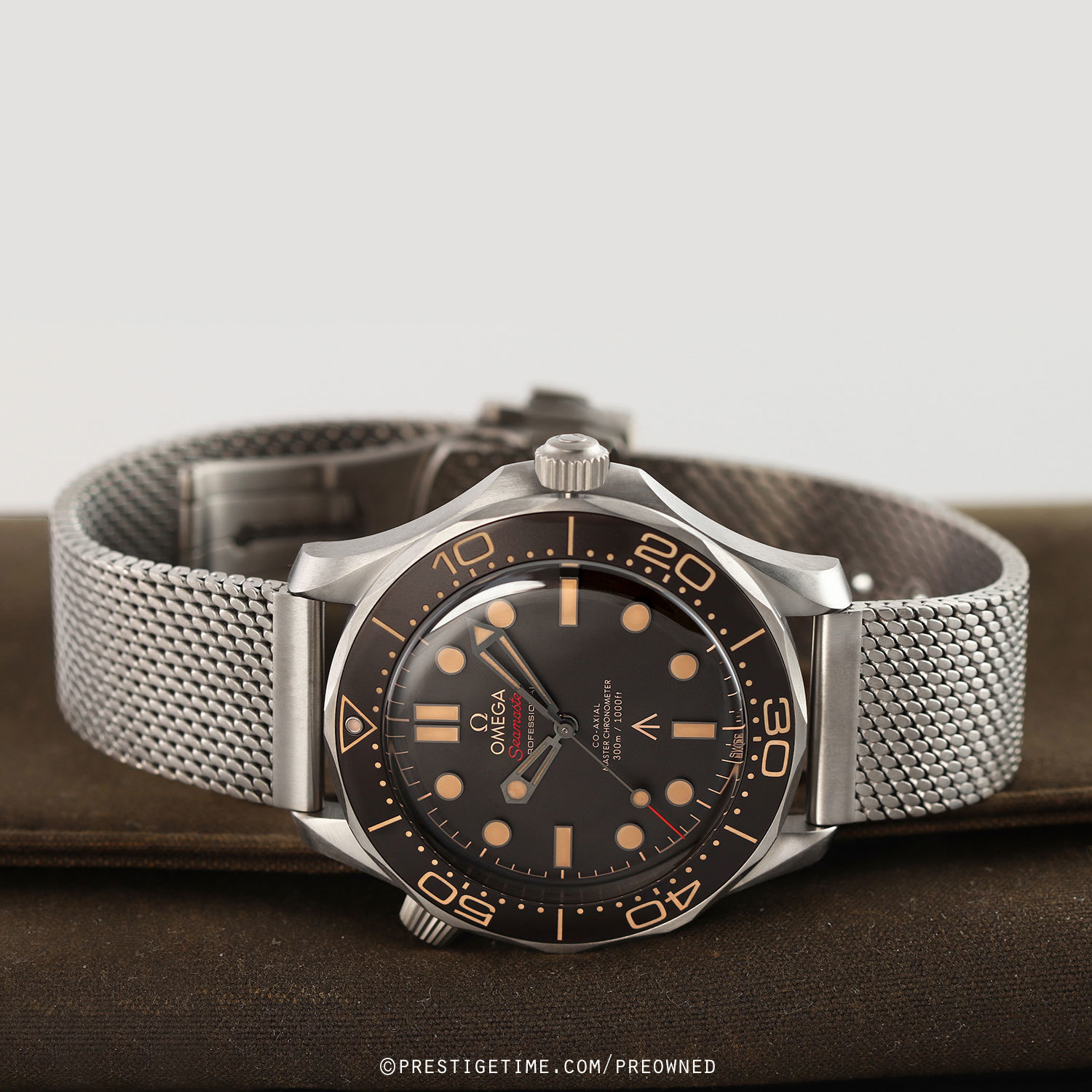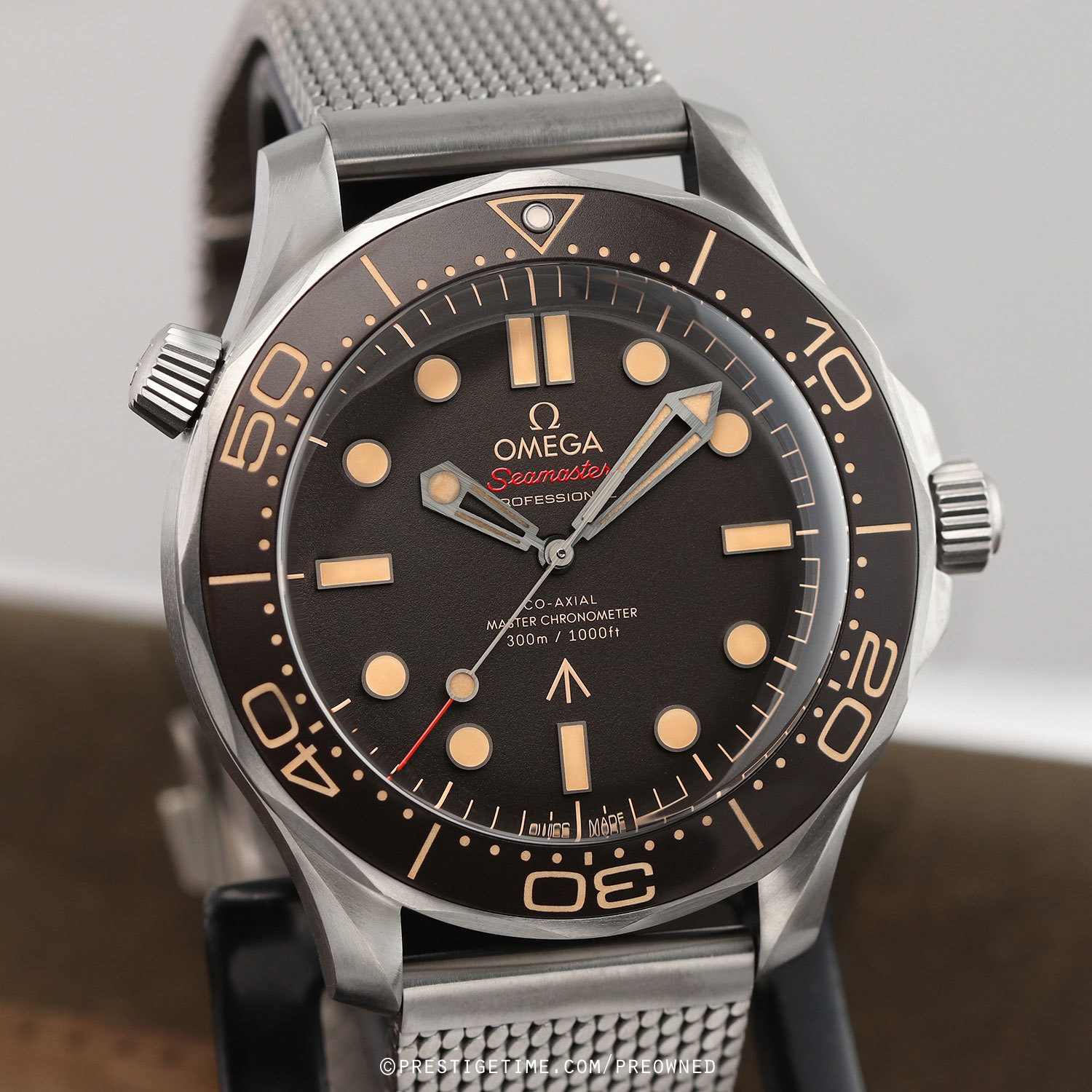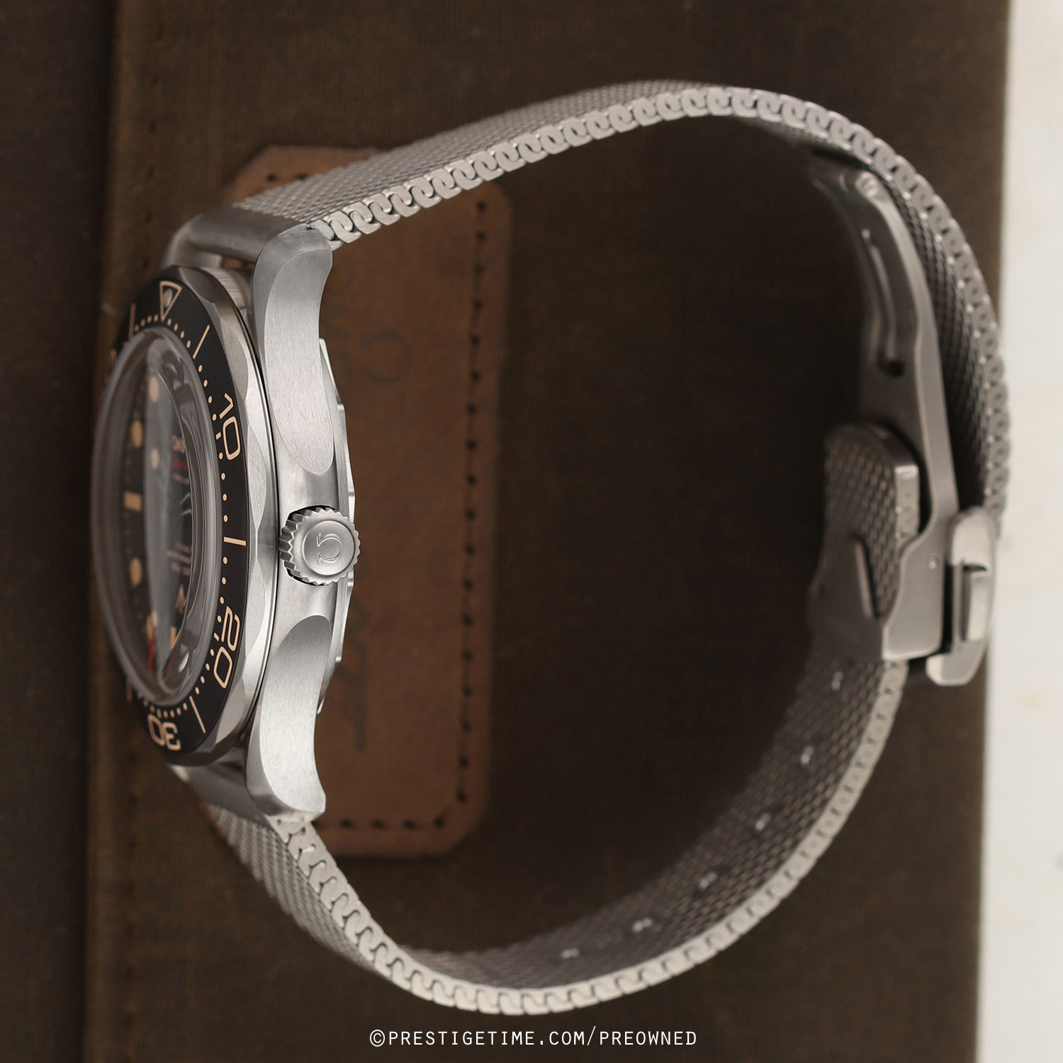 Case: Matte & brushed finished titanium case, crowns & bezel. Domed sapphire crystal. Helium escape valve at 10 o'clock. Tropical brown aluminum bezel with beige/aged colored luminous diving scale. Matte tropical brown aluminum dial. Skeletonized hour & minute hands with aged colored luminous fill. Applied hour markers with aged colored luminous fill. Fine printed minute/seconds track. Case back is oriented & aligned with the watch, thanks to Omega's patented NAIAD Lock system.