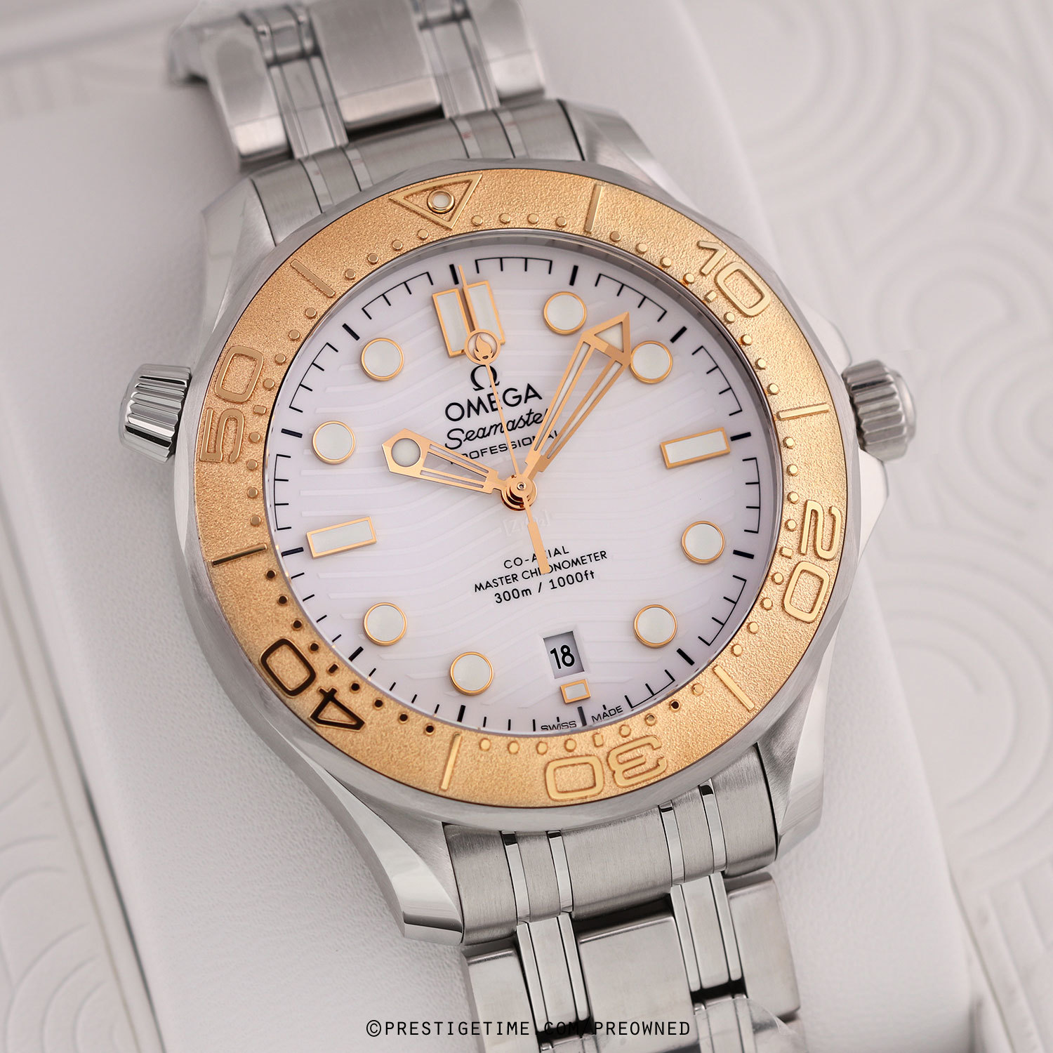 Case: Brushed & polished stainless steel case. Brushed & polished stainless steel bezel with a solid 18kt Moonshine (yellow) gold bezel insert featuring a laser-structured diving scale in positive relief and a luminous starting dot at 12 o’clock. Matte white zirconium oxide ceramic dial, with [ZrO2] engraved on the dial directly below the center hands & with polished wave pattern. Polished moonshine gold hands with luminous fill. Applied polished moonshine gold hour markers with luminous fill. Date window at 6 o'clock