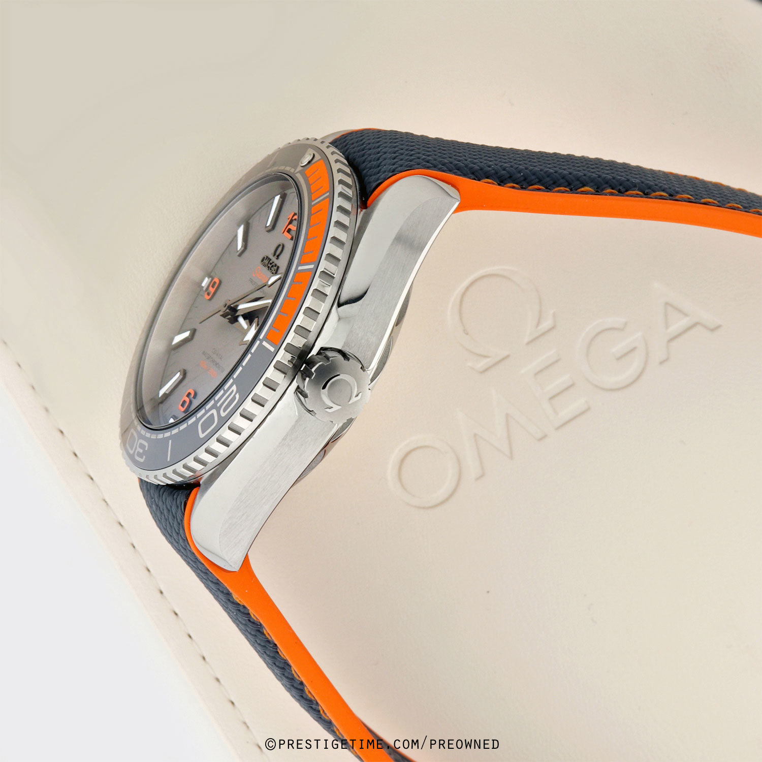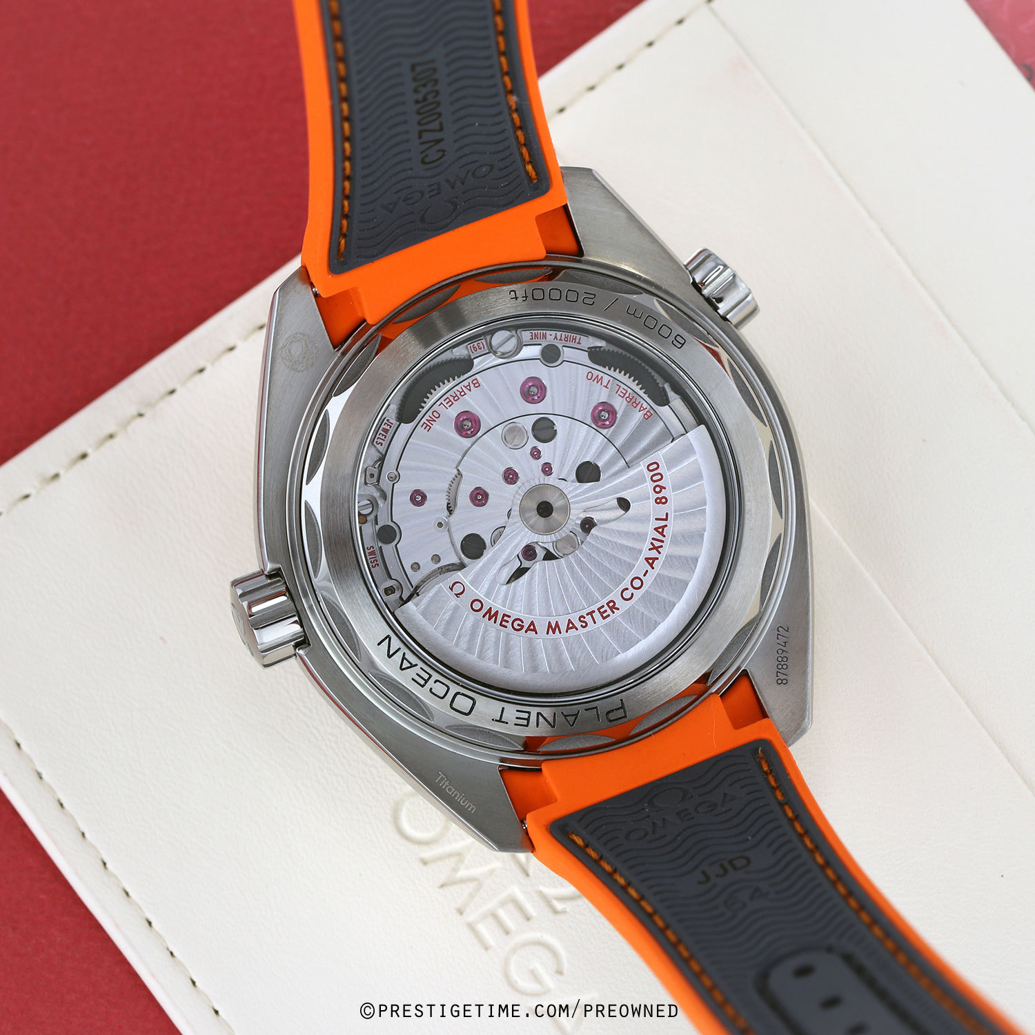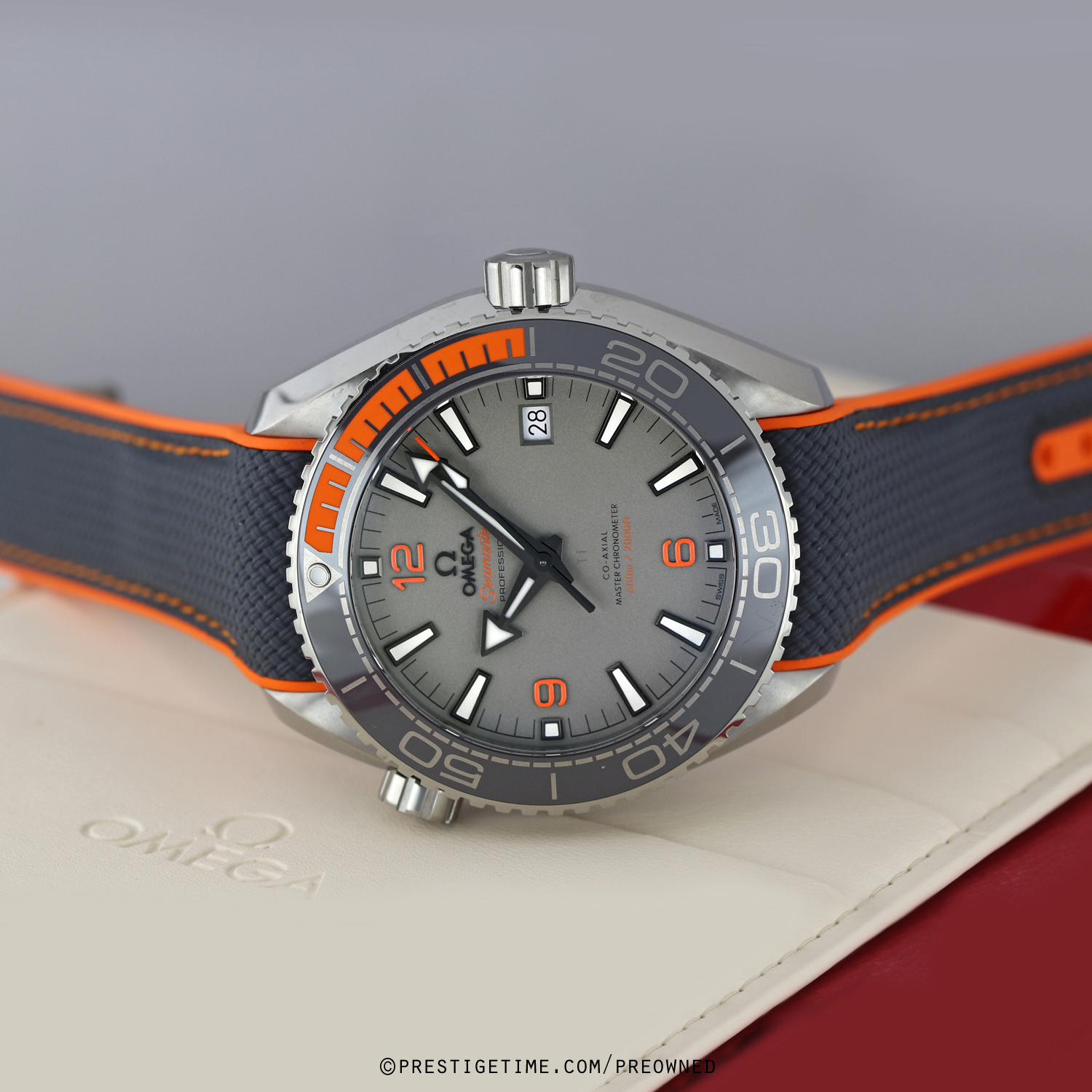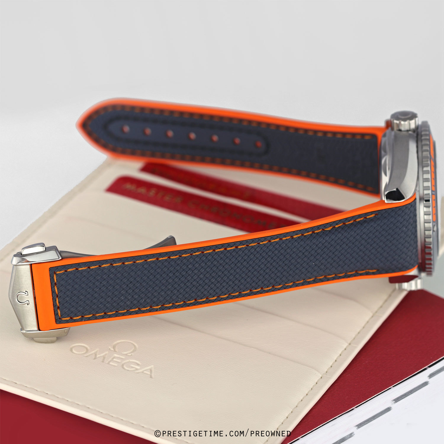 Strap: Fitte don its original grey rubber strap with an orange lining & on a titanium deployant buckle.