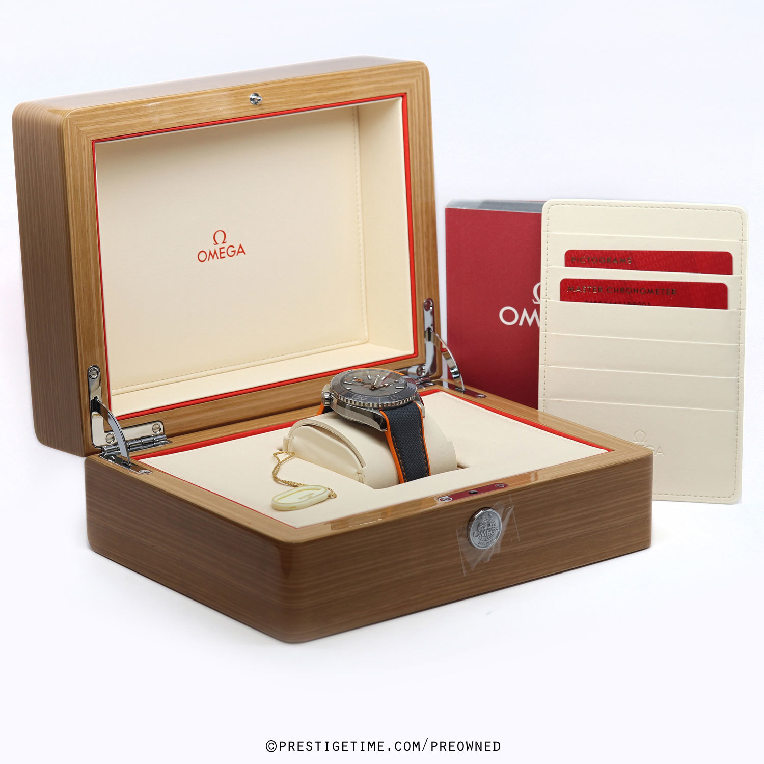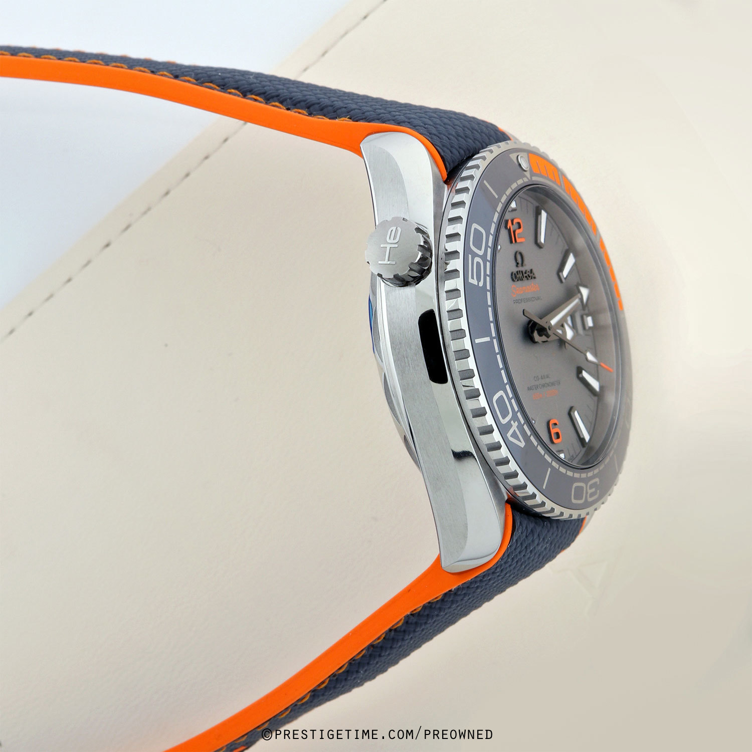 Case: Brushed titanium case with polished beveled corners. Titanium bezel with polished grey ceramic fill, orange galvanized rubber 15 minute scale & satin finished Liquidmetal diving scale markings. Helium escape valve at the 10 o'clock. Matte grey titanium dial with TI engraved directly below the center of the dial. Applied darkened polished hour marker with luminous fill. Applied orange 6, 9 & 12 hour markers.