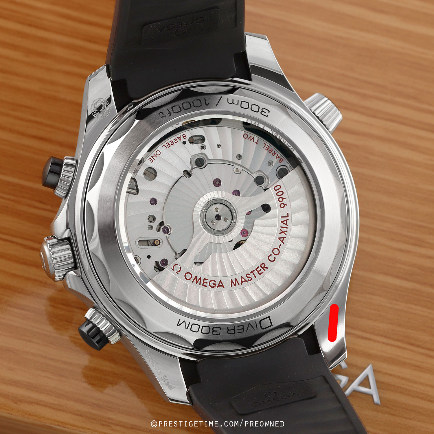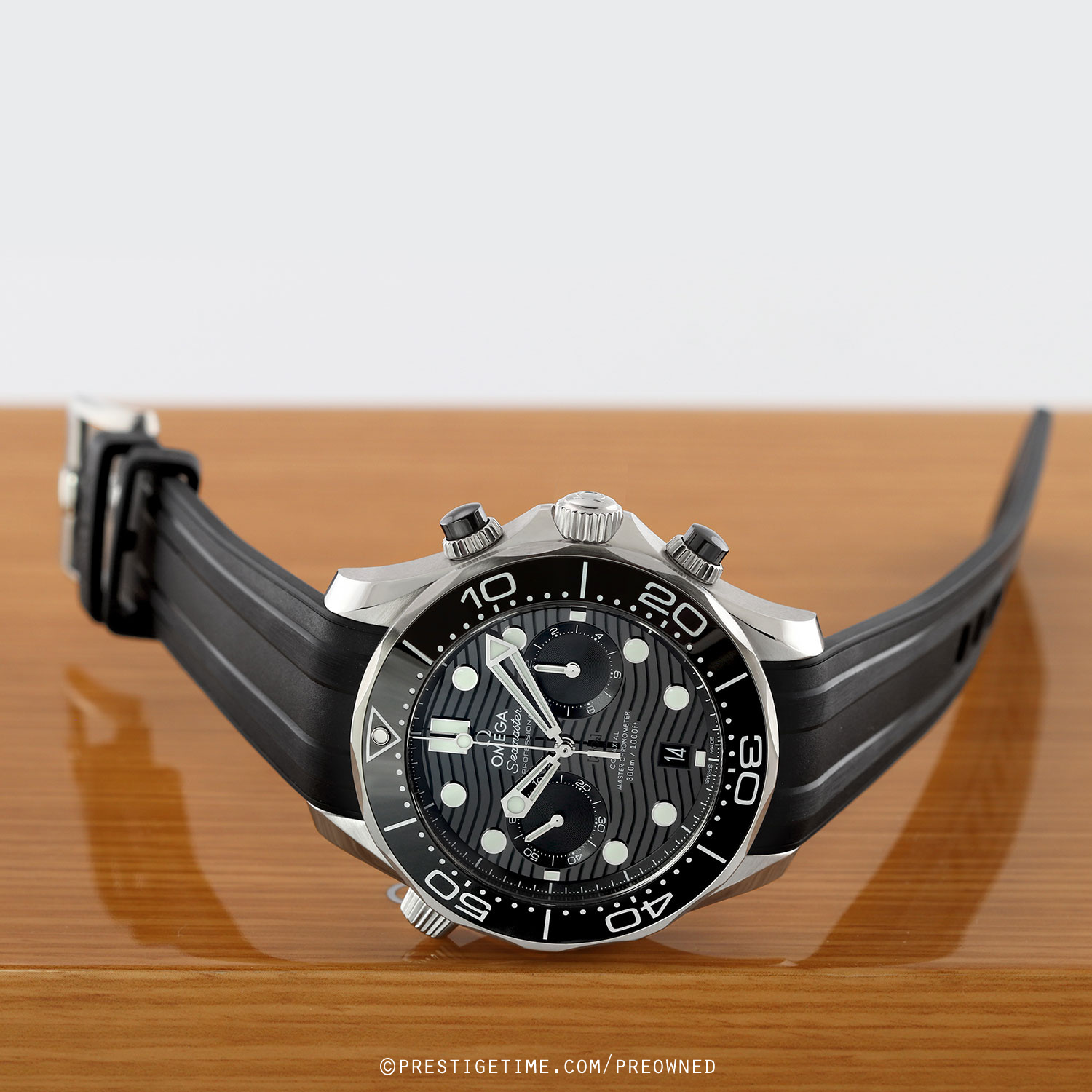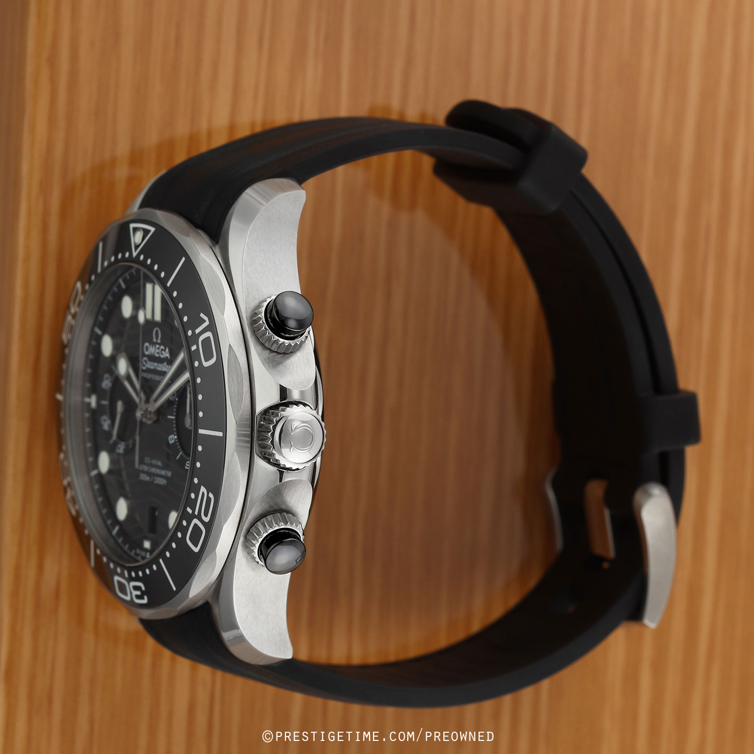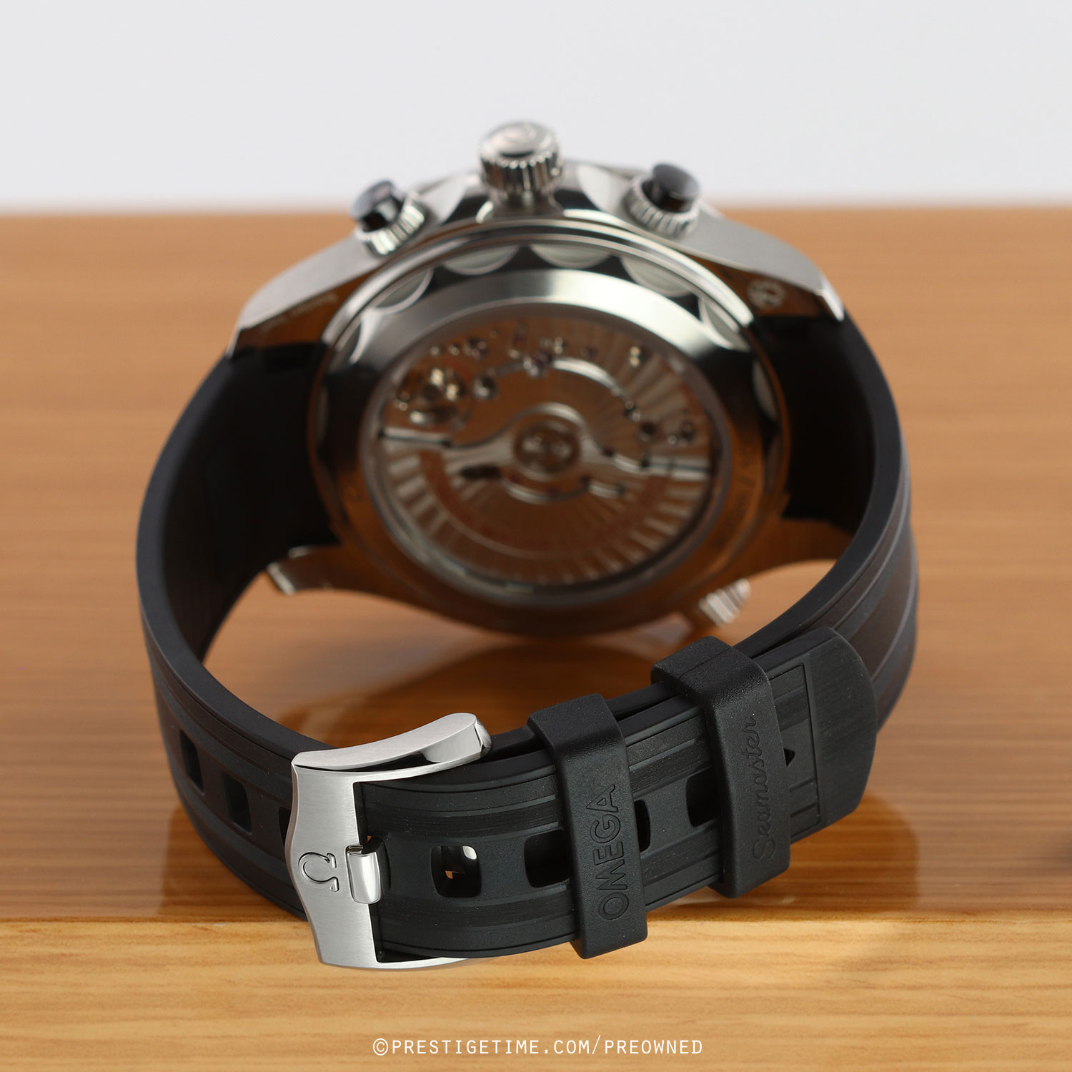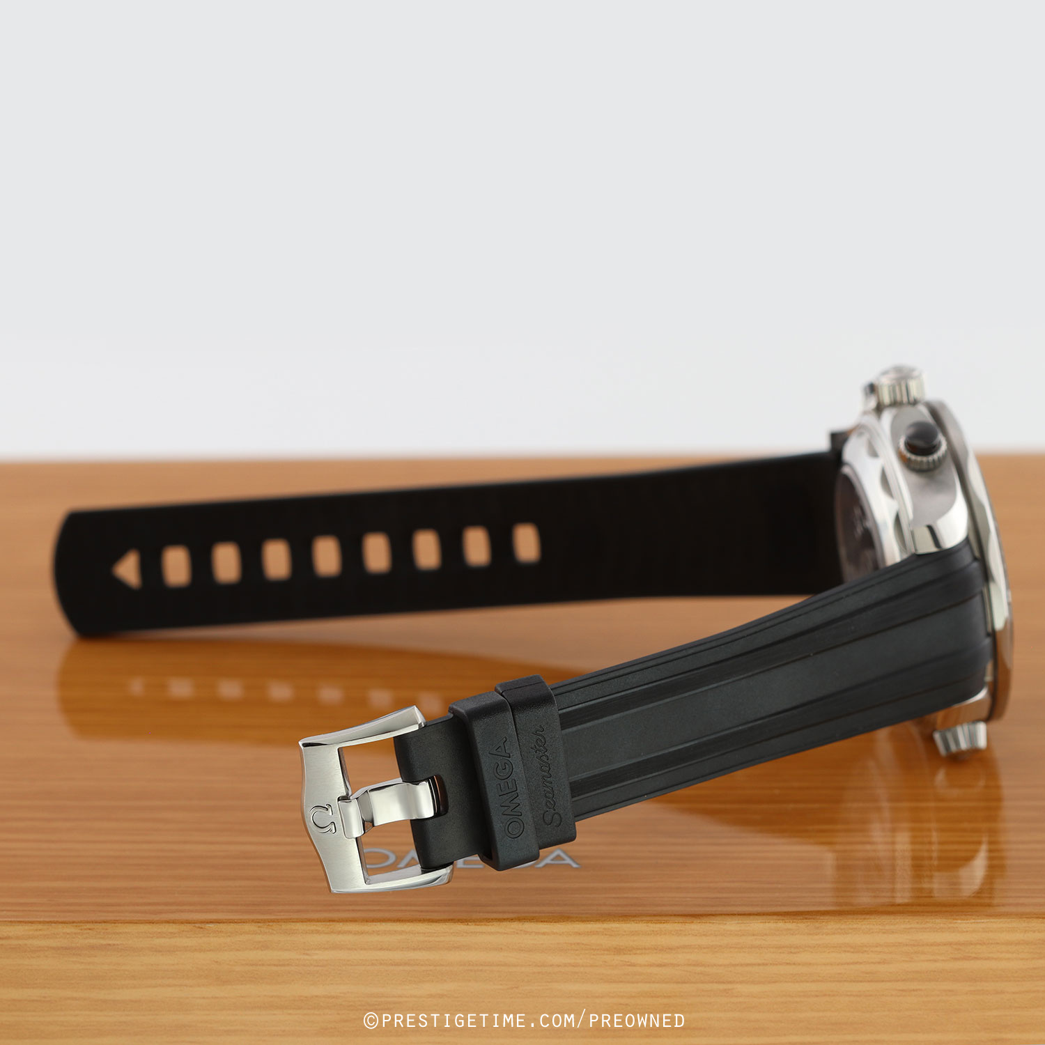 Strap: Fitted on a new Omega original black rubber strap with a stainless steel tang buckle. The strap is unworn, in brand new condition with its full wear lifespan remaining.